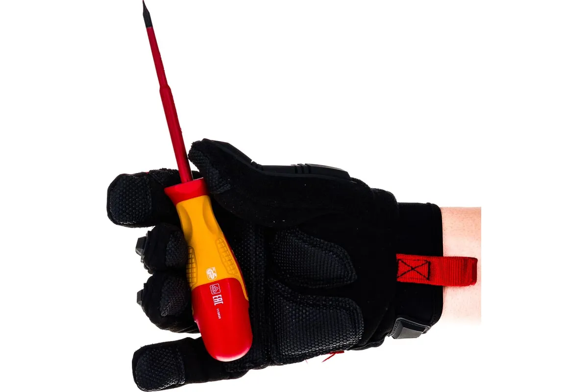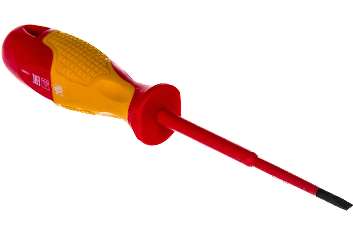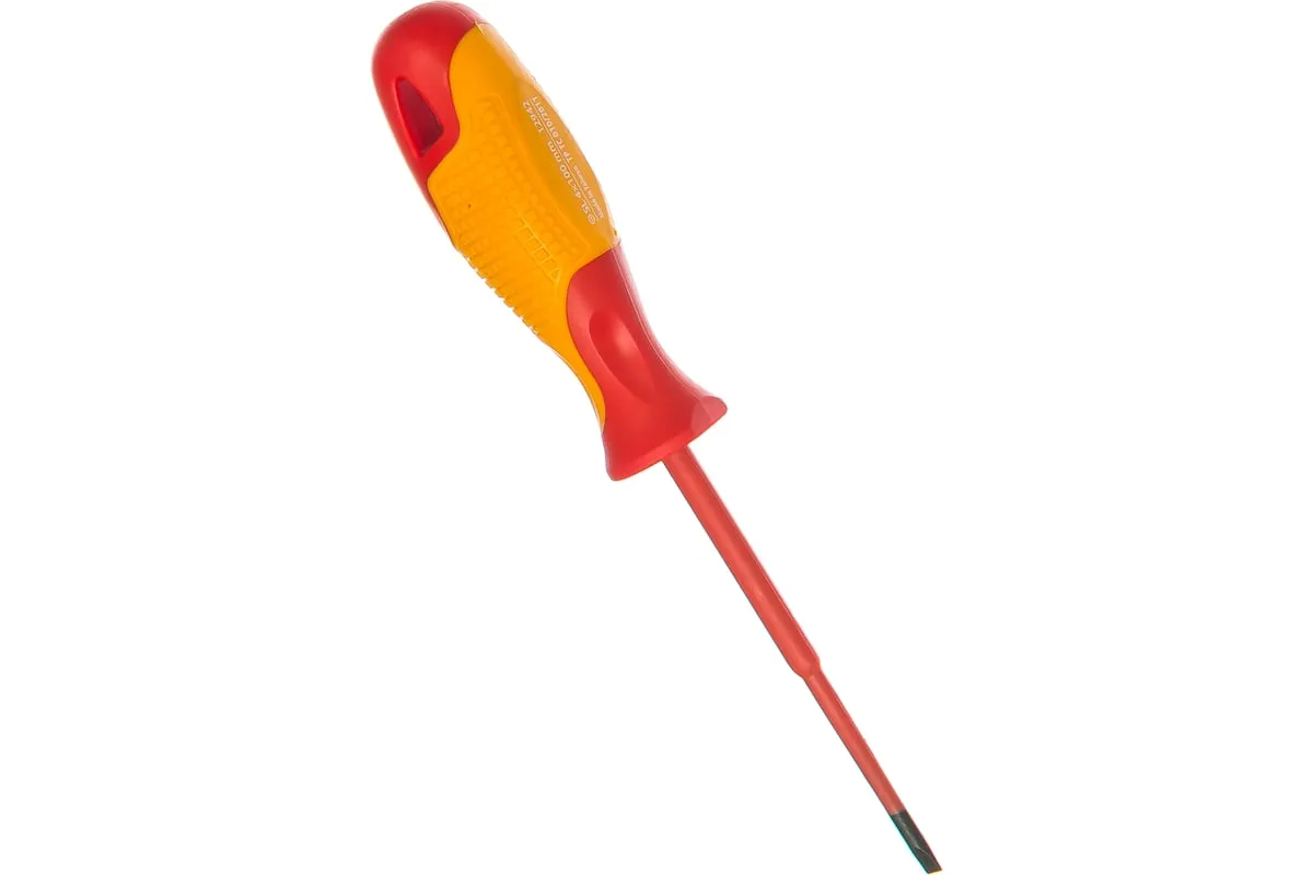 Диэлектрическая отвертка SL4х100мм, CrMo, до 1000В GROSS 12942 - монтажно-демонтажный ручной инструмент для электрика. Изделие имеет удобную рукоятку и надежную изоляцию, которая надежно защищает мастера от поражения электрическим током. Отвертка выдерживает нагрузку до 1000 Вольт.