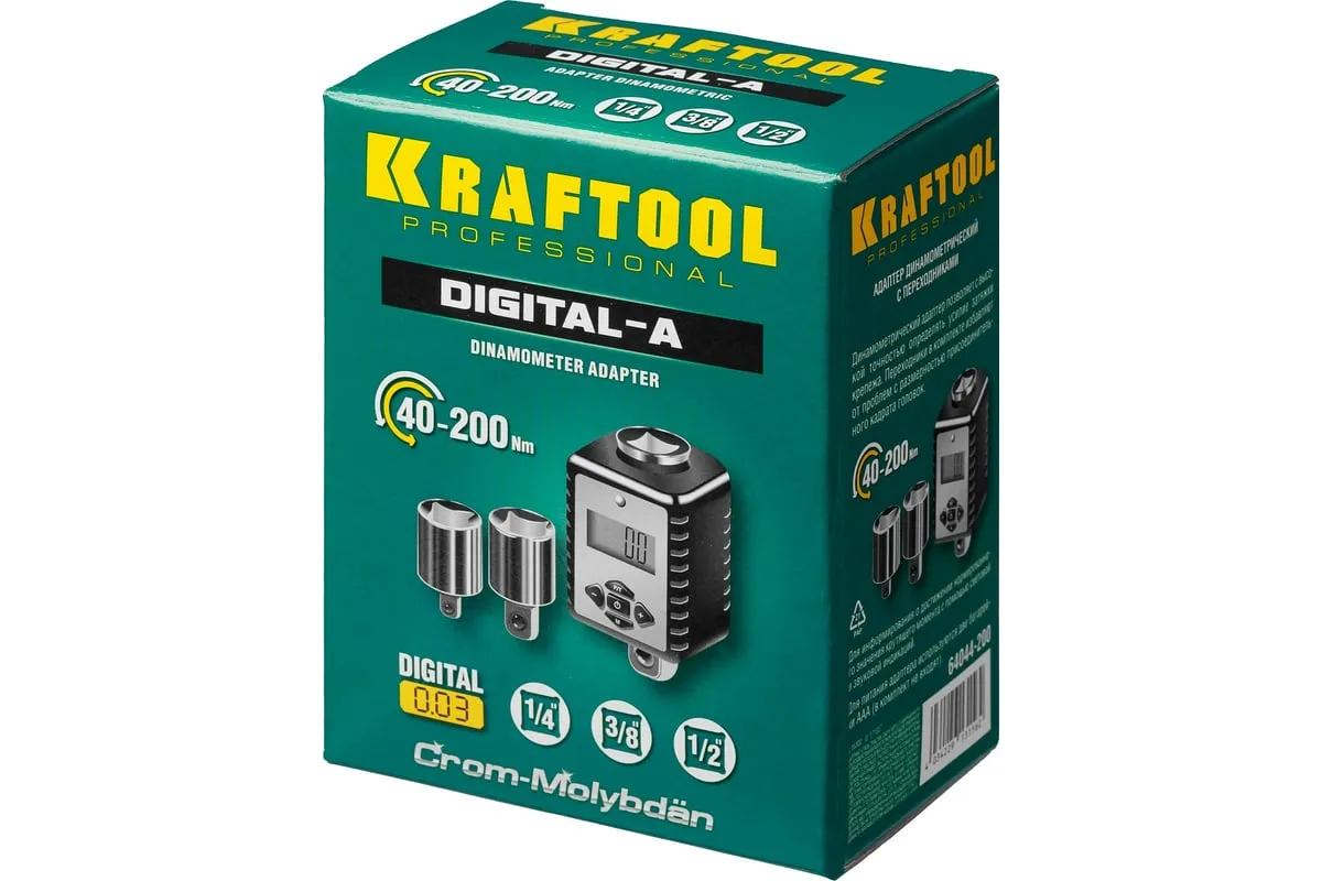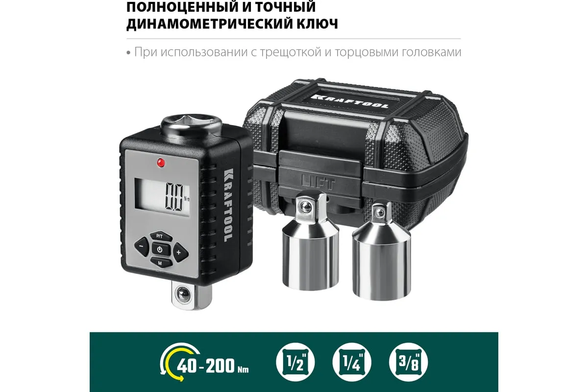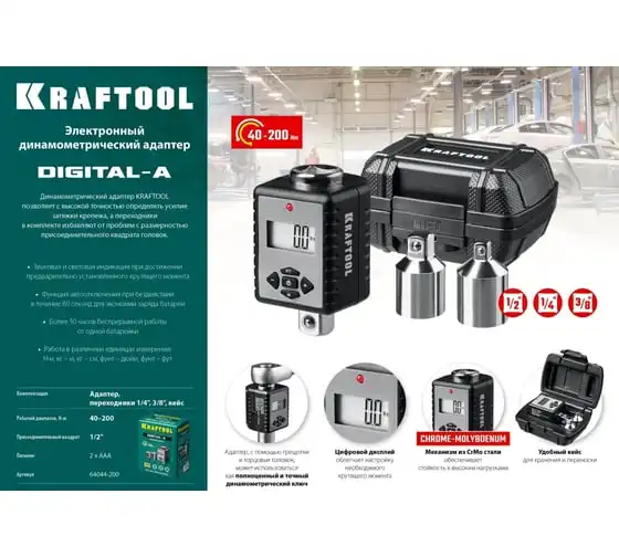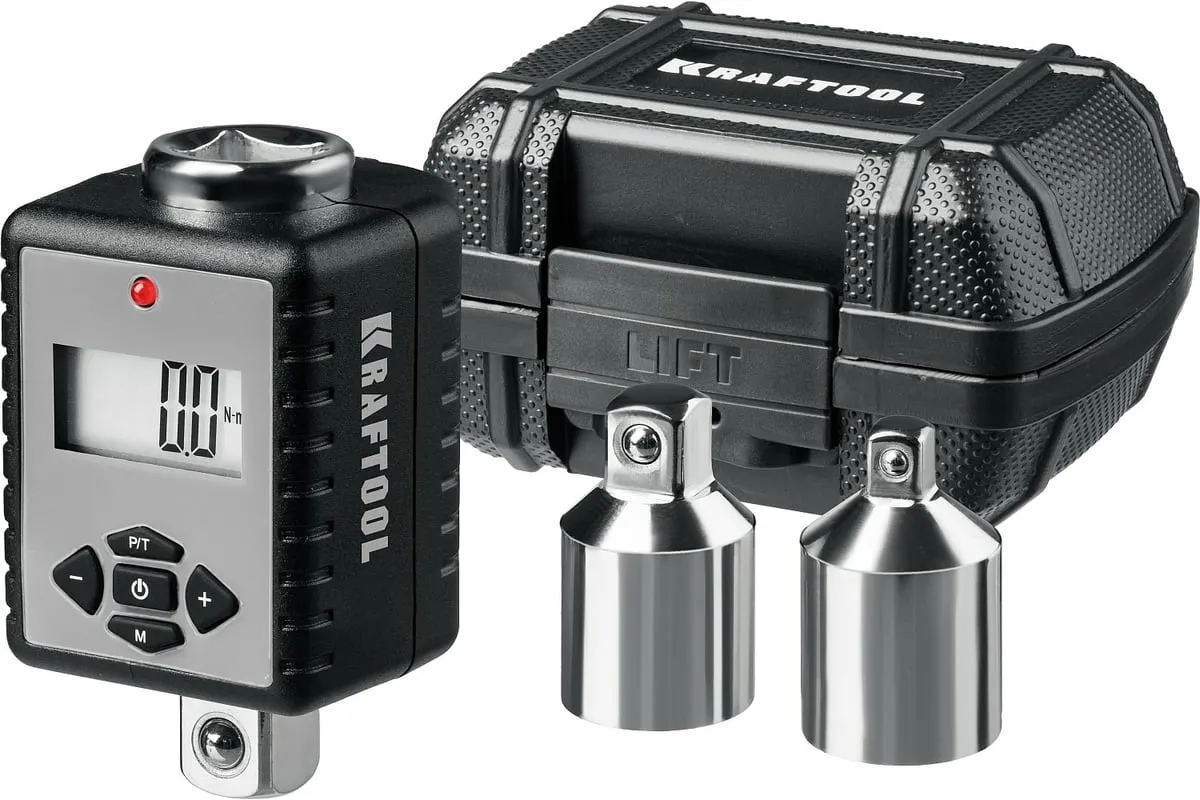 Динамометрический адаптер с переходниками KRAFTOOL Grand 1/2" 64044-200 предназначен для определения усилия затяжки крепежа. Переходники в комплекте избавляют от проблем с размерностью присоединительного квадрата головок. Цифровой дисплей облегчает выставление необходимого крутящего момента. Данный адаптер является прецизионным инструментом и помогает предотвратить поломки крепежа при работе с ним. Хромомолибденовый храповой механизм обеспечивает стойкость к высоким нагрузками при работе. Адаптер, с помощью трещотки и торцовых головок, может использоваться как полноценный и точный динамометрический ключ.