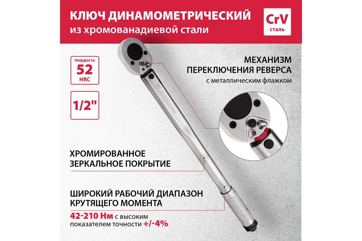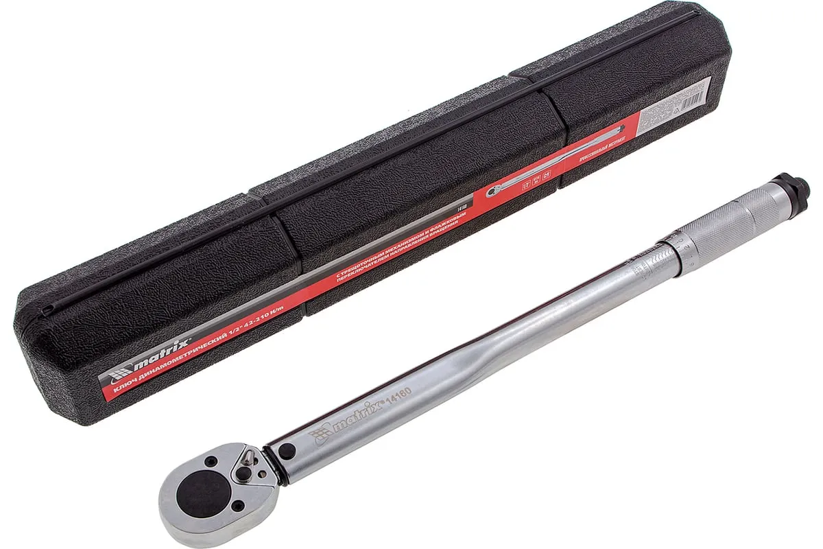 Хромированный динамометрический ключ Matrix 14160 из стали CrV, с посадочным квадратом 1/2", позволяет затягивать резьбовые соединения с максимальным усилием от 42 до 210 Нм. Щелчковый механизм контроля удобен для работы в условиях плохой видимости. Ключ используется в ремонтных мастерских, на СТО, пригодится также для самостоятельного обслуживания авто.