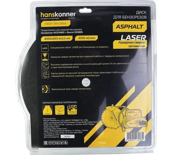 Предназначен для моделей бензорезов Hanskonner HCG7435C и Sturm! CG5835.Лазерная сварка сегментов для надежной работы с твердыми материаламиВысокое содержание алмазов и высота режущей кромки 10 мм увеличивают износостойкость и срок эксплуатации дискаКорпус диска из прочной легированной стали гарантирует стабильную работу в условиях повышенной нагрузки и высокой температурыУвеличенные пазы сегмента защищают тело диска от перегрева