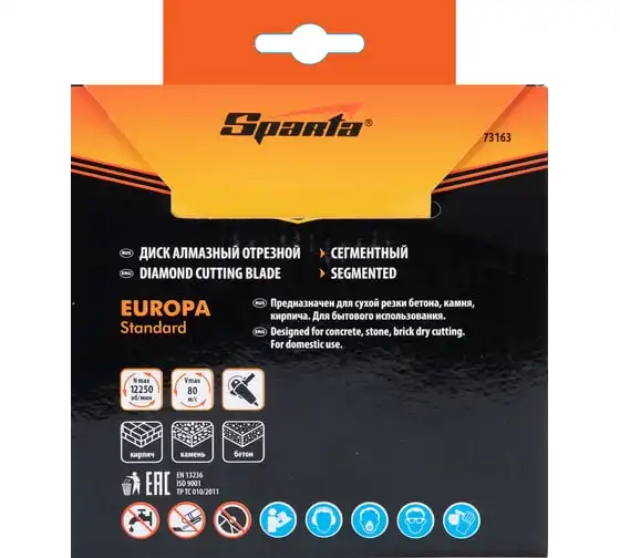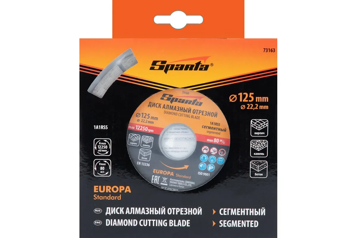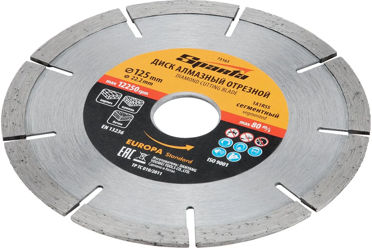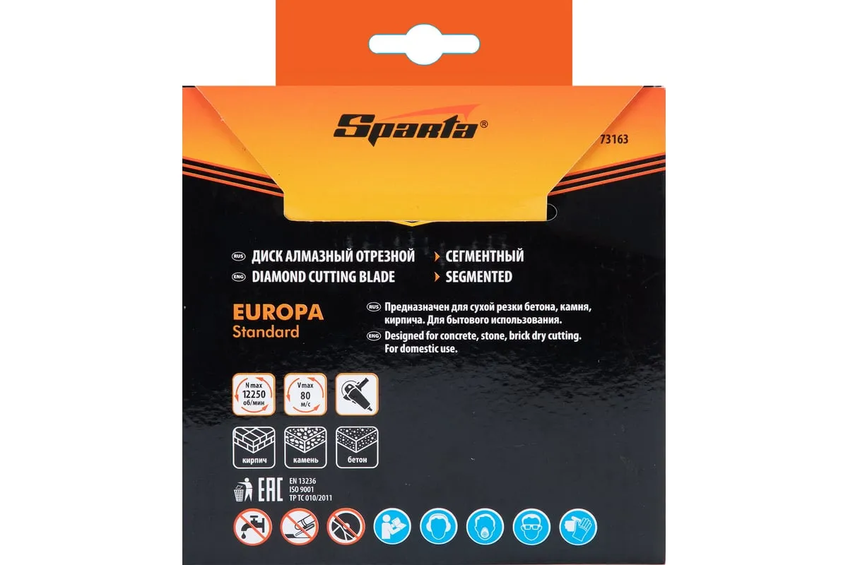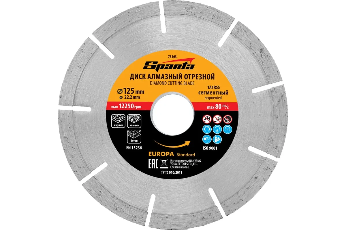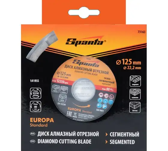 Диск алмазный отрезной сегментный EUROPA Standard 125x22.2 мм SPARTA 73163 используется при сухой резке бетона, мрамора и т.д. Алмазная крошка и оптимально подобранная связка обеспечивает высокий ресурс реза. Основание штампованное, ширина режущей части 7 мм. Внимание! Изображение товара может отличаться от реального