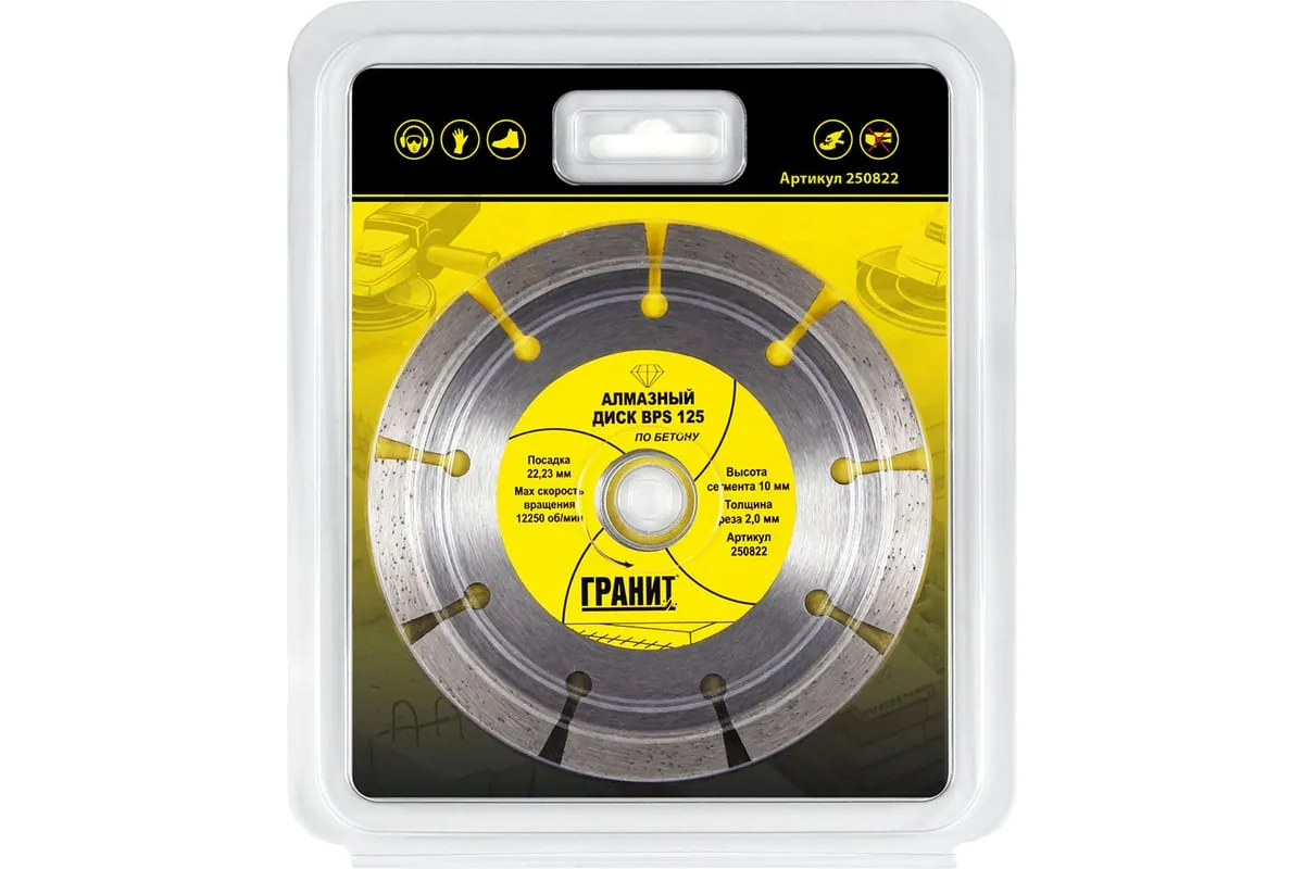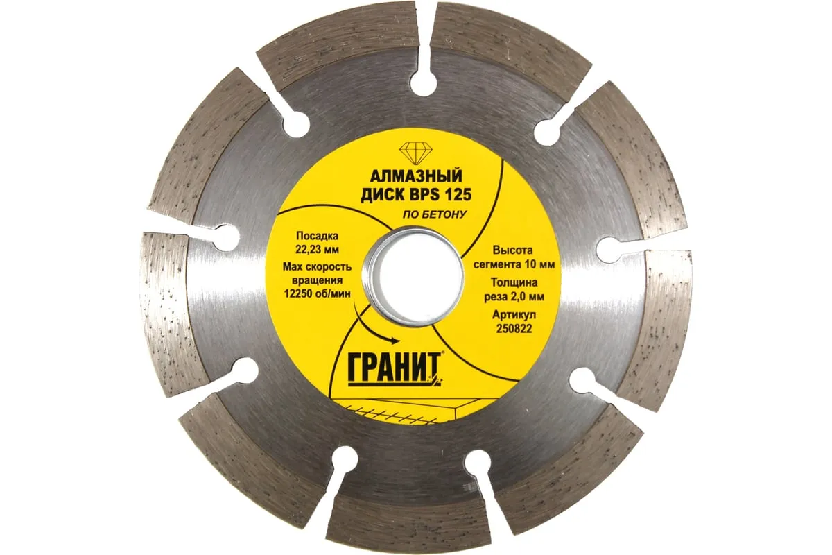 Сегментные алмазные диски ГРАНИТ BPS 250822 предназначены для работ по бетону, армированному бетону, тротуарной плитке. Высота алмазных сегментов 10 мм. Работает без охлаждения.
