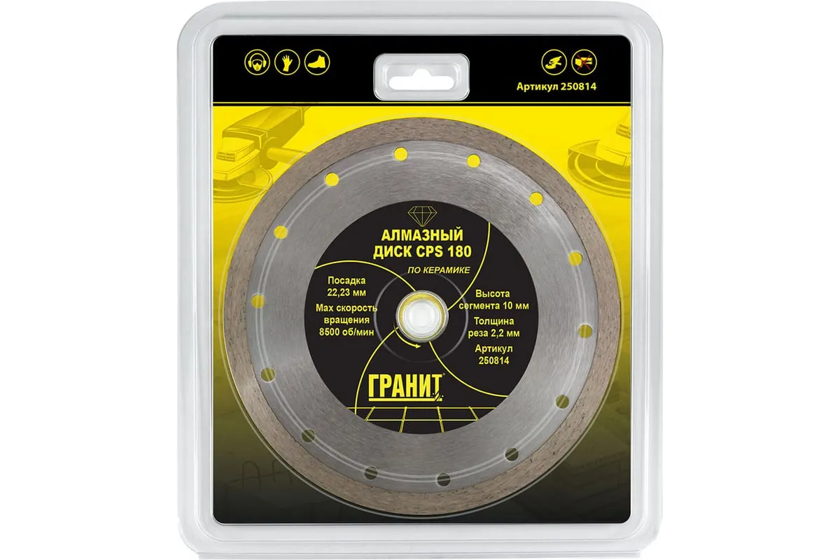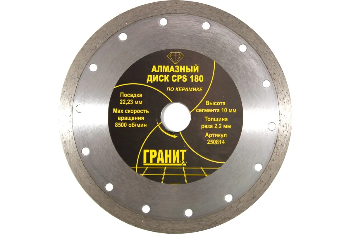 Алмазный диск ГРАНИТ CPS 250814 со сплошным сегментом предназначен для работ по керамике и керамограниту. Высота алмазных сегментов 10 мм. Работает без охлаждения.