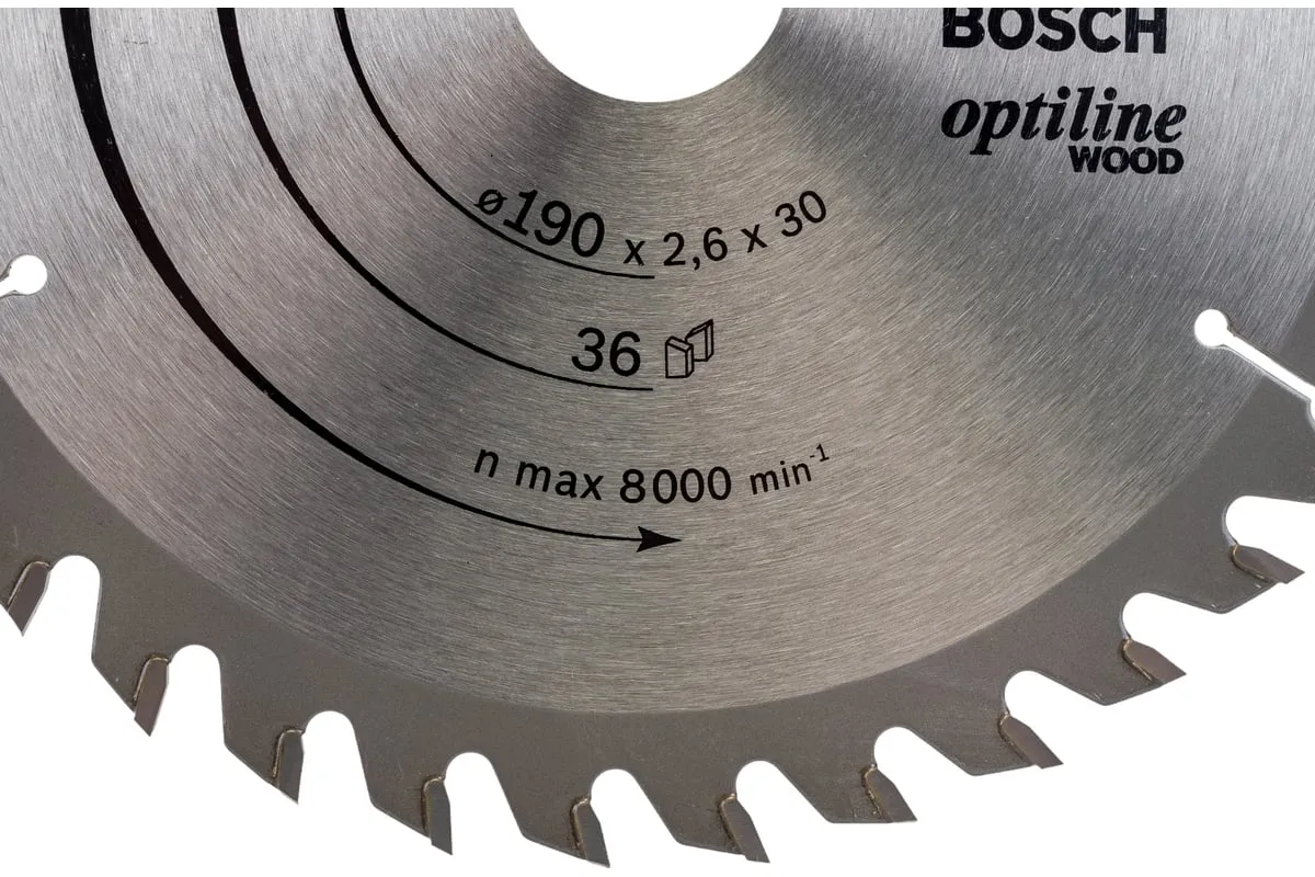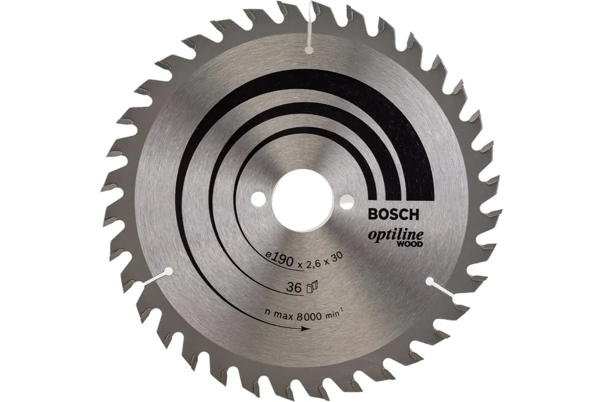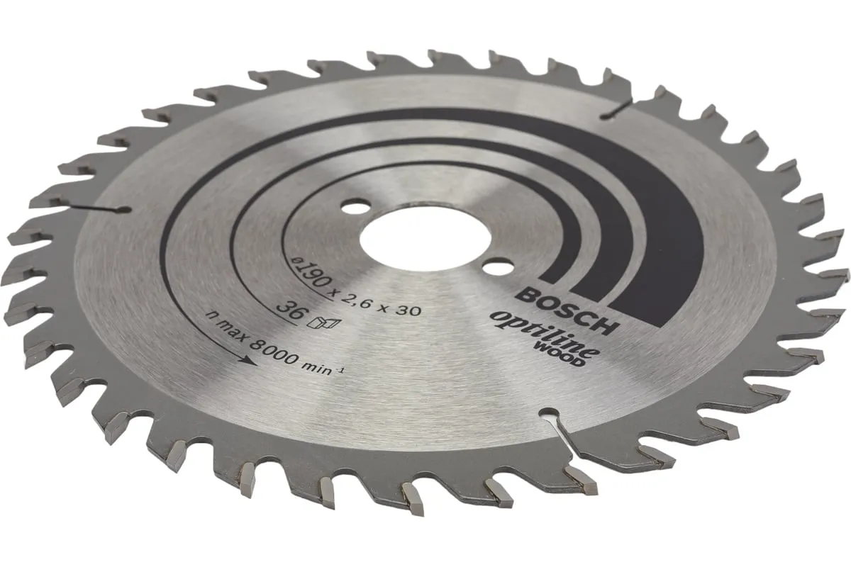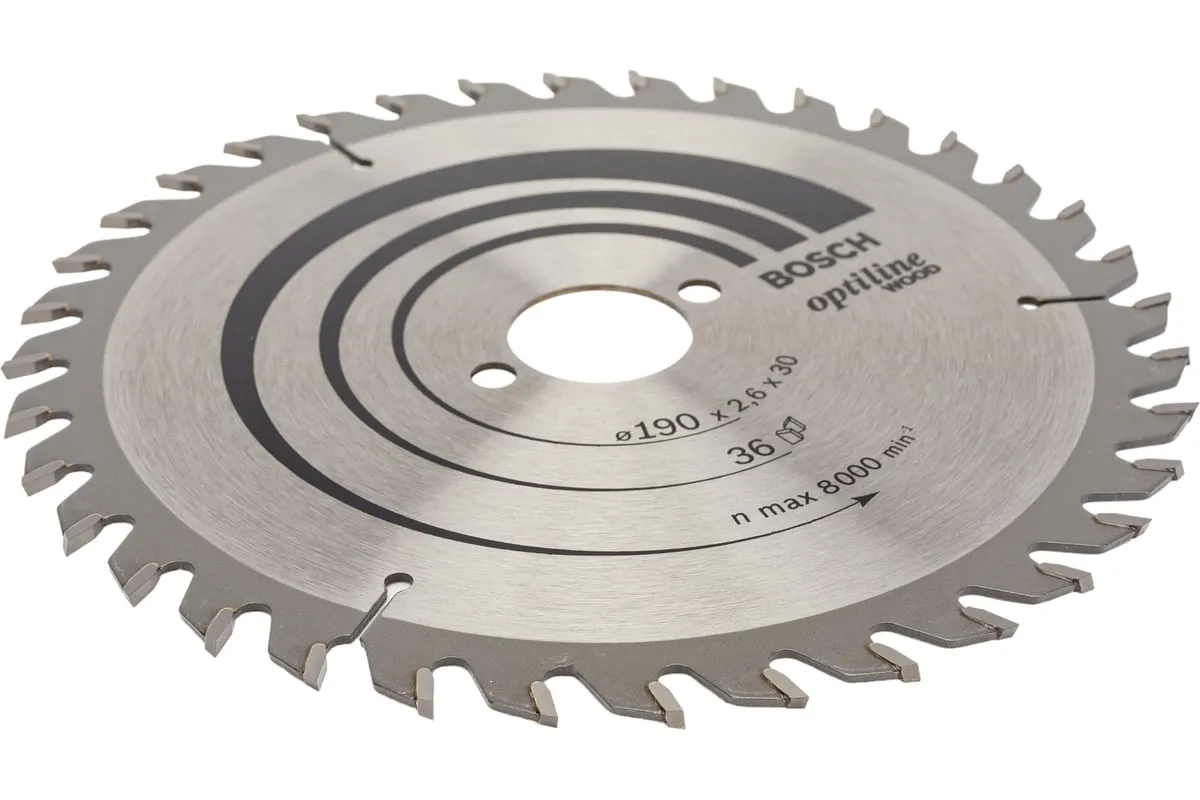 Диск для выполнения деликатного продольного и поперечного пропила. Используется при работе с мягкой и твердой древесиной, ДСП с односторонним покрытием, паркетом. Внешний диаметр – 190 мм, внутренний – 30 мм, ширина пропила – 2,6 мм, 36 зубьев. Bosch 2.608.640.616