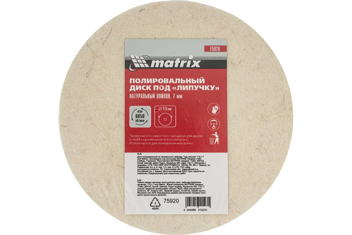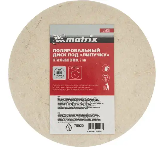 Полировальный диск под «липучку» Matrix арт. 75920 предназначен для тонких работ по металлу, стеклу, камню, пластмассе. Он устанавливается на полировальные машины, углошлифовальные машинки или дрели совместно с опорной тарелкой (насадкой) диаметром 115 мм. Диск изготовлен из натурального войлока, оптимального для полировки материалов, сглаживания микротрещин, придания поверхности блеска, в том числе после обработки мелкозернистым абразивом.