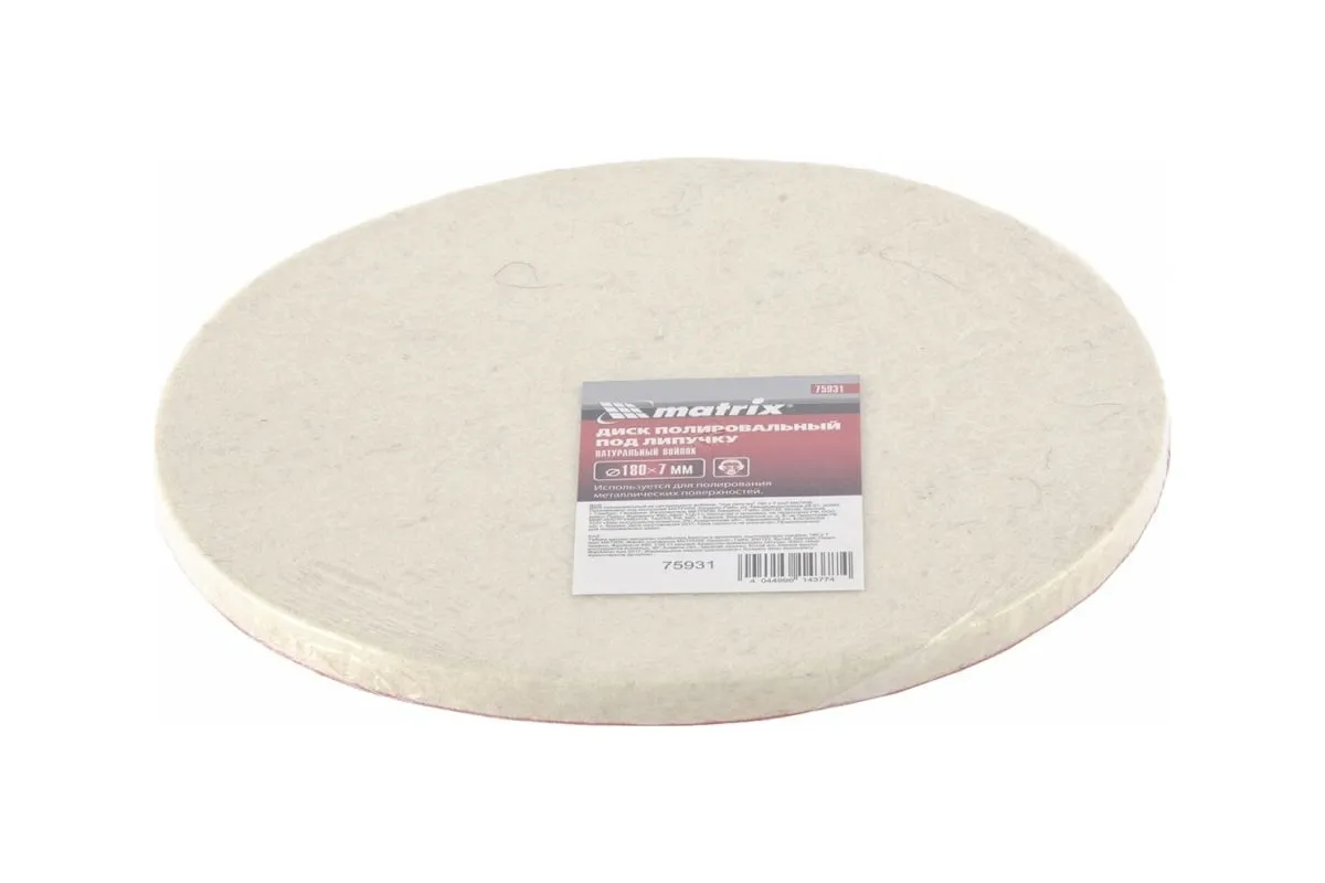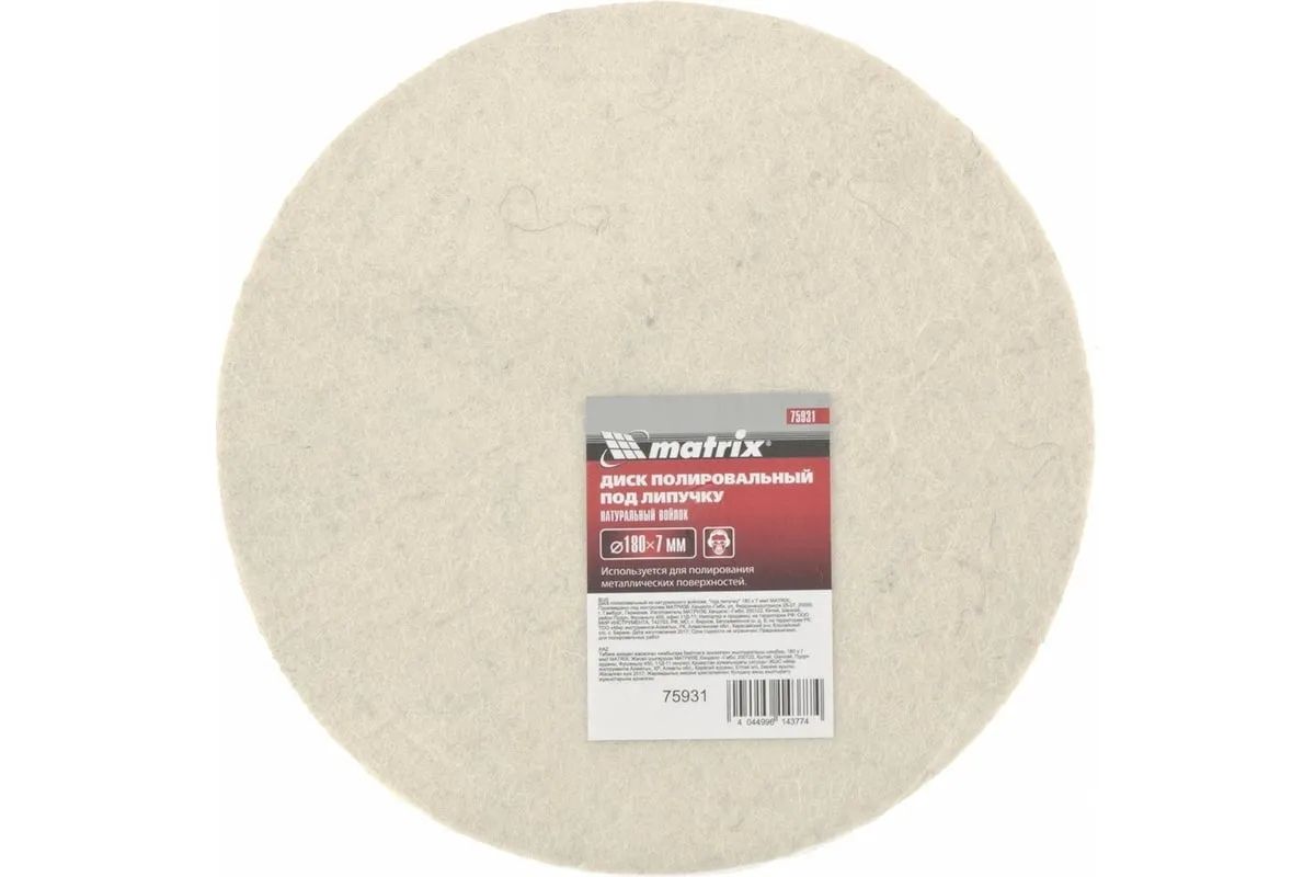 Полировальный диск под «липучку» Matrix арт. 75931 предназначен для тонких работ по металлу, стеклу, камню, пластмассе. Он устанавливается на полировальные машины, углошлифовальные машинки или дрели совместно с опорной тарелкой (насадкой) диаметром 180 мм. Диск изготовлен из натурального войлока, оптимального для полировки материалов, сглаживания микротрещин, придания поверхности блеска, в том числе после обработки мелкозернистым абразивом.