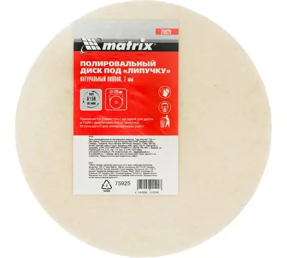 Полировальный диск под «липучку» Matrix арт. 75925 предназначен для тонких работ по металлу, стеклу, камню, пластмассе. Он устанавливается на полировальные машины, углошлифовальные машинки или дрели совместно с опорной тарелкой (насадкой) диаметром 125 мм. Диск изготовлен из натурального войлока, оптимального для полировки материалов, сглаживания микротрещин, придания поверхности блеска, в том числе после обработки мелкозернистым абразивом.