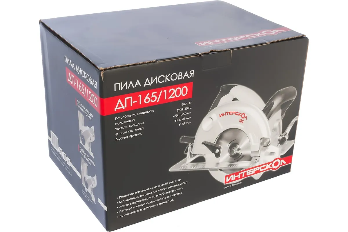 Дисковая пила Интерскол ДП-165/1200 96.1.0.00 предназначена для распиловки на глубину до 55 мм разнообразных материалов (фанера, ламинат, доски). Пила оснащена двигателем мощностью 1200 Вт и диском диаметром 165 мм. Пила отличается простотой и точностью настройки. Благодаря специальному рычажку можно отрегулировать угол реза. Основная рукоятка пилы оснащена резиновой накладкой, обеспечивающей надежное удержание инструмента во время работы.