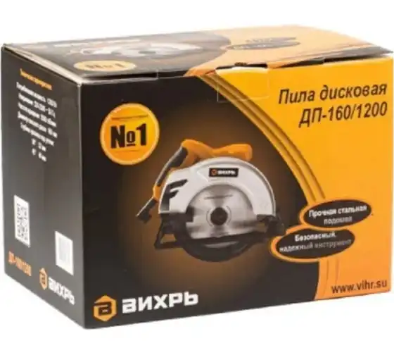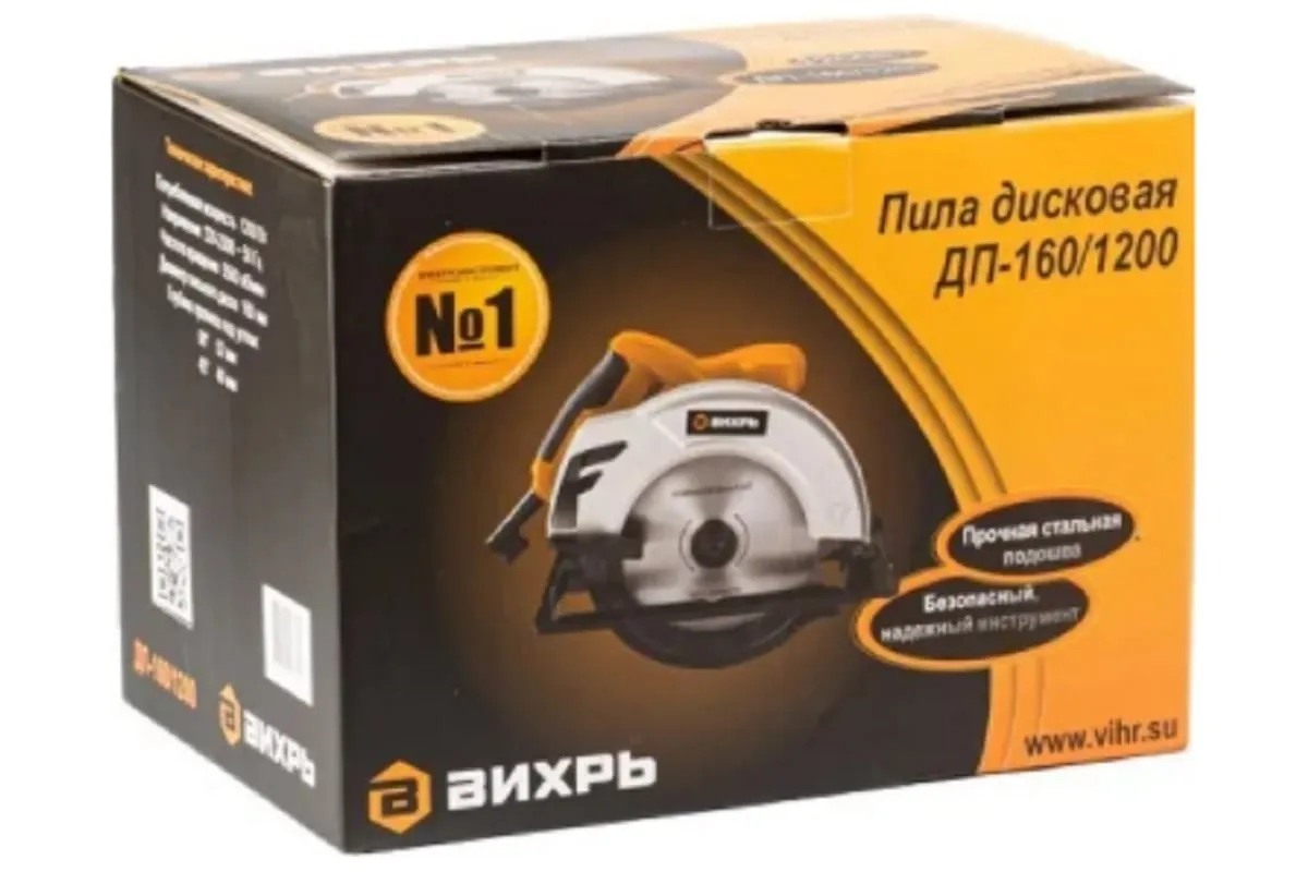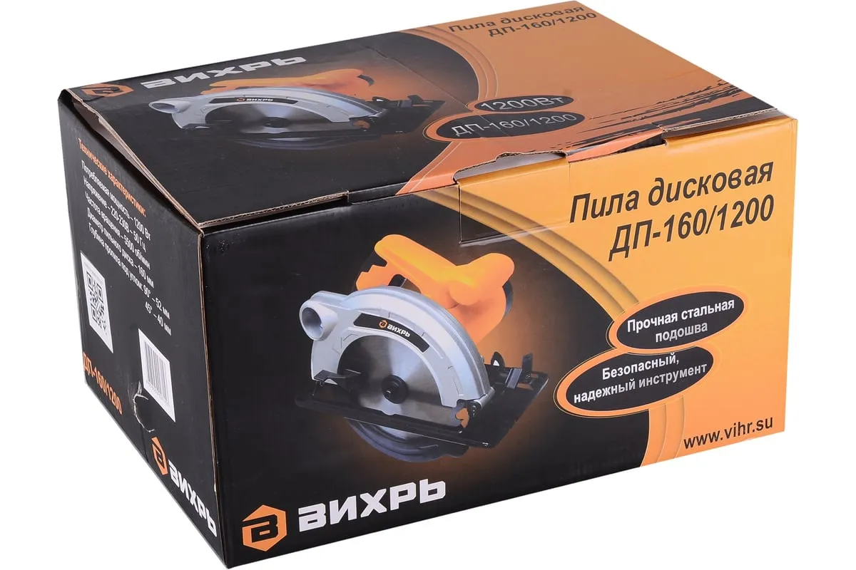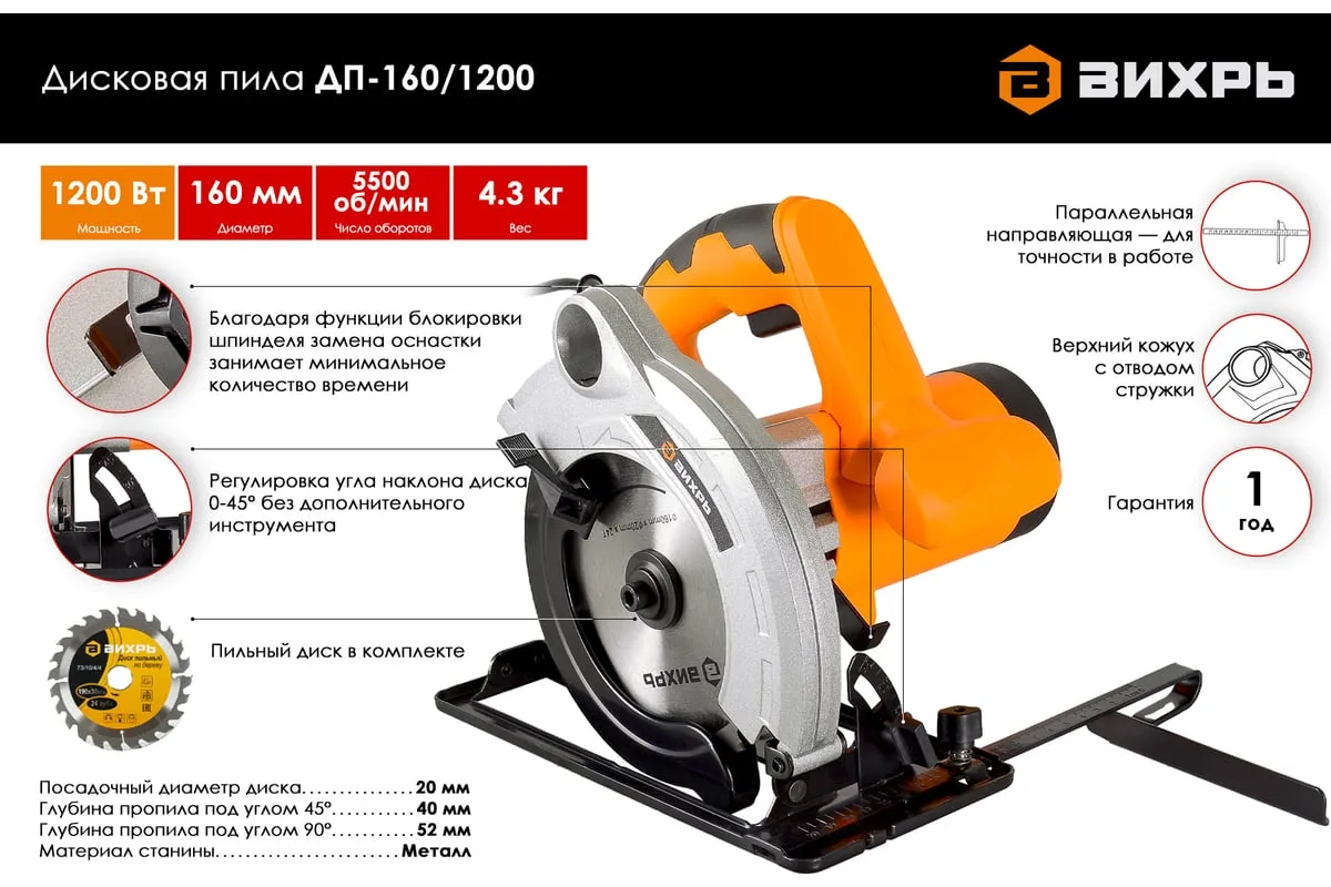 Вихрь ДП-160/1200 — это компактная дисковая пила для бытового использования. Электродвигатель мощностью 1200 Вт позволяет производить продольные и поперечные распилы изделий из древесины. Размер пильного диска составляет 160 мм. Он способен набирать скорость вращения до 5500 об/мин. Максимальная глубина пропила зависит от угла наклона пилы во время работы. При 45° она равна 40 мм, при 90° - 52 мм.