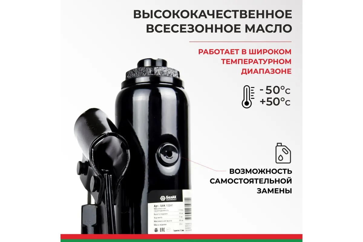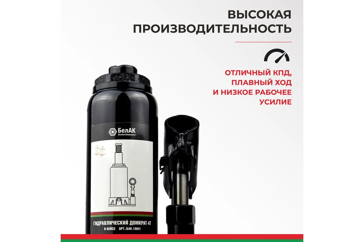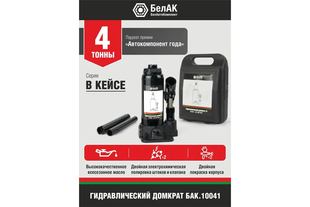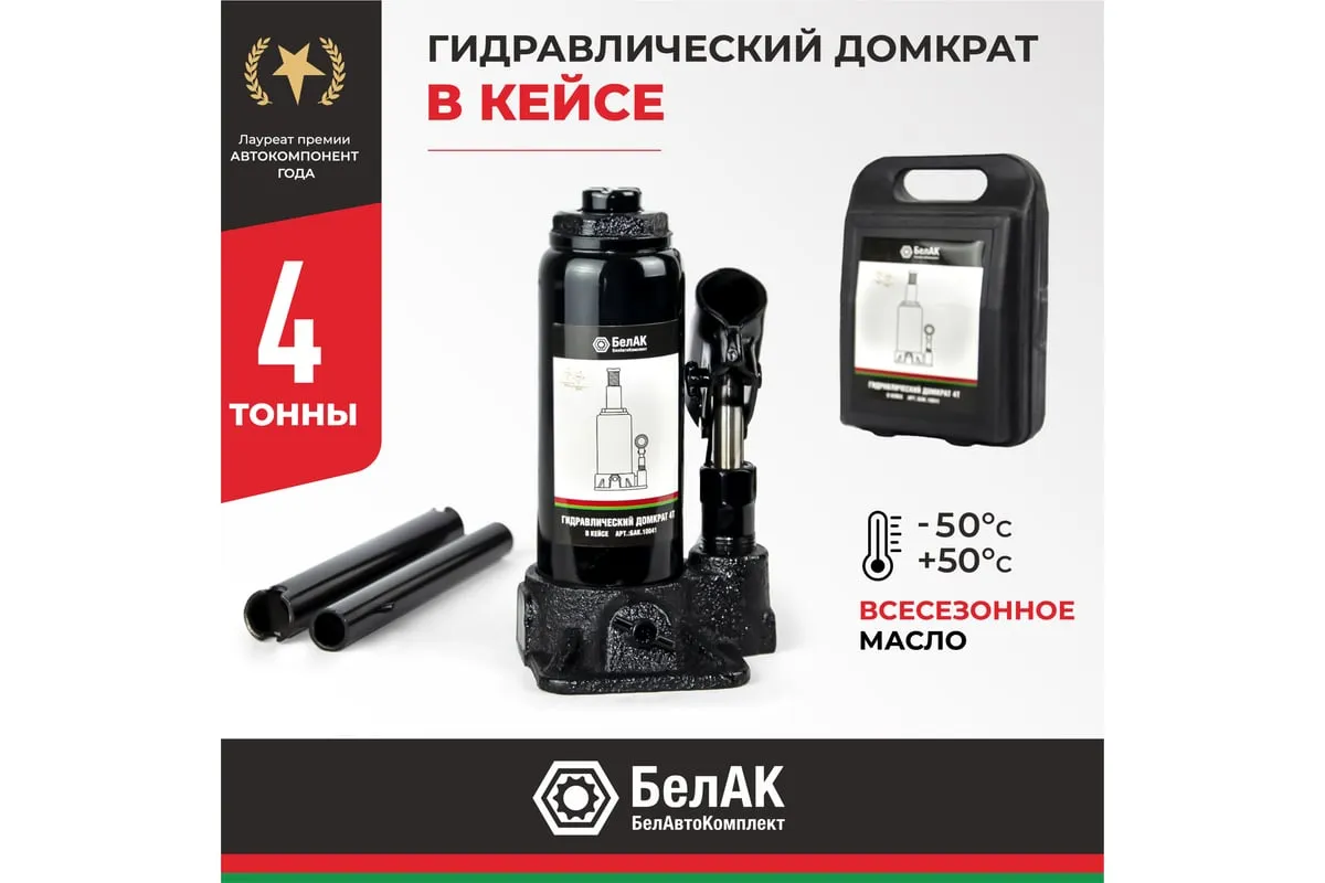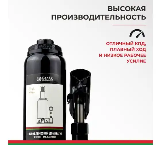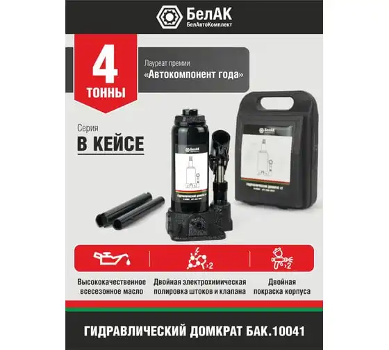 В комплект входит надежный морозостойкий и ударопрочный кейс, который обеспечит удобное и безопасное хранение инструмента. Эта модель домкрата "БелАК" идеально подойдет для ремонтно-монтажных работ с автомобилем, строительства и подъема небольших строений.