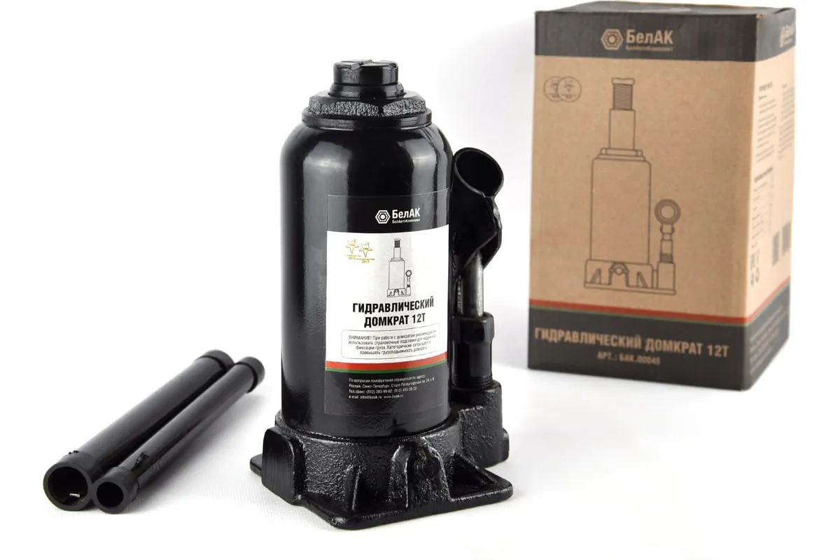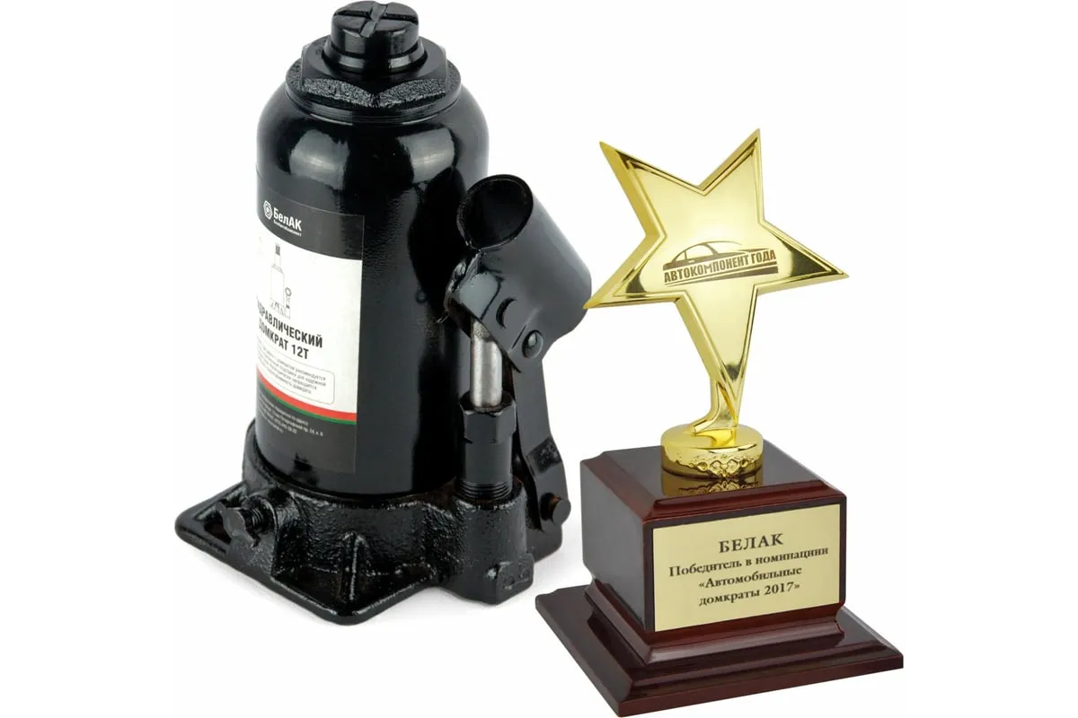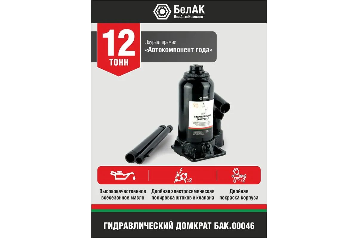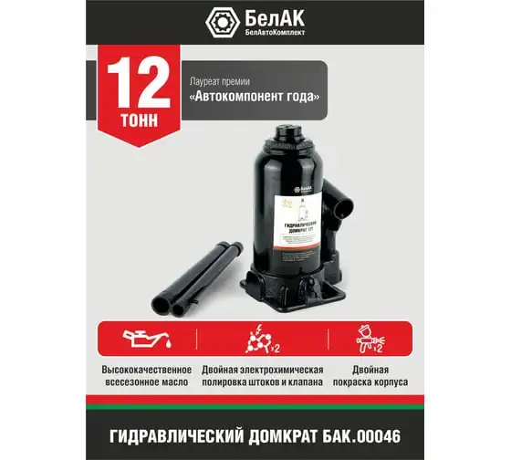 Домкрат БелАК 12 т БАК.00046 разработан российским производителем «БелАК», награждённым двумя национальными премиями «Автокомпонент года» и «Автоаксессуар года» за высокое качество и надежность выпускаемых домкратов. Продукция «БелАК» соответствуют нормам сертификации ISO9001 и ЕАС.