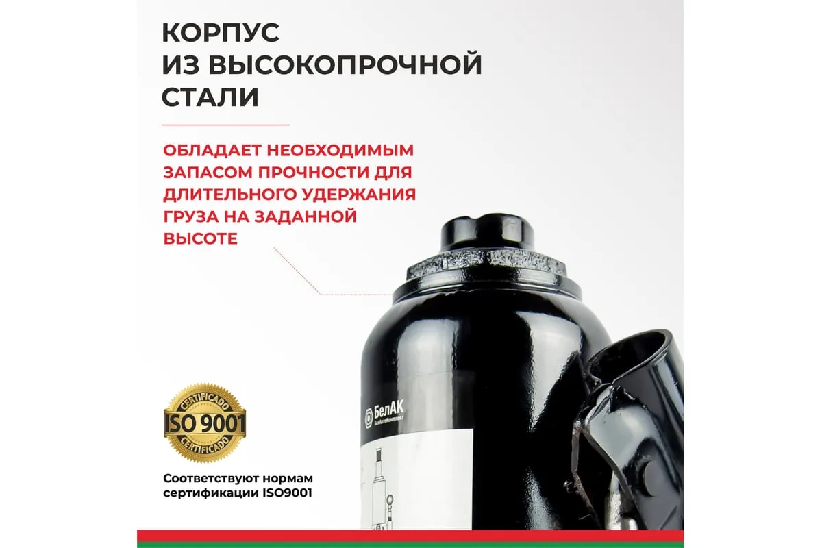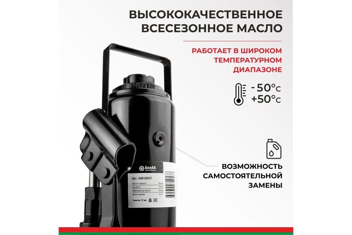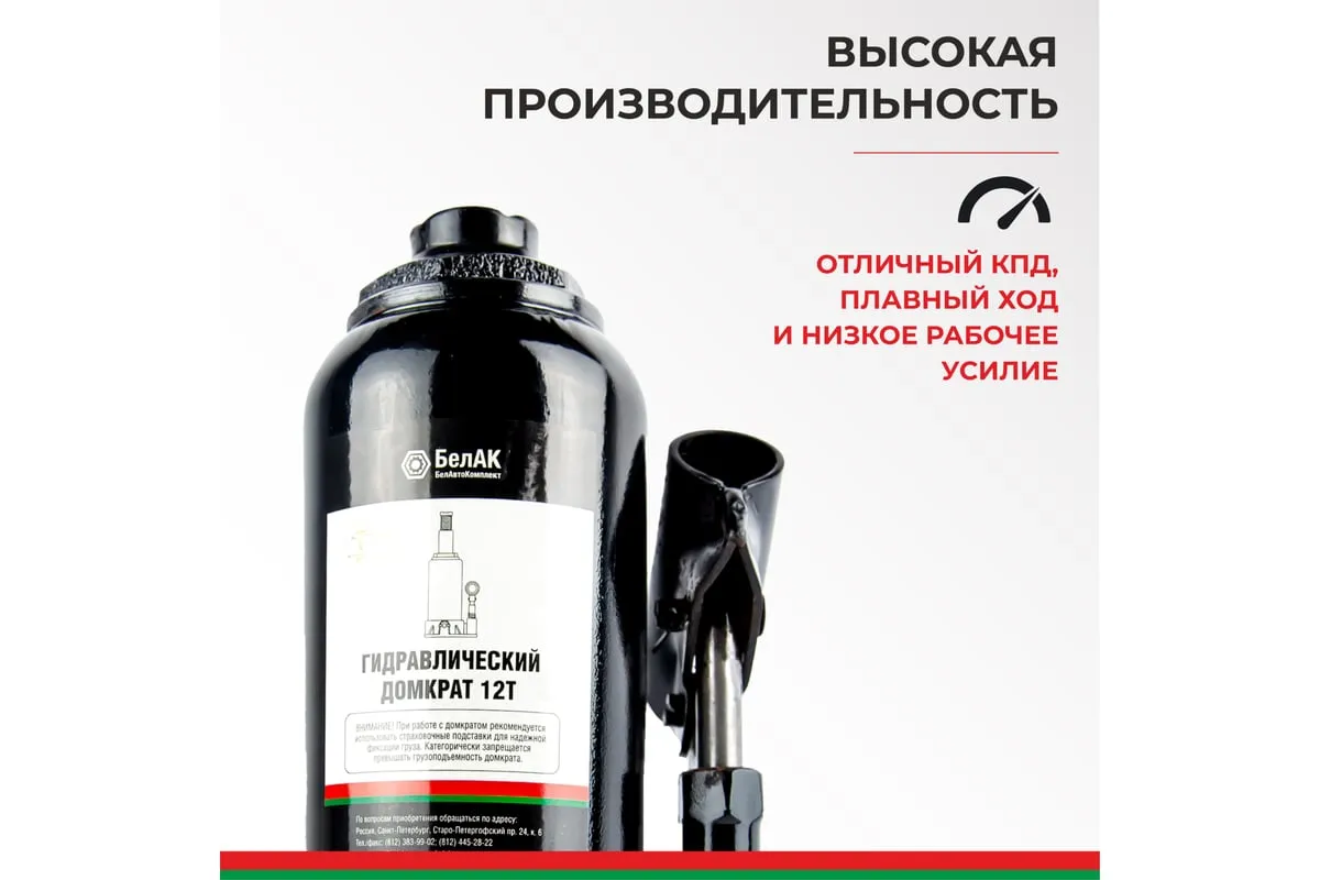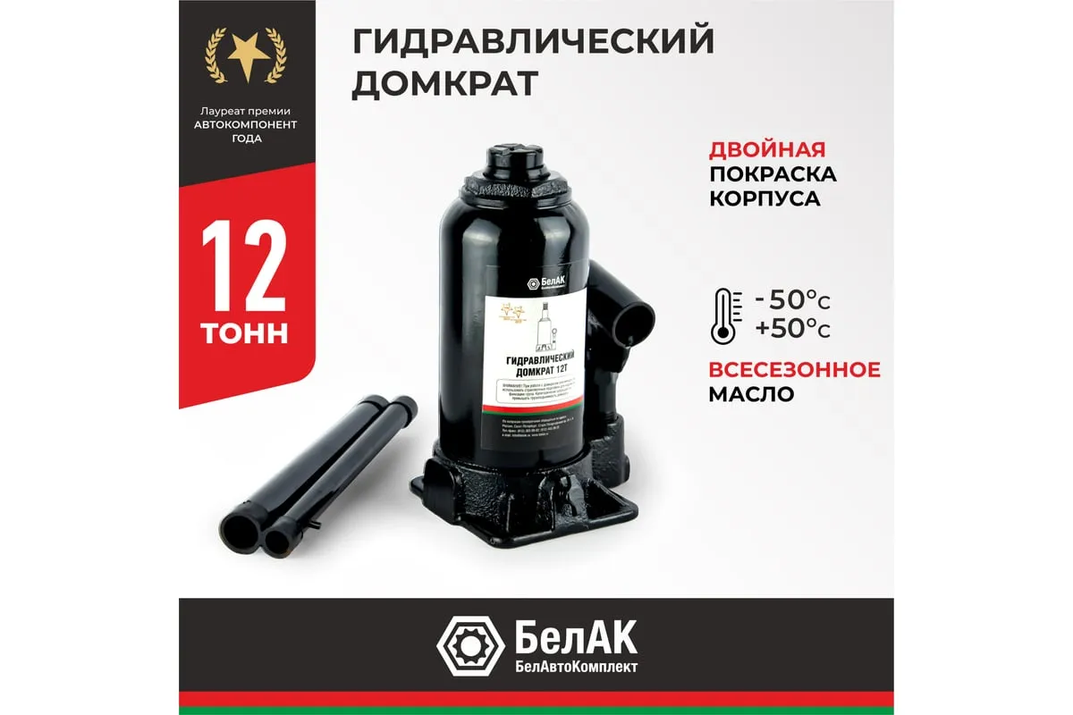 Домкрат БелАК 12 т БАК.00046 разработан российским производителем «БелАК», награждённым двумя национальными премиями «Автокомпонент года» и «Автоаксессуар года» за высокое качество и надежность выпускаемых домкратов. Продукция «БелАК» соответствуют нормам сертификации ISO9001 и ЕАС.