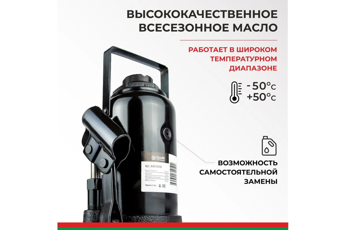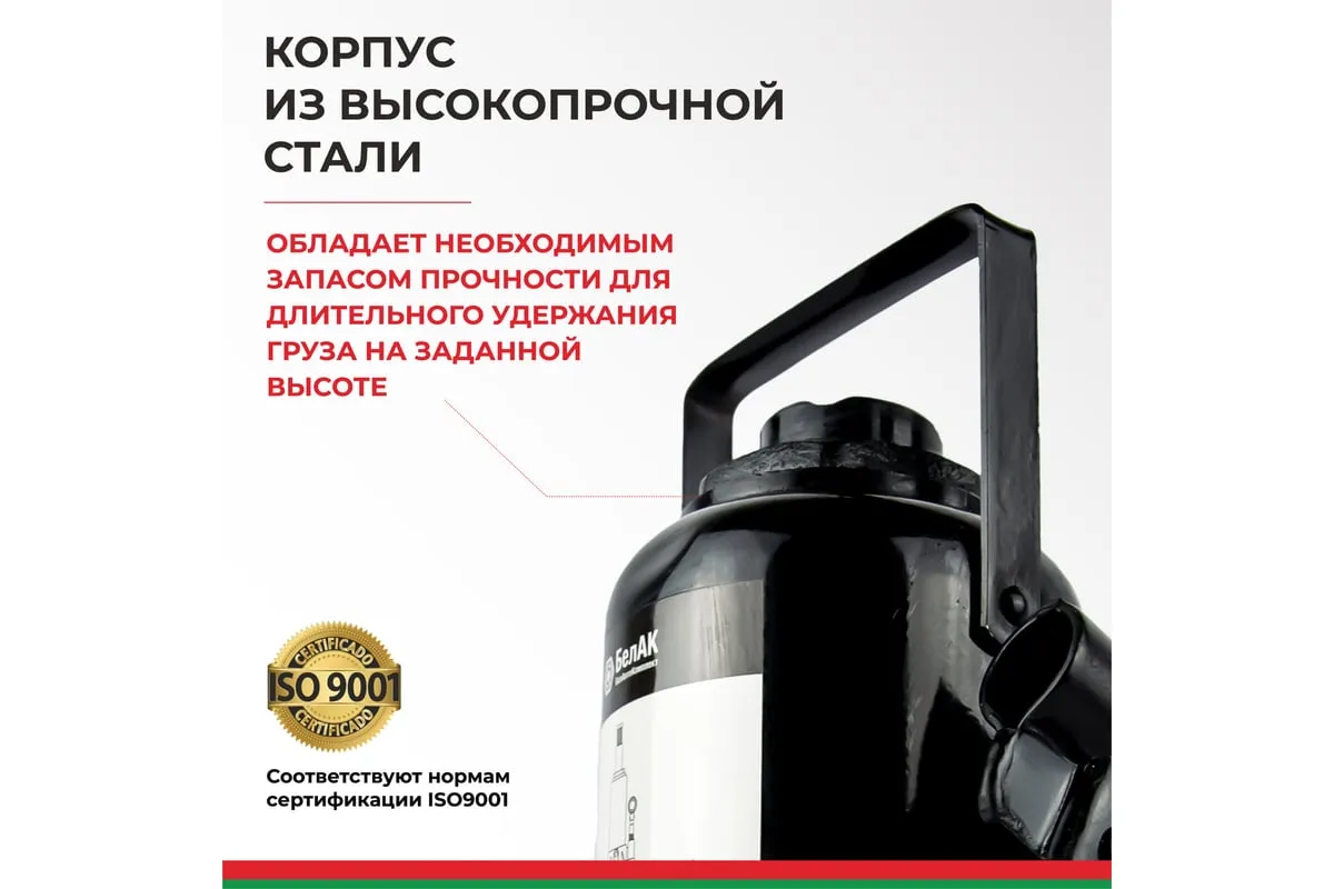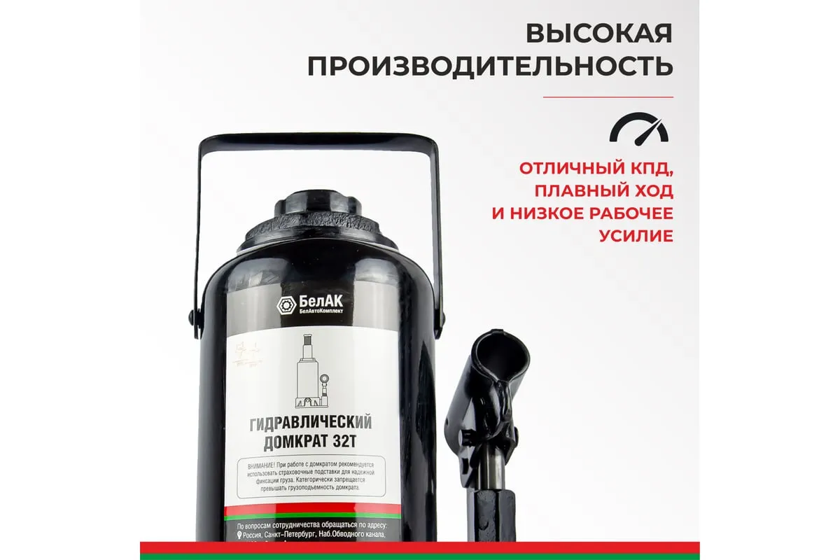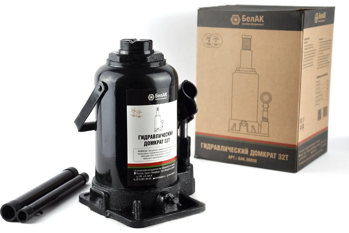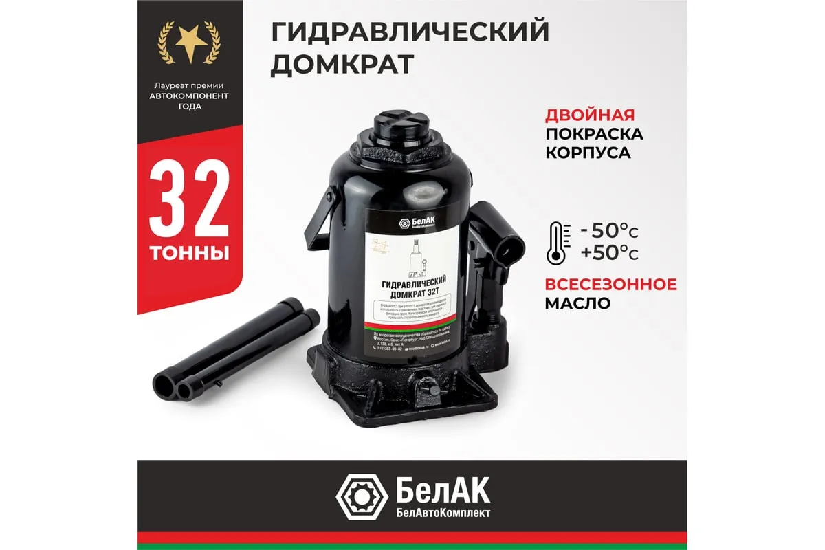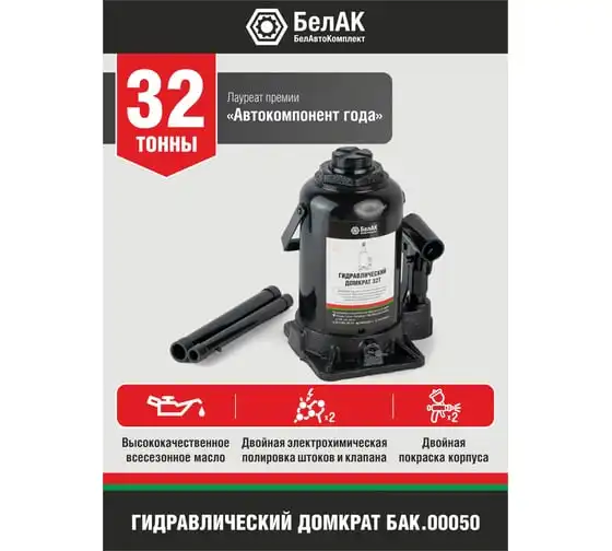 Домкрат БелАК 32 т БАК.00050 разработан российским производителем «БелАК», награждённым двумя национальными премиями «Автокомпонент года» и «Автоаксессуар года» за высокое качество и надежность выпускаемых домкратов. Продукция «БелАК» соответствуют нормам сертификации ISO9001 и ЕАС.