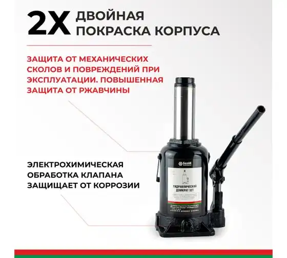 Деликатная двойная покраска корпуса домкрата надежно защищает его от механических повреждений, и значительно продлевает срок службы. Электрохимическая обработка клапана домкрата также исключает возникновение коррозии. Специальное гидравлическое масло работает в широком диапазоне температур (+/- 50 °C). К очевидным преимуществам гидравлических домкратов относятся плавность хода и торможения штока.