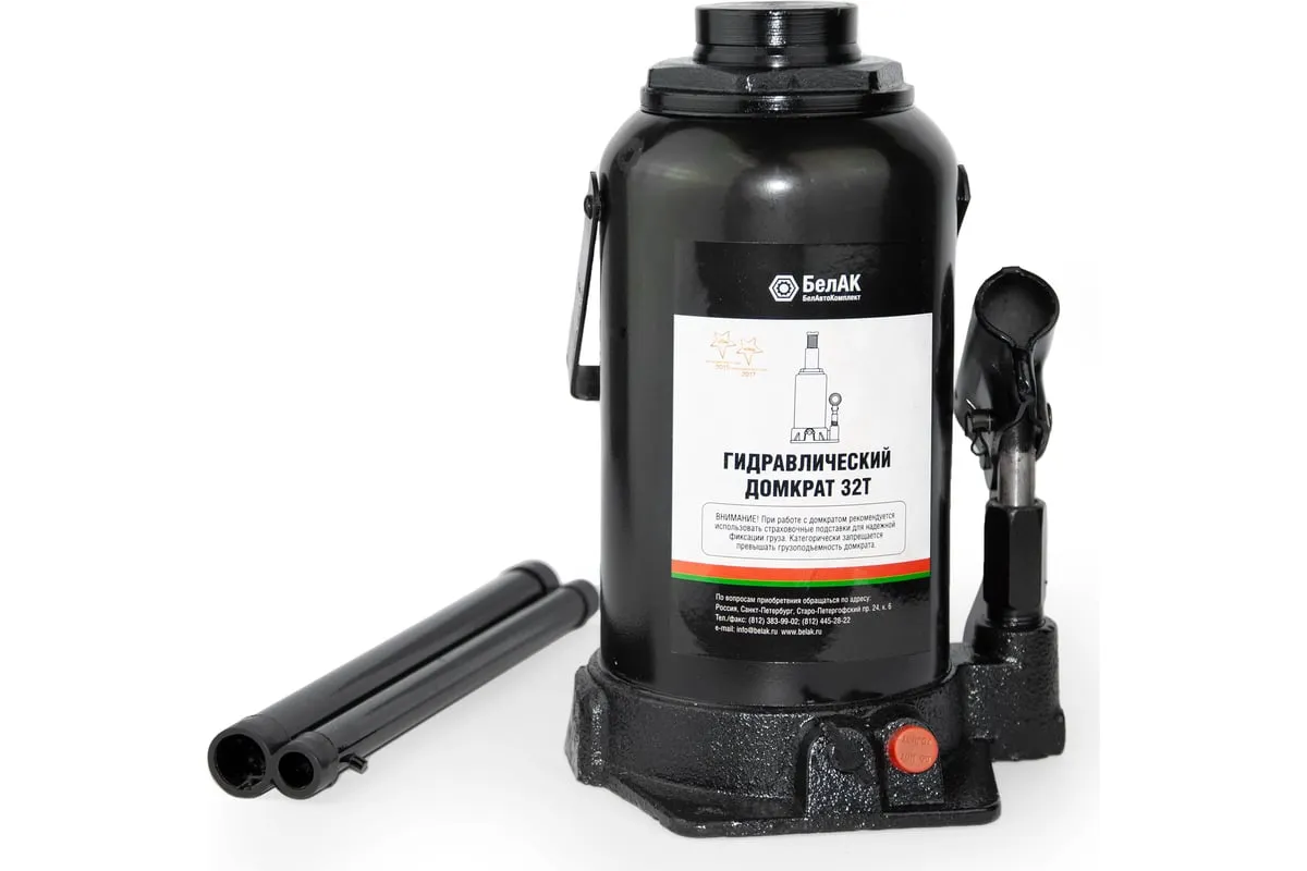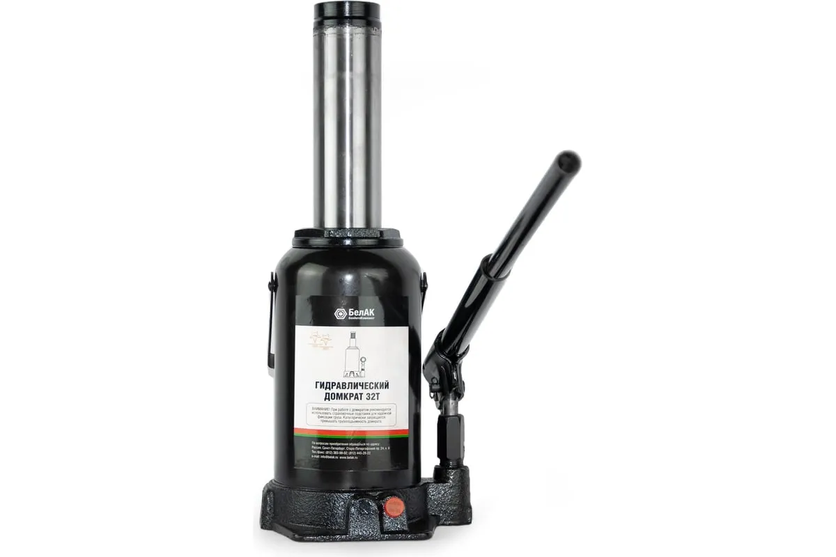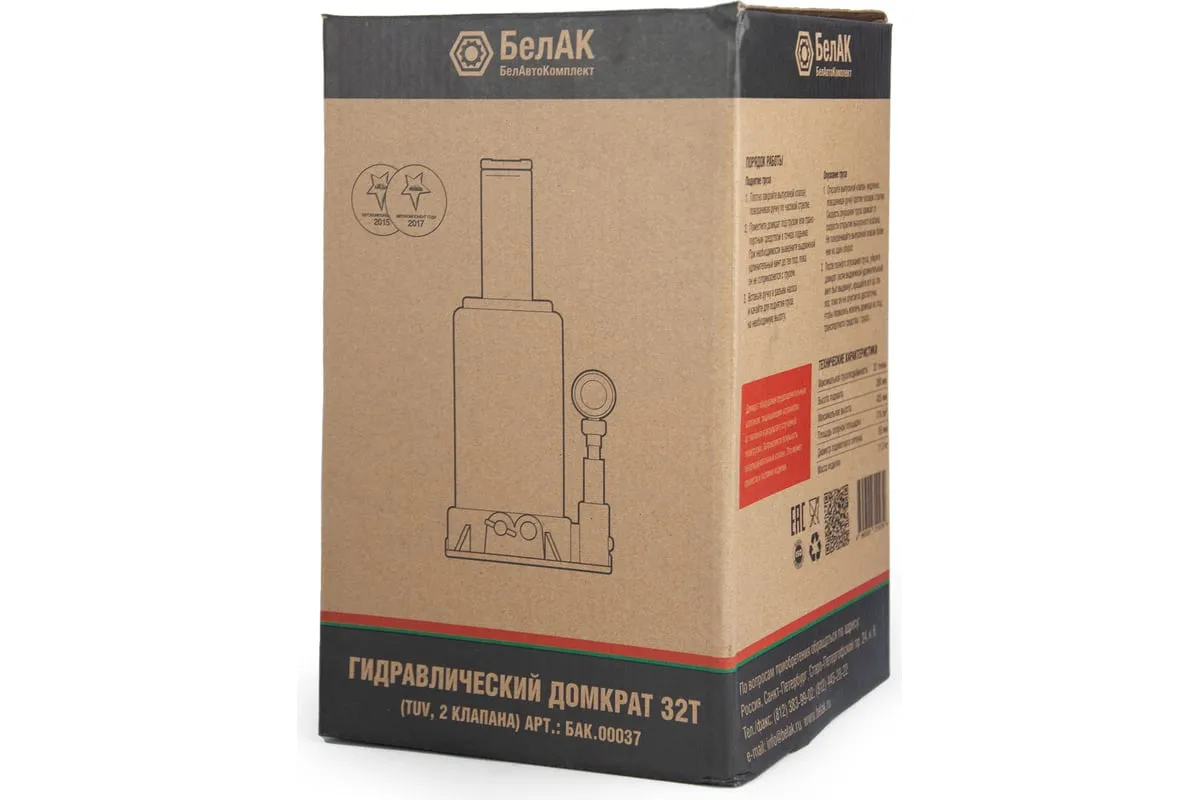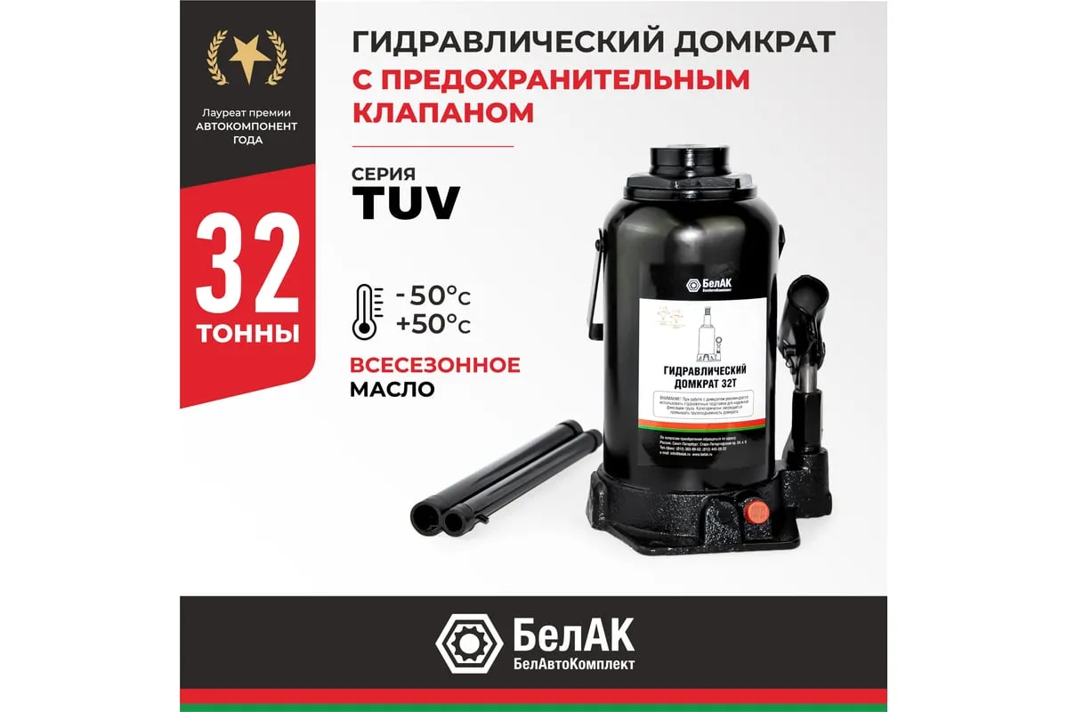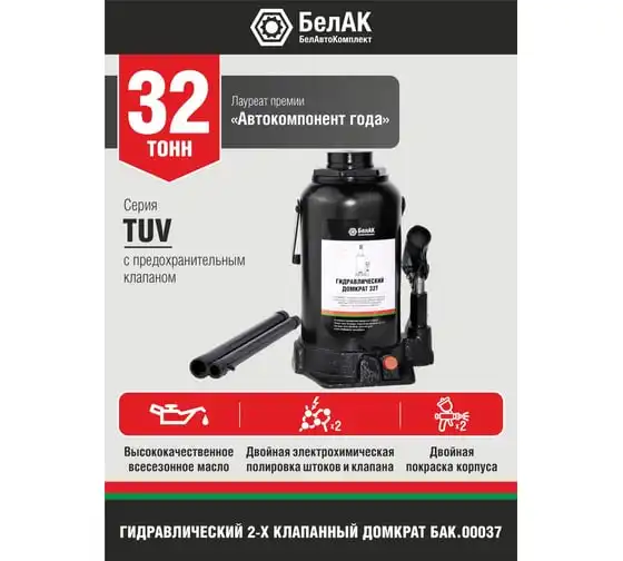Домкрат БелАК 32 т, TUV, 2 клапана БАК.00037 разработан российским производителем «БелАК», награждённым двумя национальными премиями «Автокомпонент года» и «Автоаксессуар года» за высокое качество и надежность выпускаемых домкратов. Продукция «БелАК» соответствуют нормам сертификации ISO9001 и ЕАС.