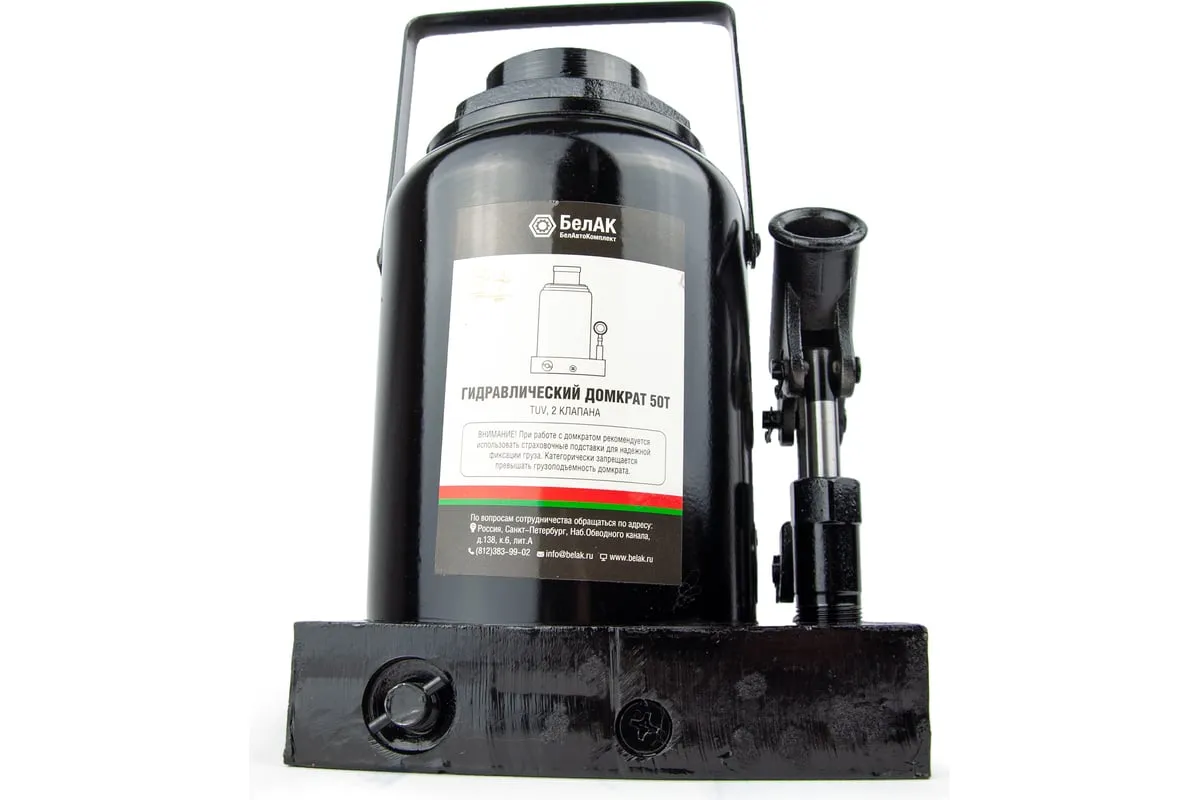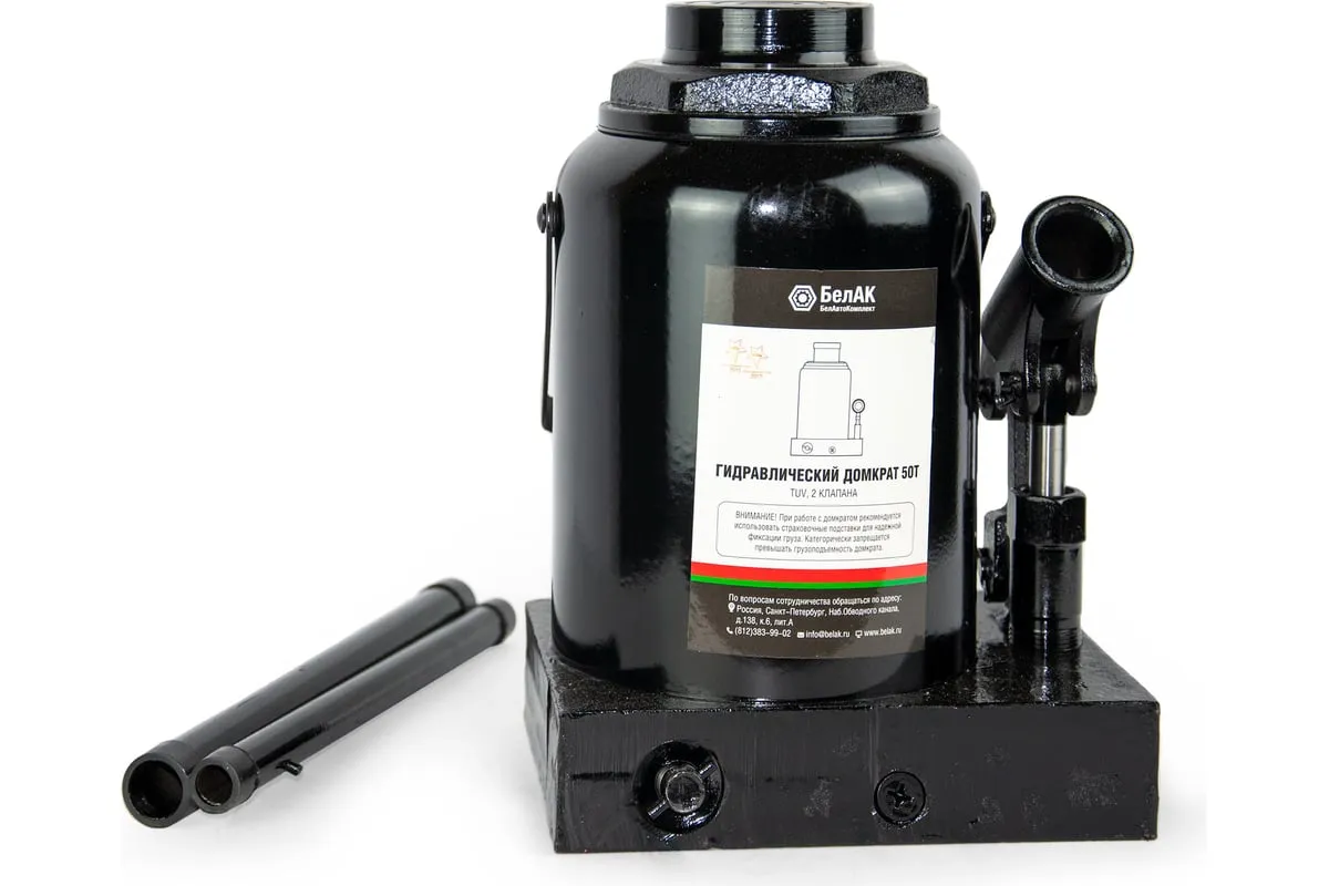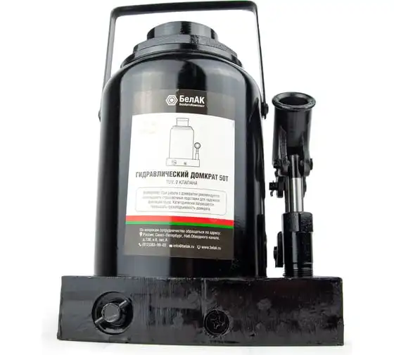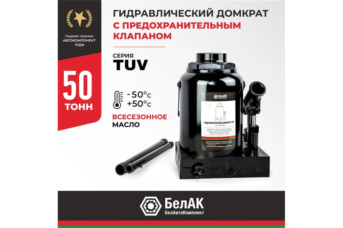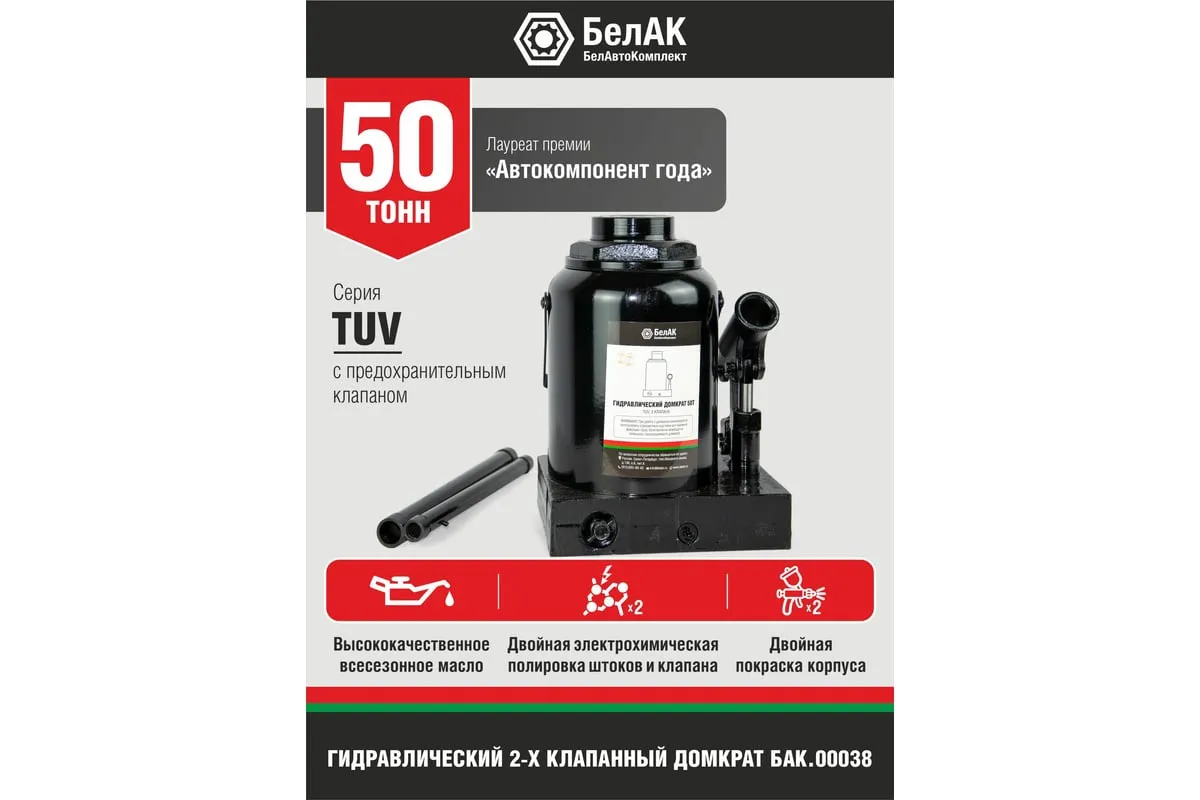 Домкрат 50 тонн (TUV, 2 клапана) БелАК БАК.00038 разработан российским производителем «БелАК», награждённым двумя национальными премиями «Автокомпонент года» и «Автоаксессуар года» за высокое качество и надежность выпускаемых домкратов. Продукция «БелАК» соответствуют нормам сертификации ISO9001 и ЕАС.