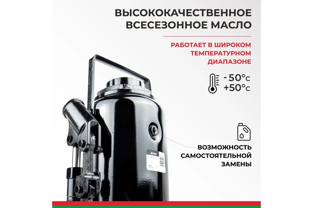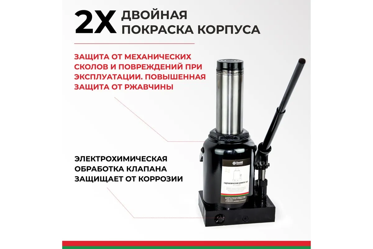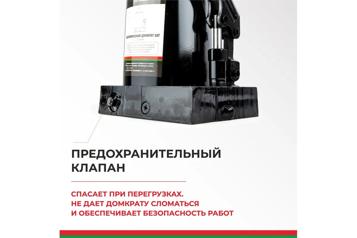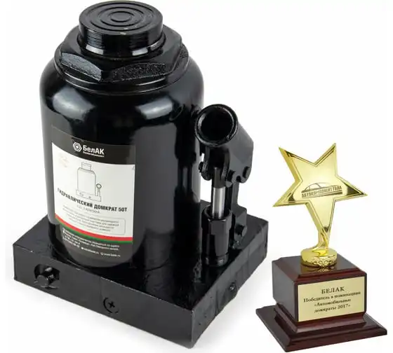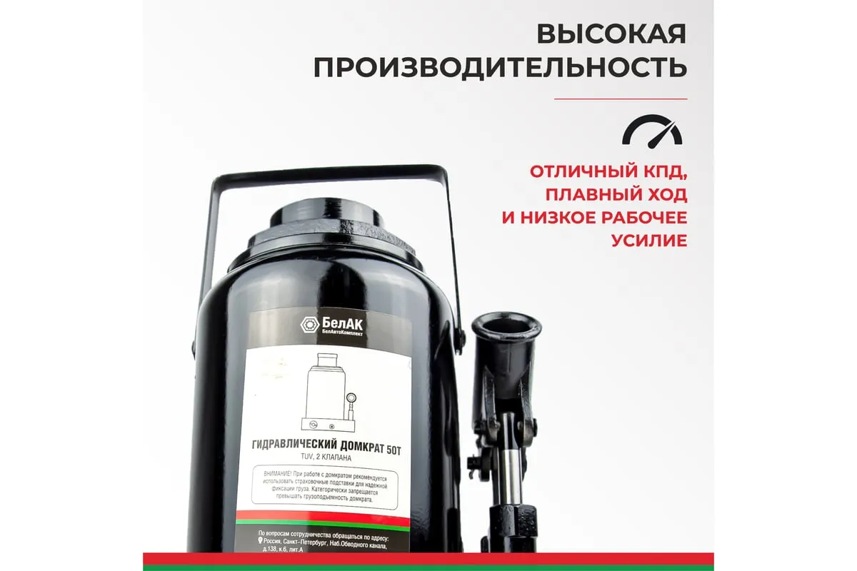 Домкрат 50 тонн (TUV, 2 клапана) БелАК БАК.00038 разработан российским производителем «БелАК», награждённым двумя национальными премиями «Автокомпонент года» и «Автоаксессуар года» за высокое качество и надежность выпускаемых домкратов. Продукция «БелАК» соответствуют нормам сертификации ISO9001 и ЕАС.
