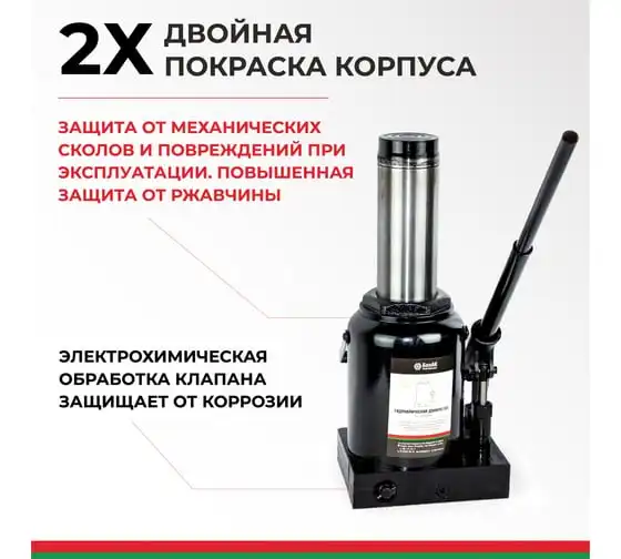 Деликатная двойная покраска корпуса домкрата надежно защищает его от механических повреждений и значительно продлевает срок службы. Электрохимическая обработка клапана домкрата также защищает от возникновения коррозии. Специальное гидравлическое масло работает в широком диапазоне температур (+/- 50 °C). В комплект поставки входит съемный складной рычаг, который обеспечивает снижение рабочего усилия.