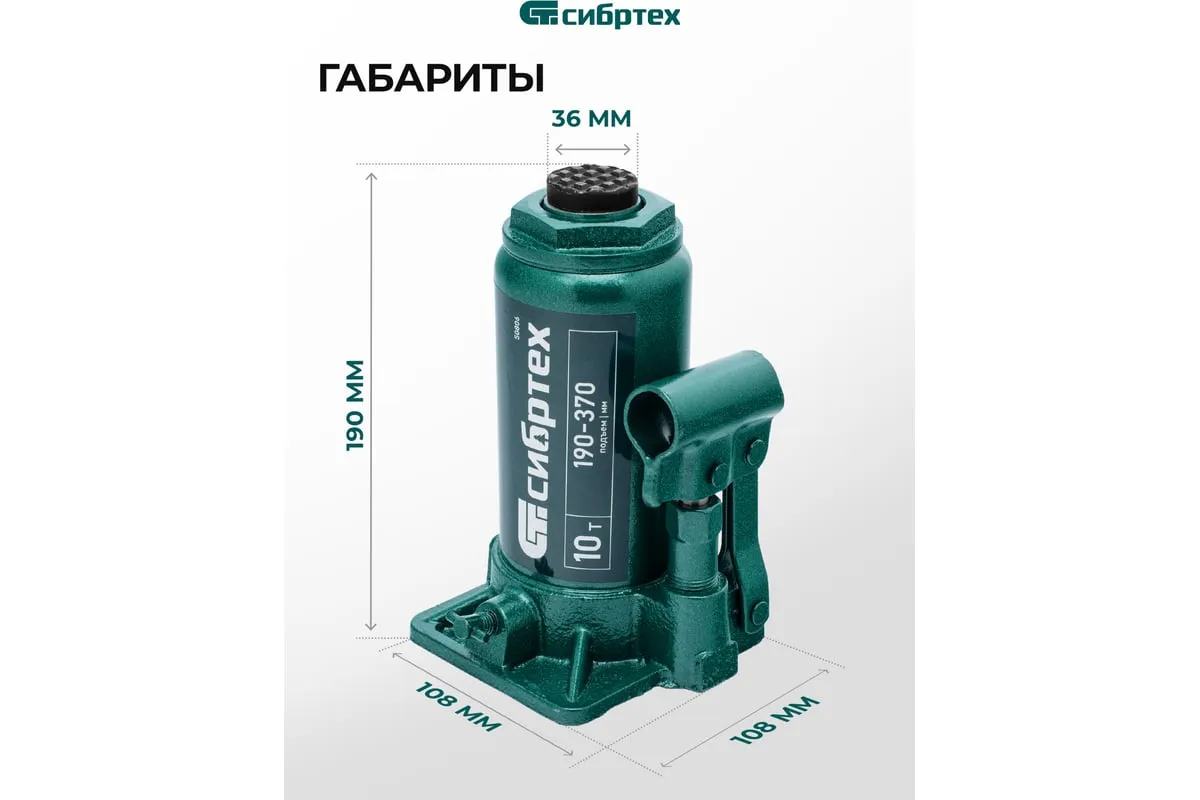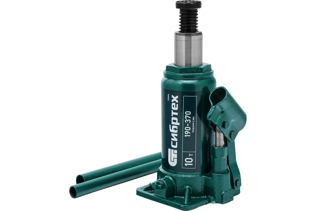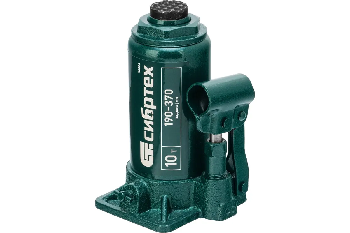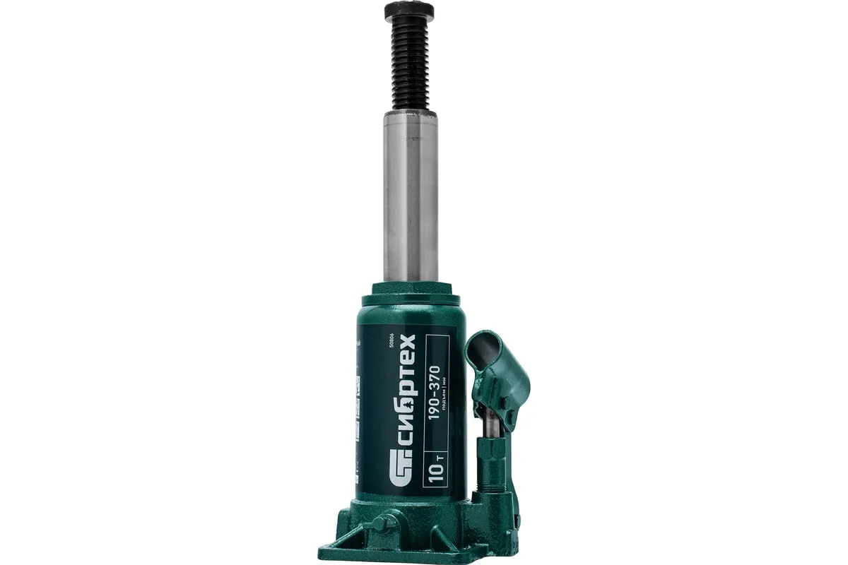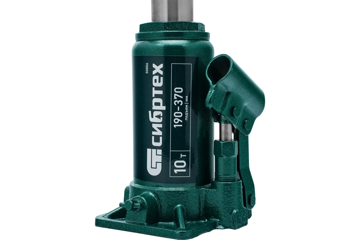 Домкрат гидравлический бутылочный Сибртех 50806 предназначен для подъема грузов массой до 10 т на высоту от 190 до 370 мм. Не требует больших усилий от пользователя и значительно облегчает рабочий процесс. Домкрат будет полезен при проведении техобслуживания машины в автосервисе или гараже