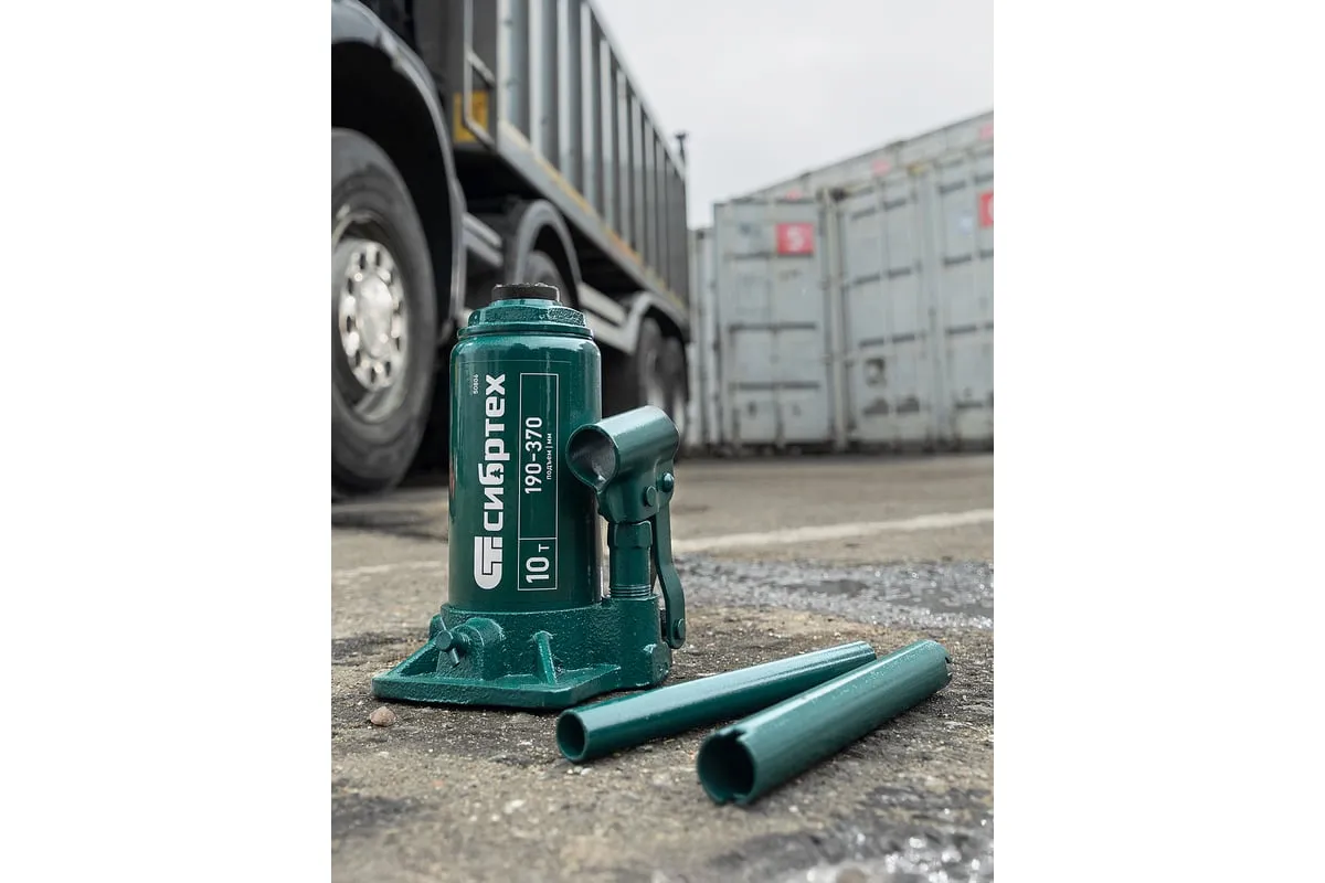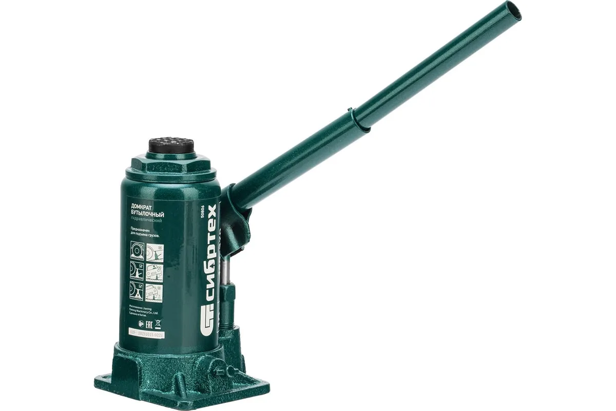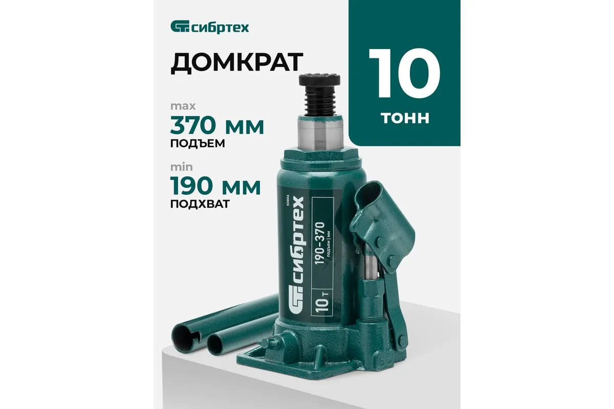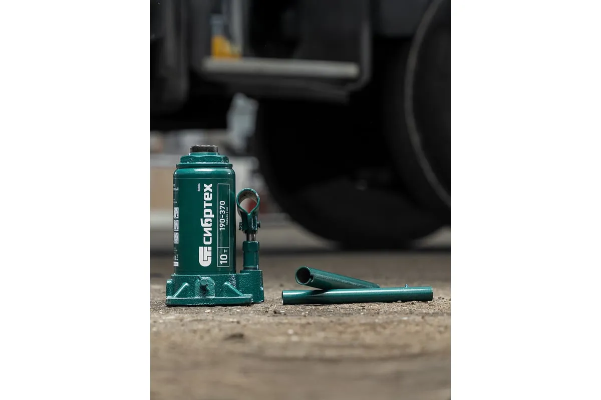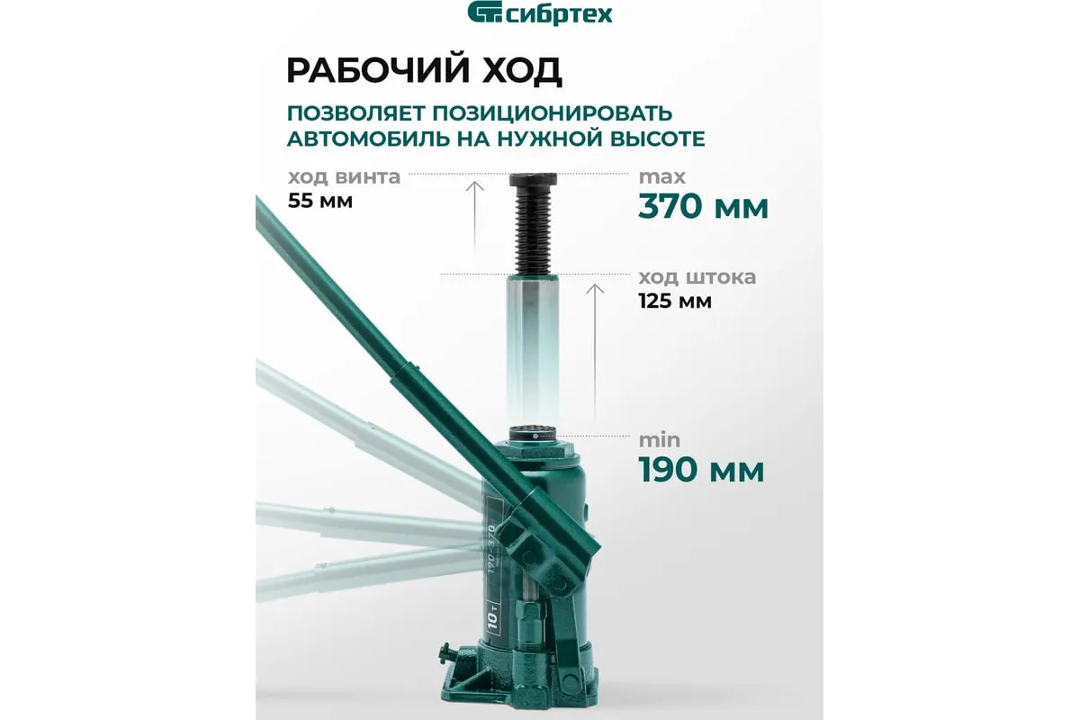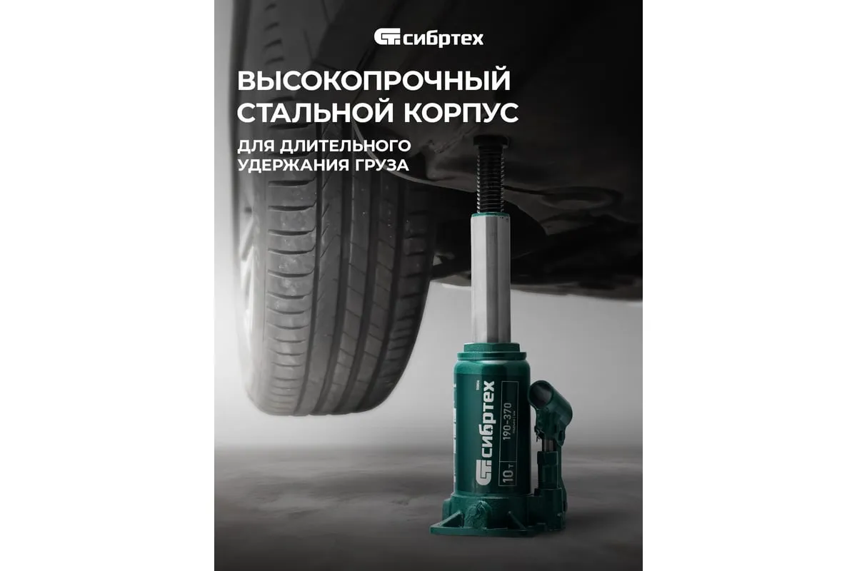 Домкрат гидравлический бутылочный Сибртех 50806 предназначен для подъема грузов массой до 10 т на высоту от 190 до 370 мм. Не требует больших усилий от пользователя и значительно облегчает рабочий процесс. Домкрат будет полезен при проведении техобслуживания машины в автосервисе или гараже