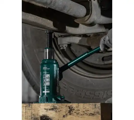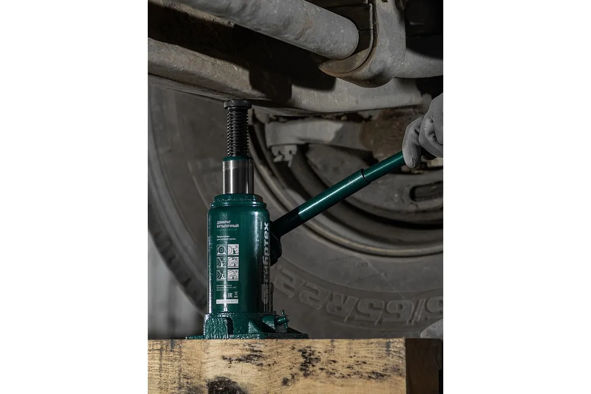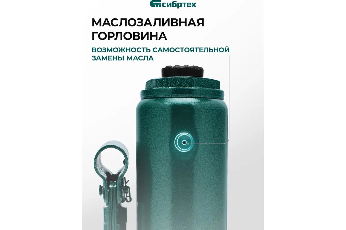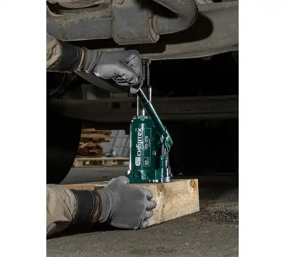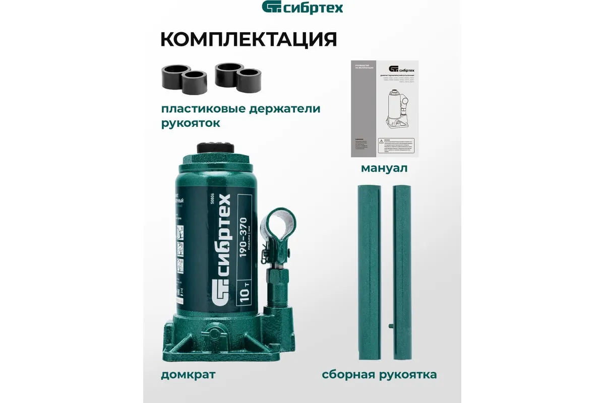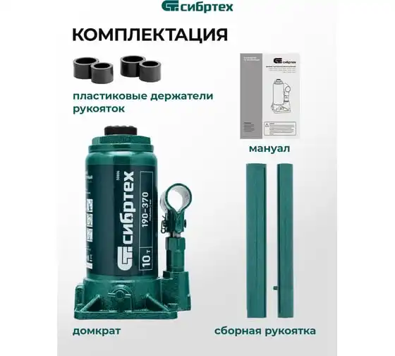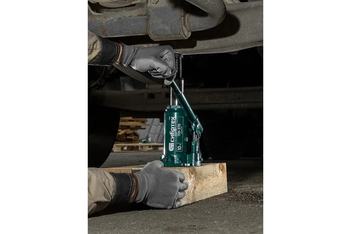 Домкрат гидравлический бутылочный Сибртех 50806 предназначен для подъема грузов массой до 10 т на высоту от 190 до 370 мм. Не требует больших усилий от пользователя и значительно облегчает рабочий процесс. Домкрат будет полезен при проведении техобслуживания машины в автосервисе или гараже