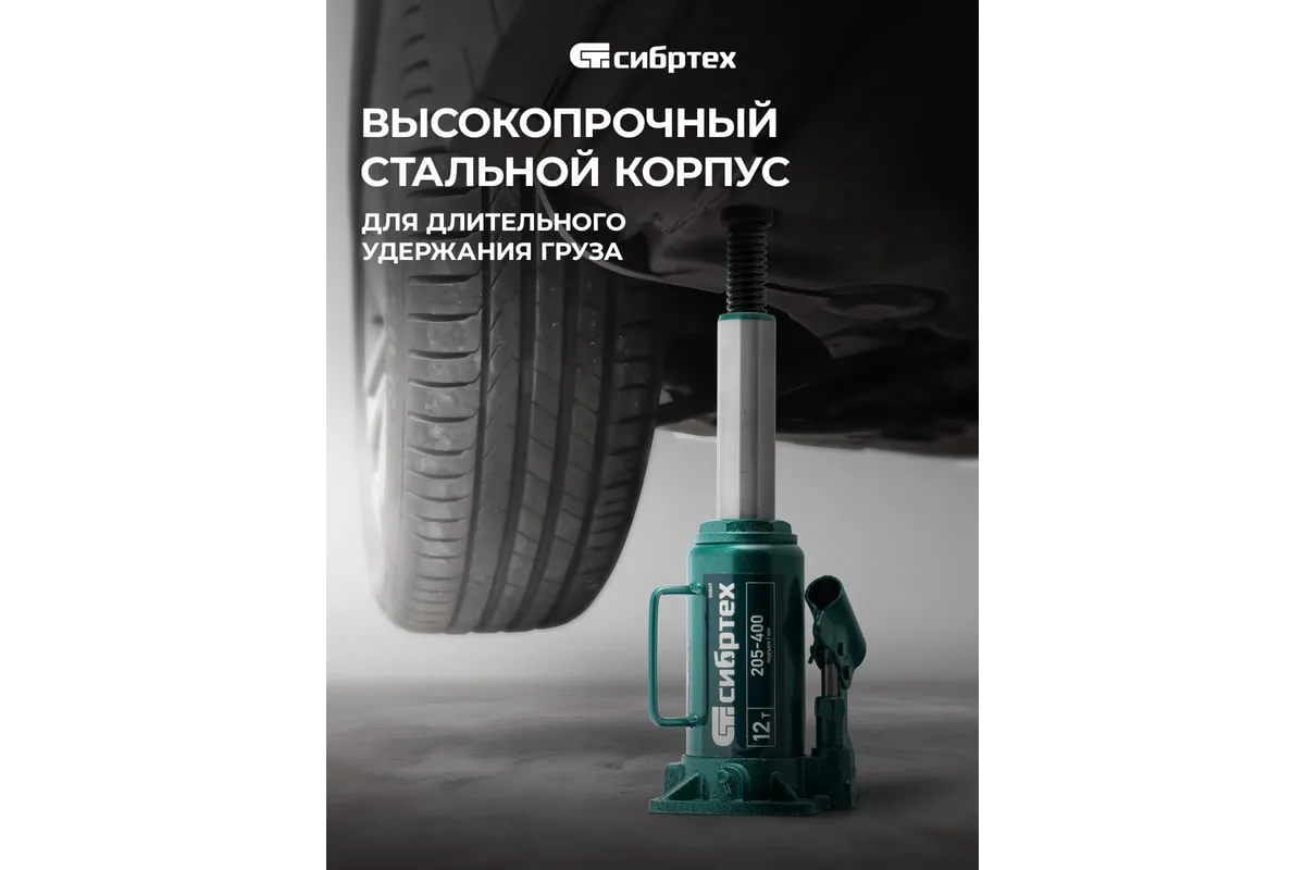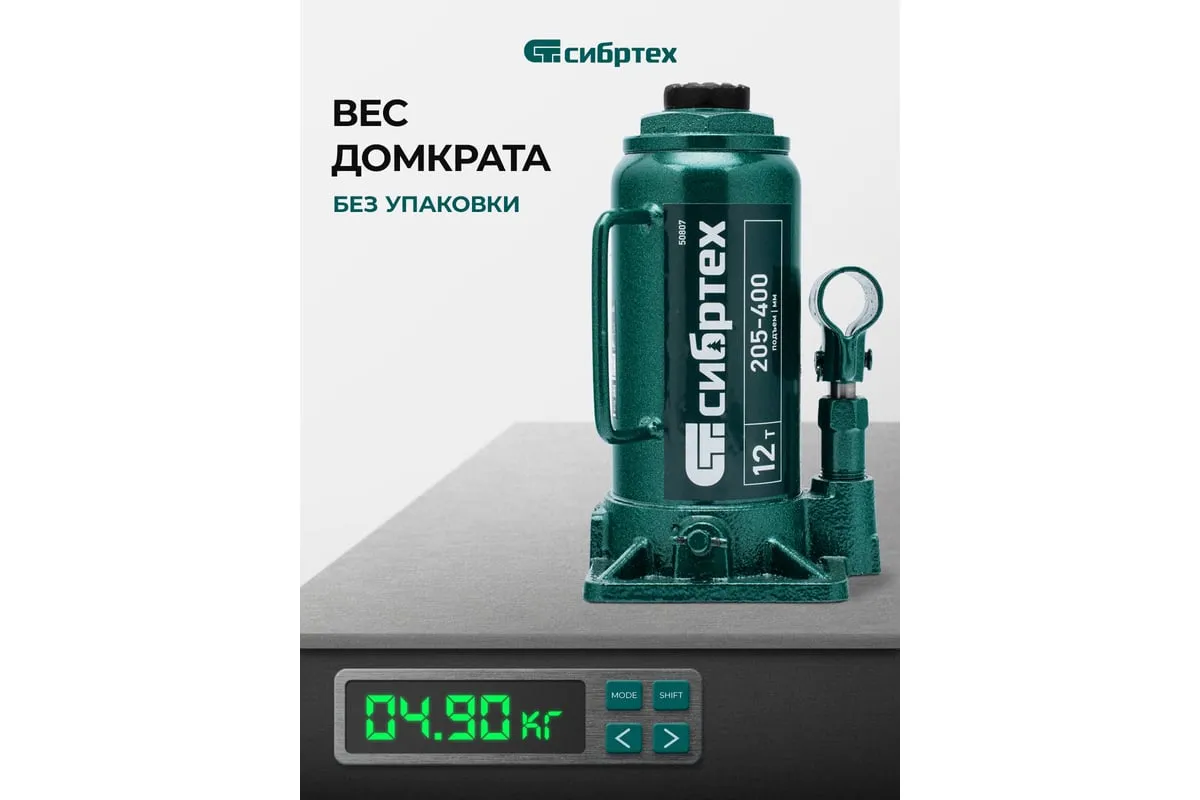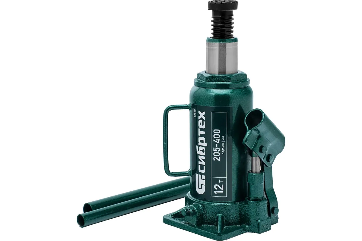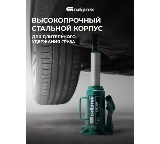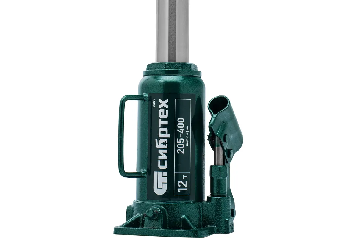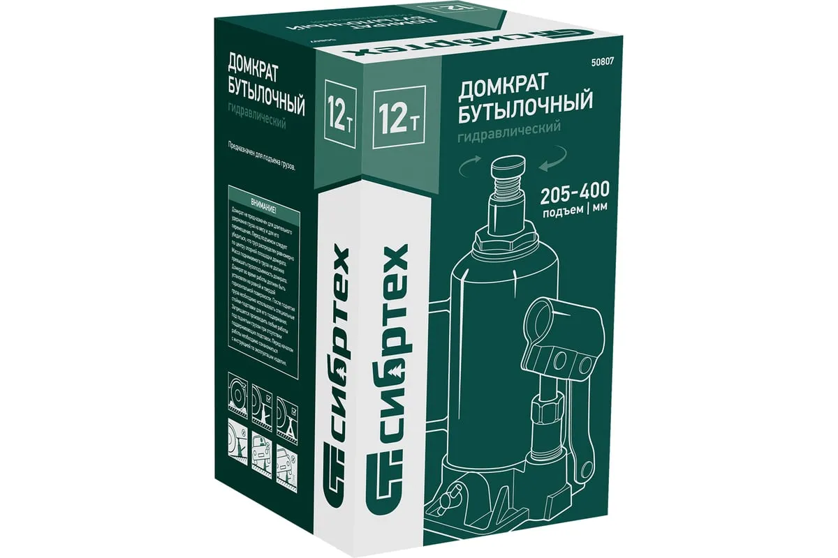 Домкрат гидравлический бутылочный Сибртех 50807 предназначен для подъема грузов массой до 12 т на высоту от 205 до 400 мм. Не требует больших усилий от пользователя и значительно облегчает рабочий процесс. Домкрат будет полезен при проведении техобслуживания машины в автосервисе или гараже.
