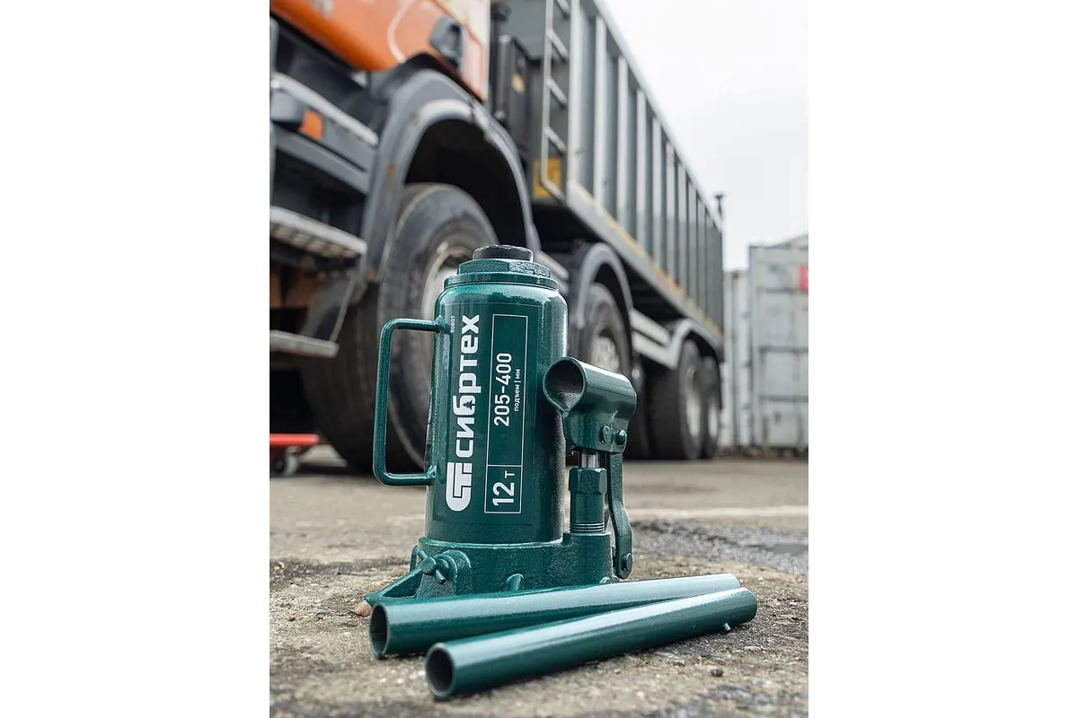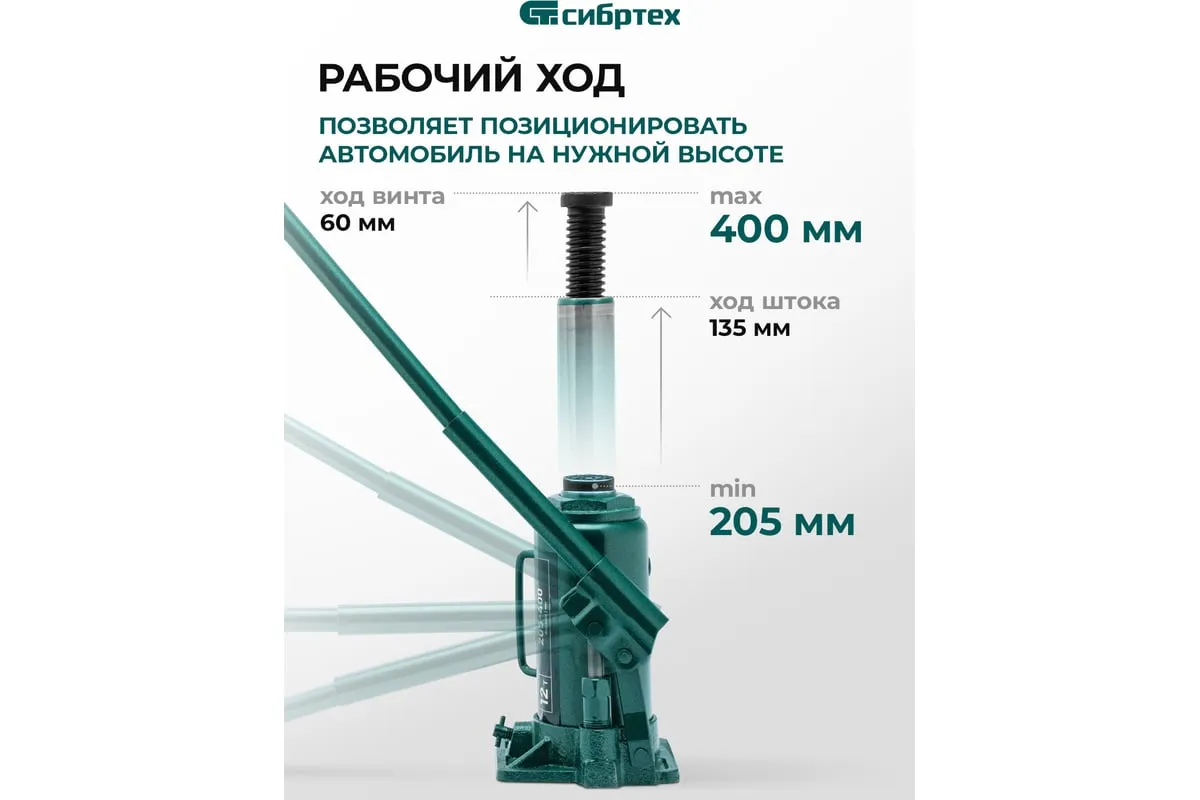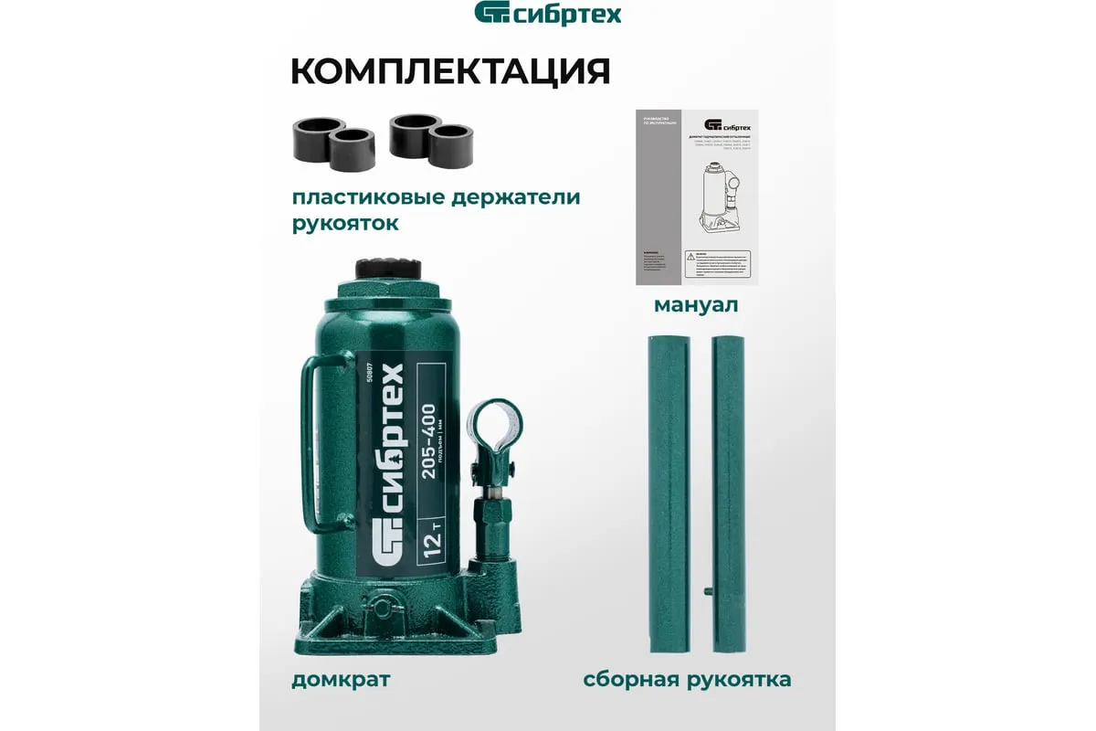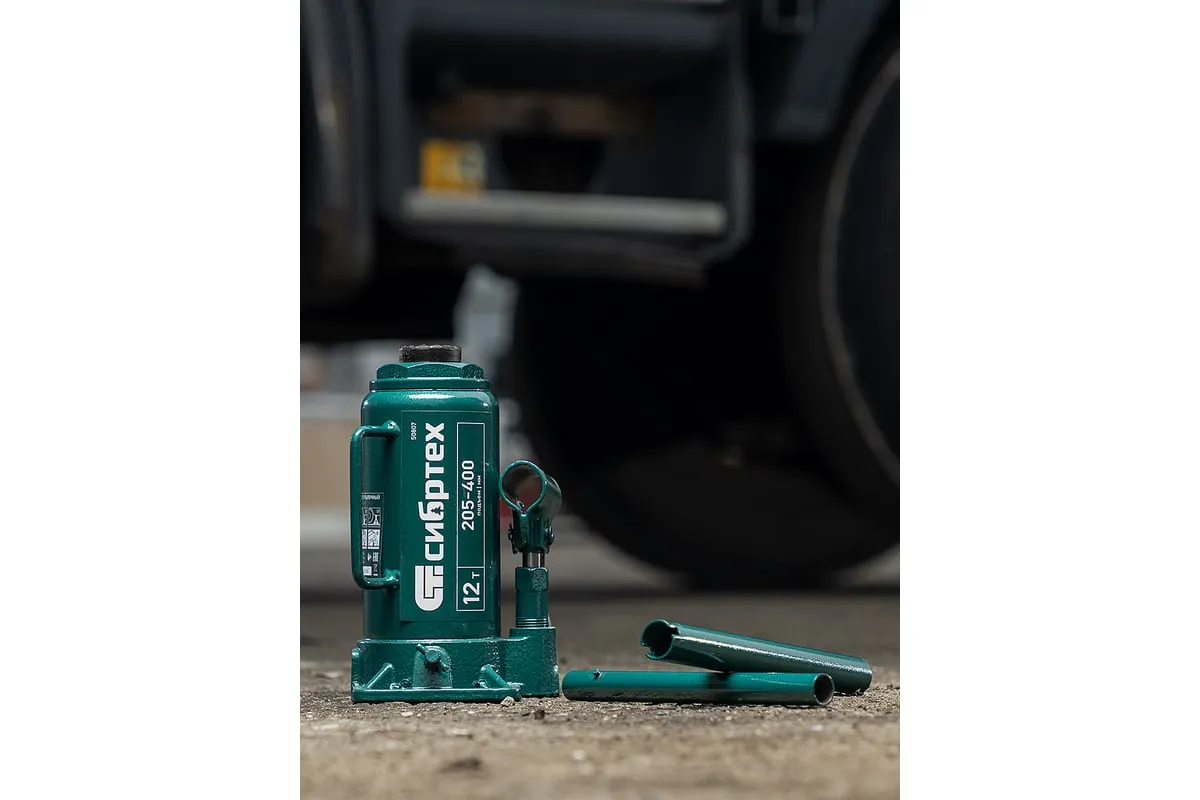 Домкрат гидравлический бутылочный Сибртех 50807 предназначен для подъема грузов массой до 12 т на высоту от 205 до 400 мм. Не требует больших усилий от пользователя и значительно облегчает рабочий процесс. Домкрат будет полезен при проведении техобслуживания машины в автосервисе или гараже.
