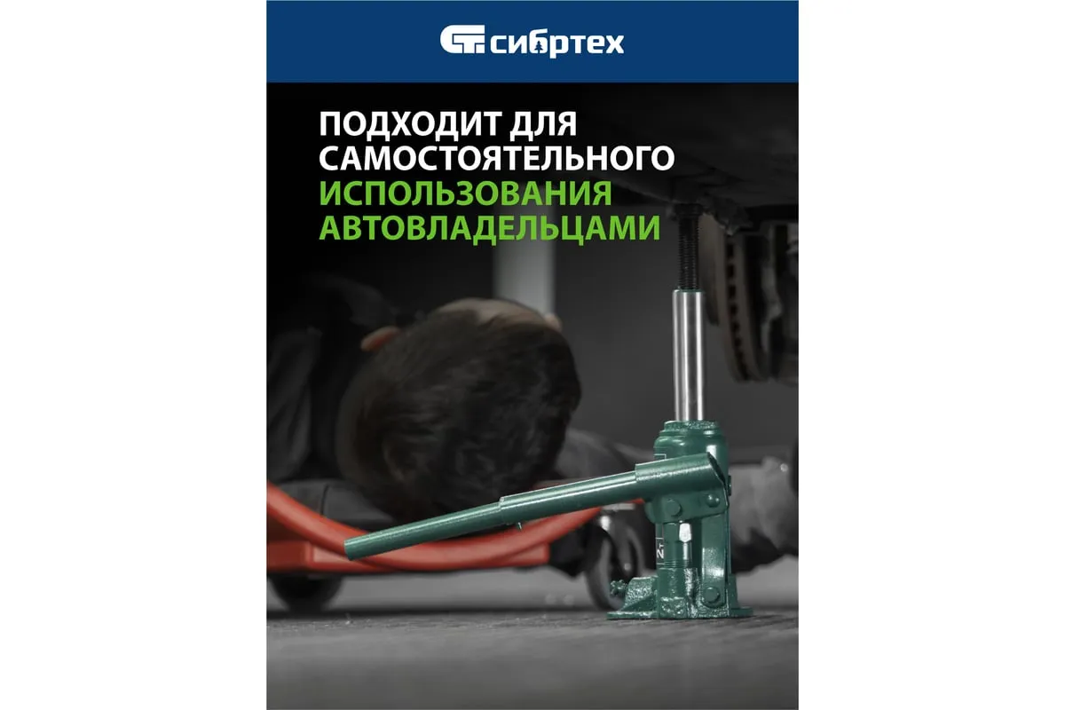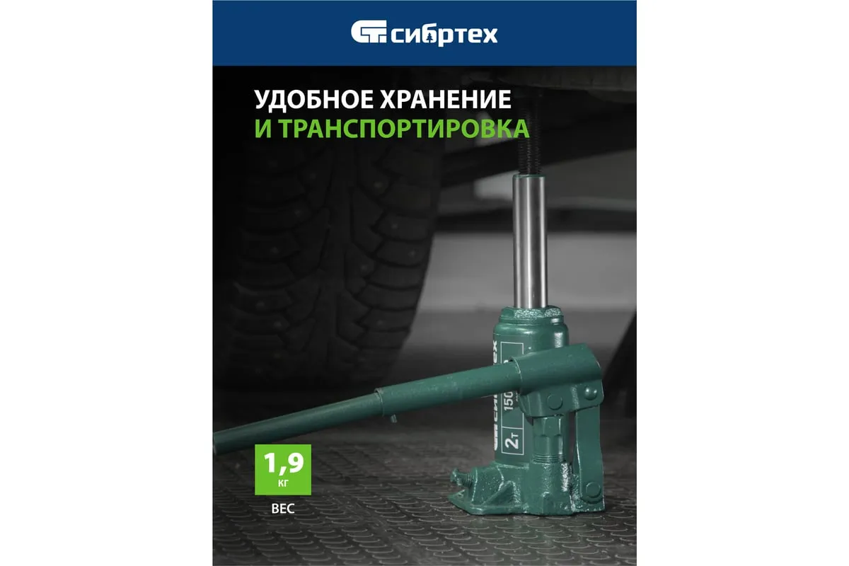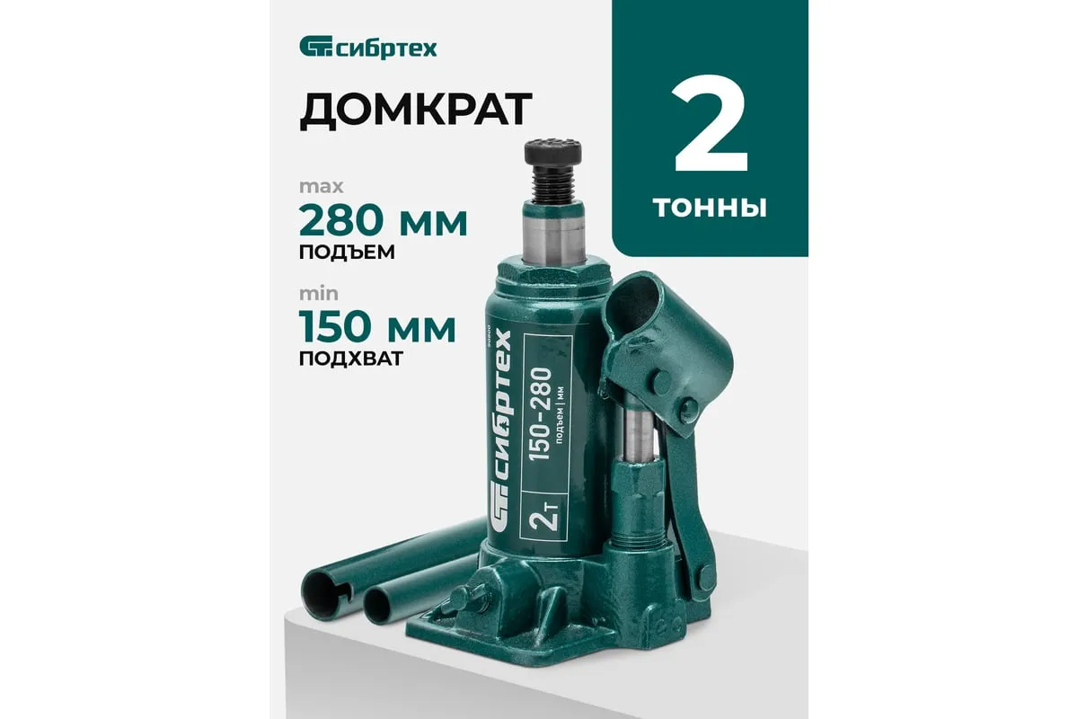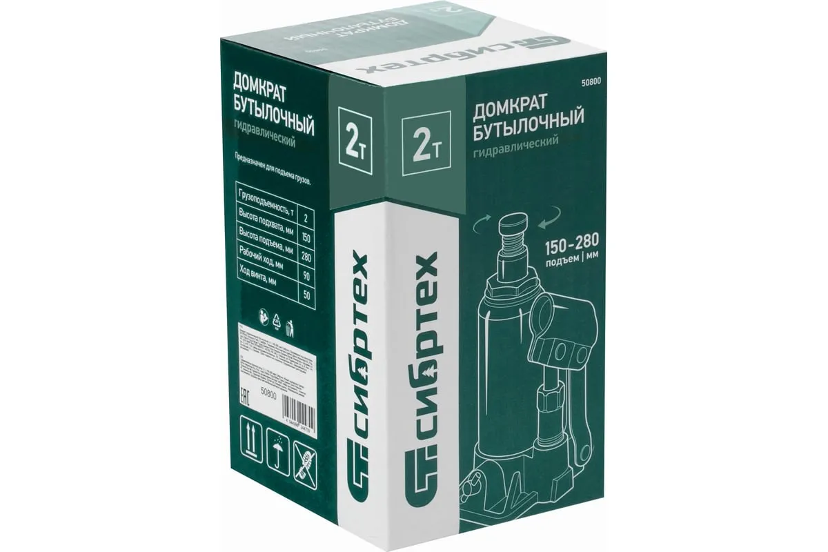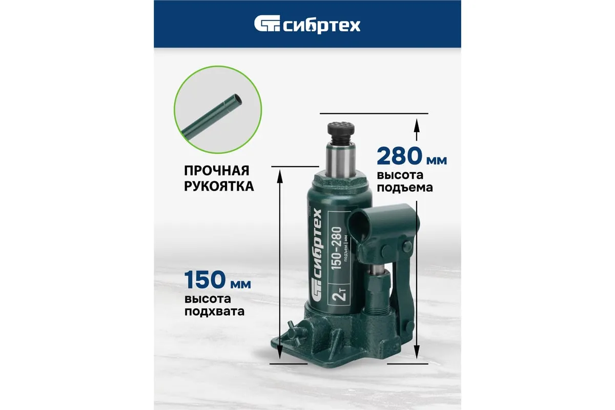 Домкрат гидравлический бутылочный Сибртех 50800 предназначен для подъема грузов массой до 2 т на высоту от 150 до 280 мм. Не требует больших усилий от пользователя и значительно облегчает рабочий процесс. Домкрат будет полезен при проведении техобслуживания машины в автосервисе или гараже.