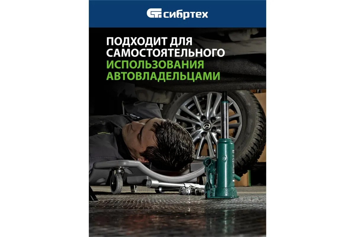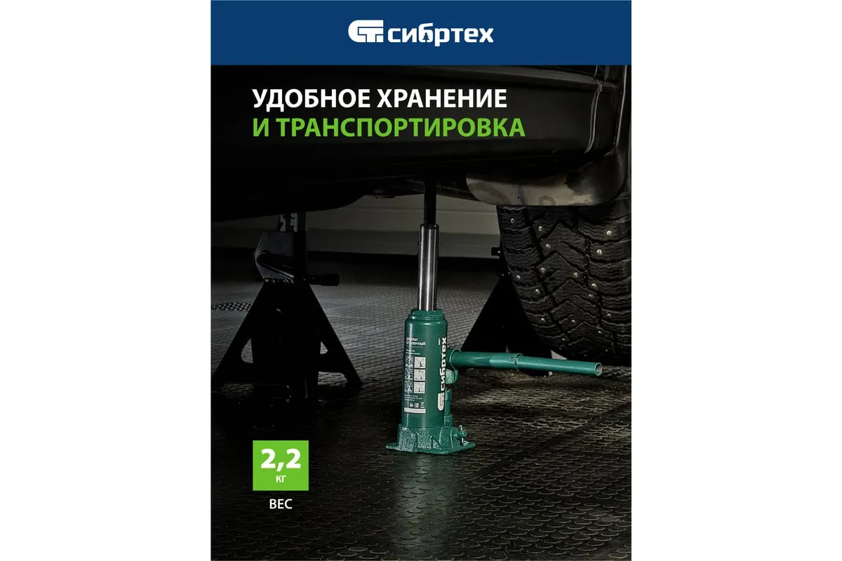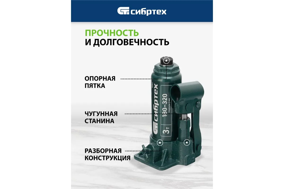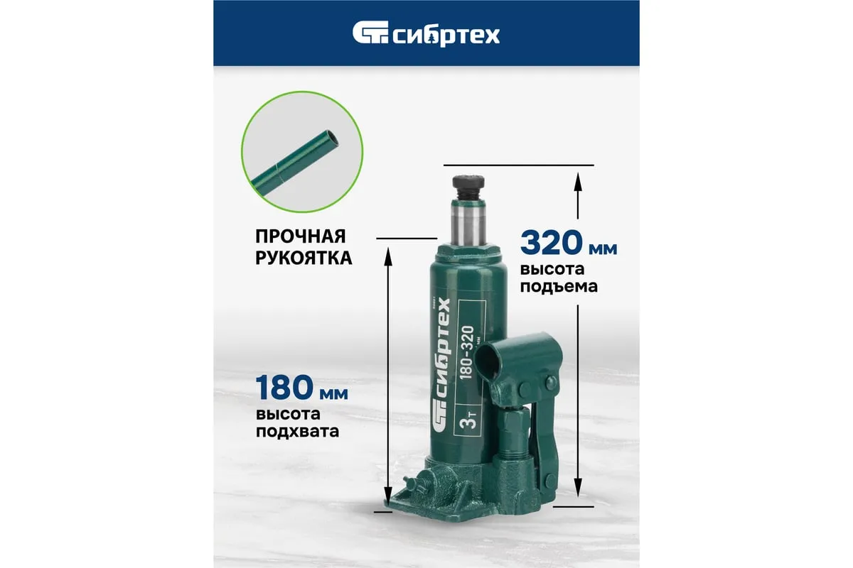Домкрат гидравлический бутылочный Сибртех 50801 предназначен для подъема грузов массой до 3 т на высоту от 180 до 320 мм. Не требует больших усилий от пользователя и значительно облегчает рабочий процесс. Домкрат будет полезен при проведении техобслуживания машины в автосервисе или гараже.