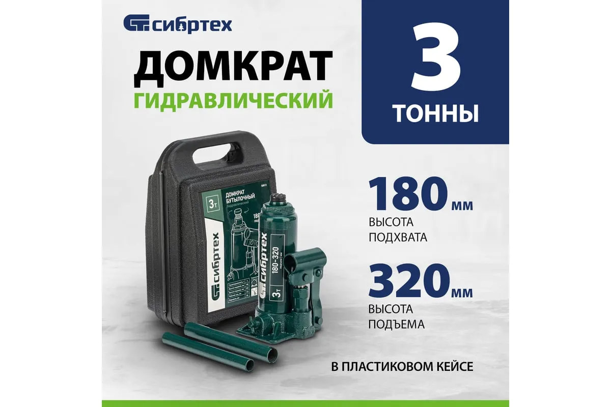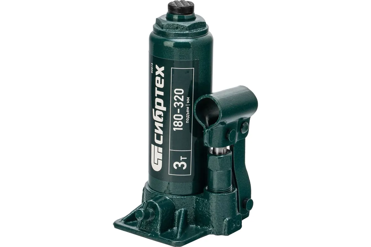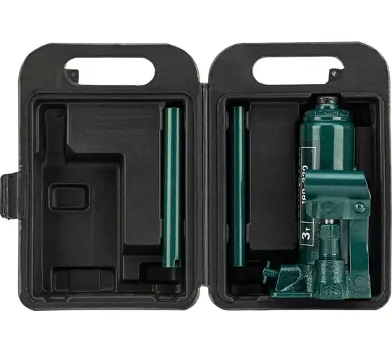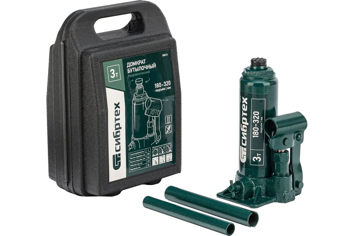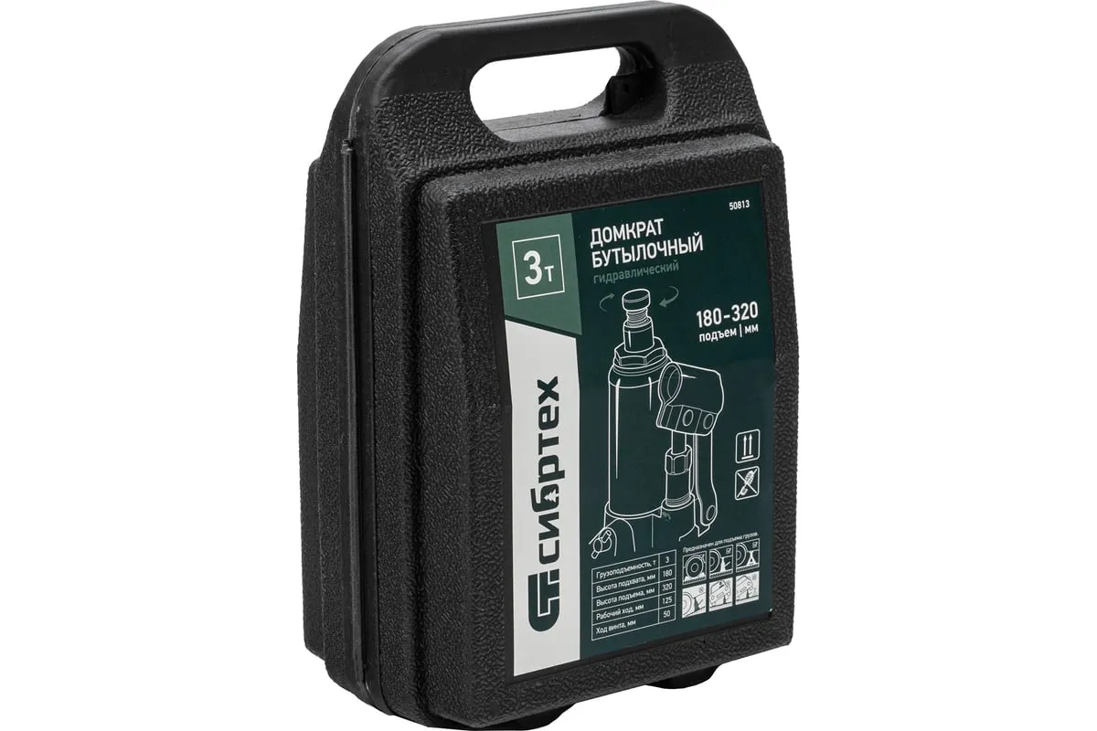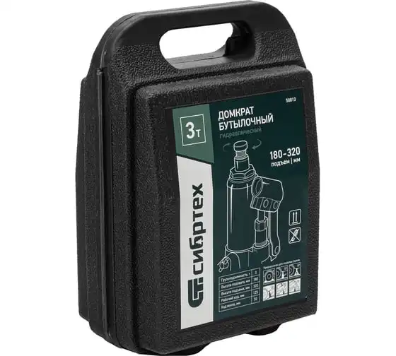 Домкрат гидравлический бутылочный Сибртех 50813, поставляющийся в пластиковом кейсе, предназначен для подъема грузов массой до 3 т на высоту от 180 до 320 мм. Не требует больших усилий от пользователя и значительно облегчает рабочий процесс. Домкрат будет полезен при проведении техобслуживания машины в автосервисе или гараже