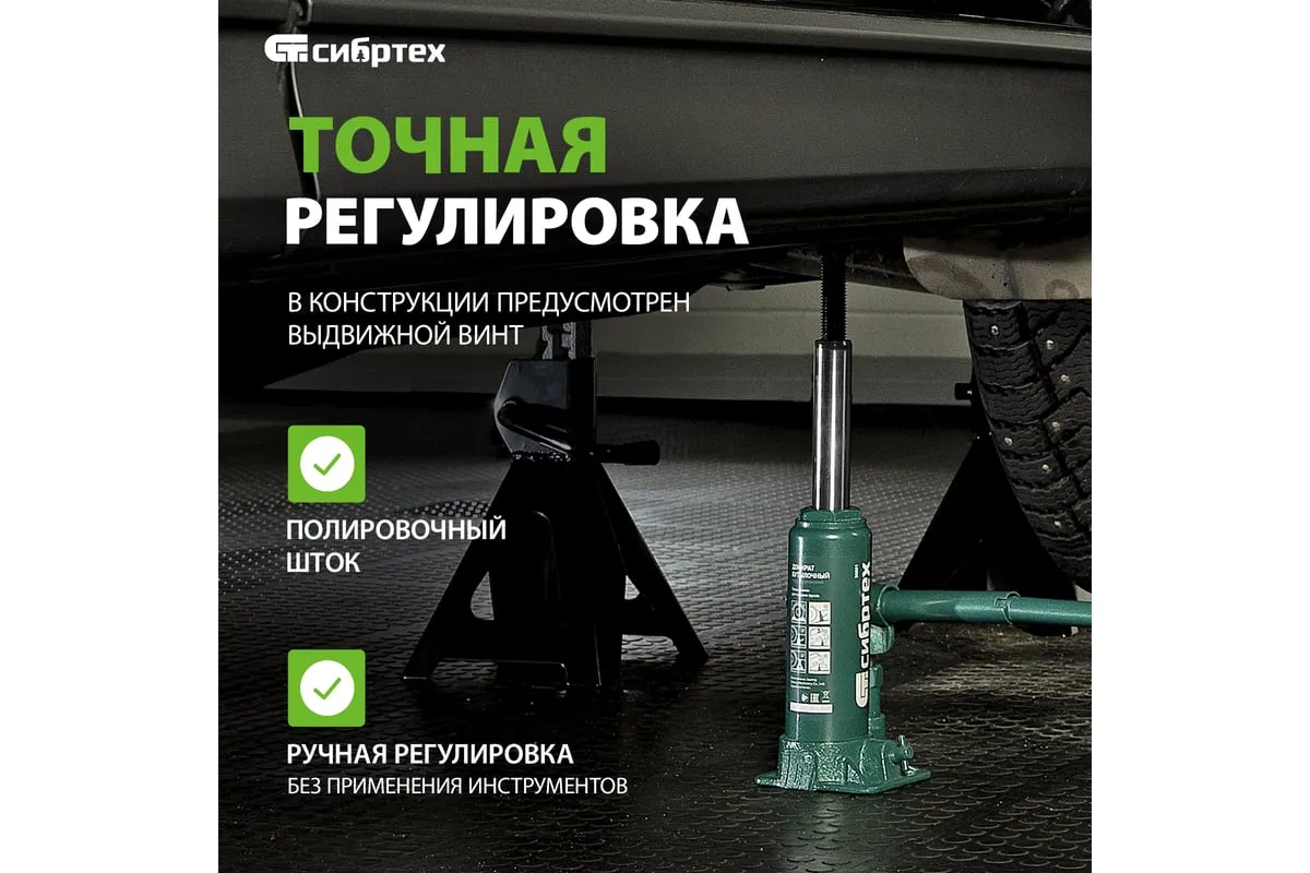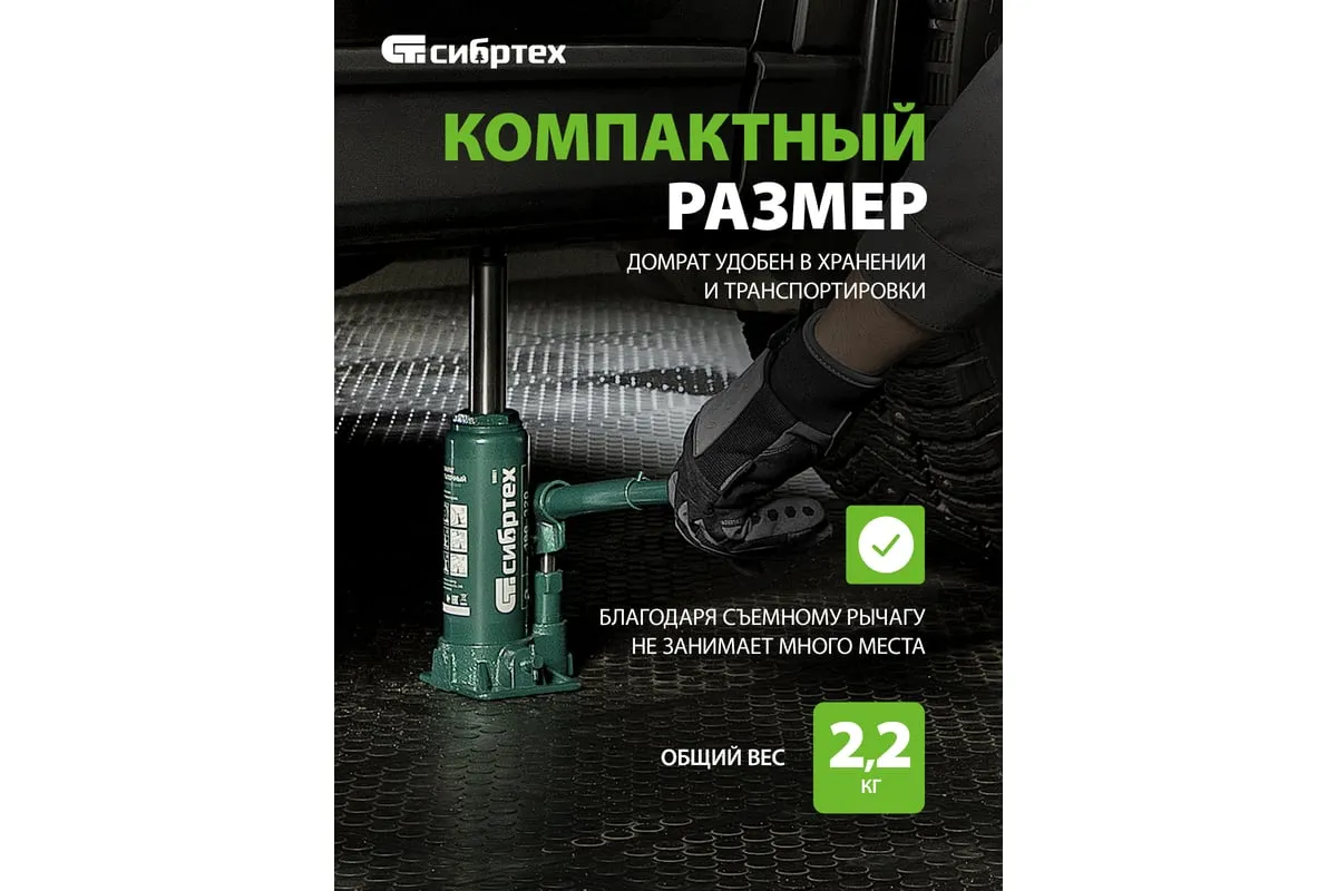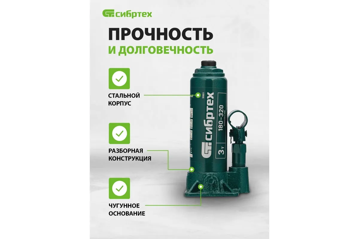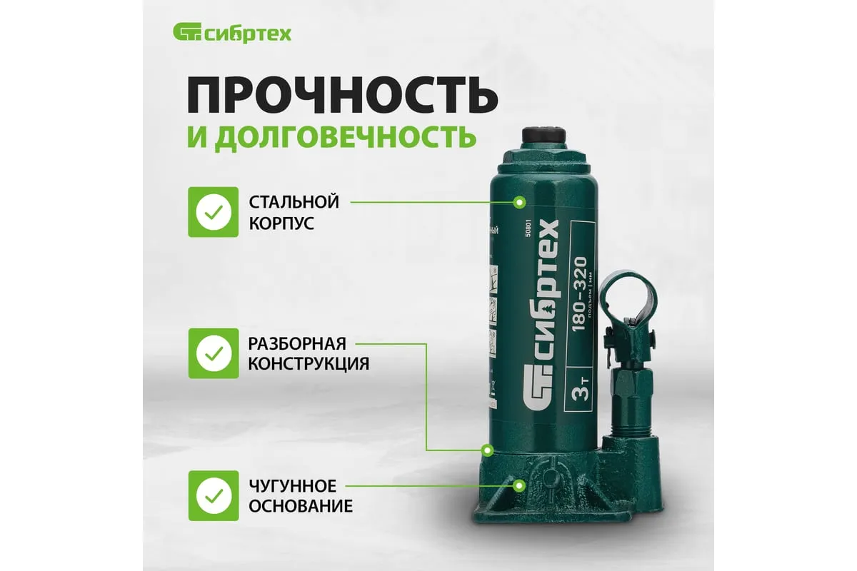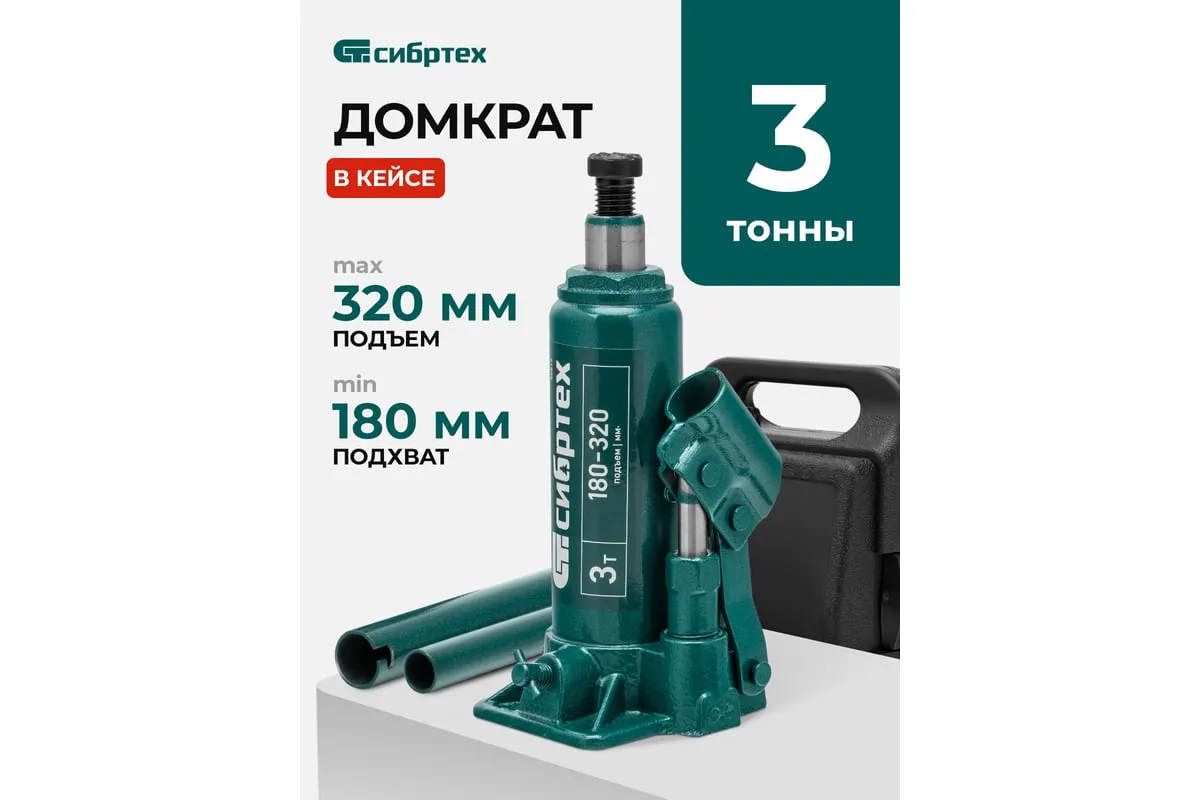 Домкрат гидравлический бутылочный Сибртех 50813, поставляющийся в пластиковом кейсе, предназначен для подъема грузов массой до 3 т на высоту от 180 до 320 мм. Не требует больших усилий от пользователя и значительно облегчает рабочий процесс. Домкрат будет полезен при проведении техобслуживания машины в автосервисе или гараже