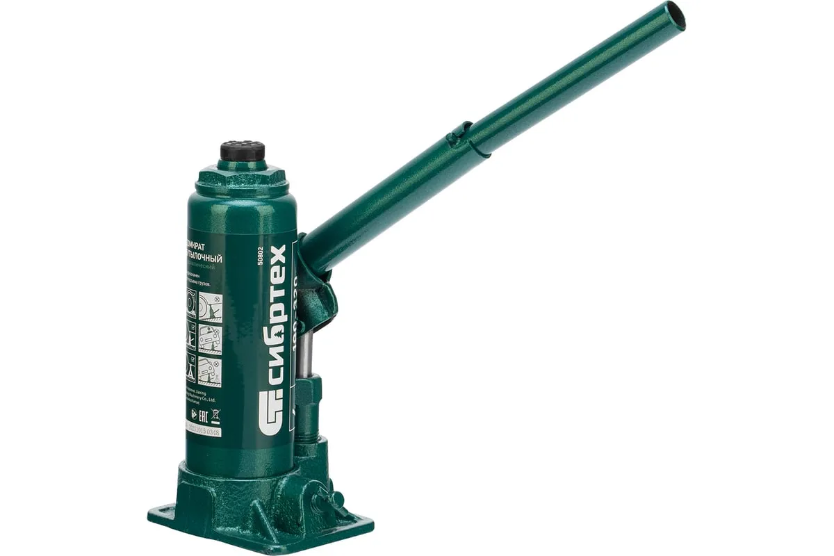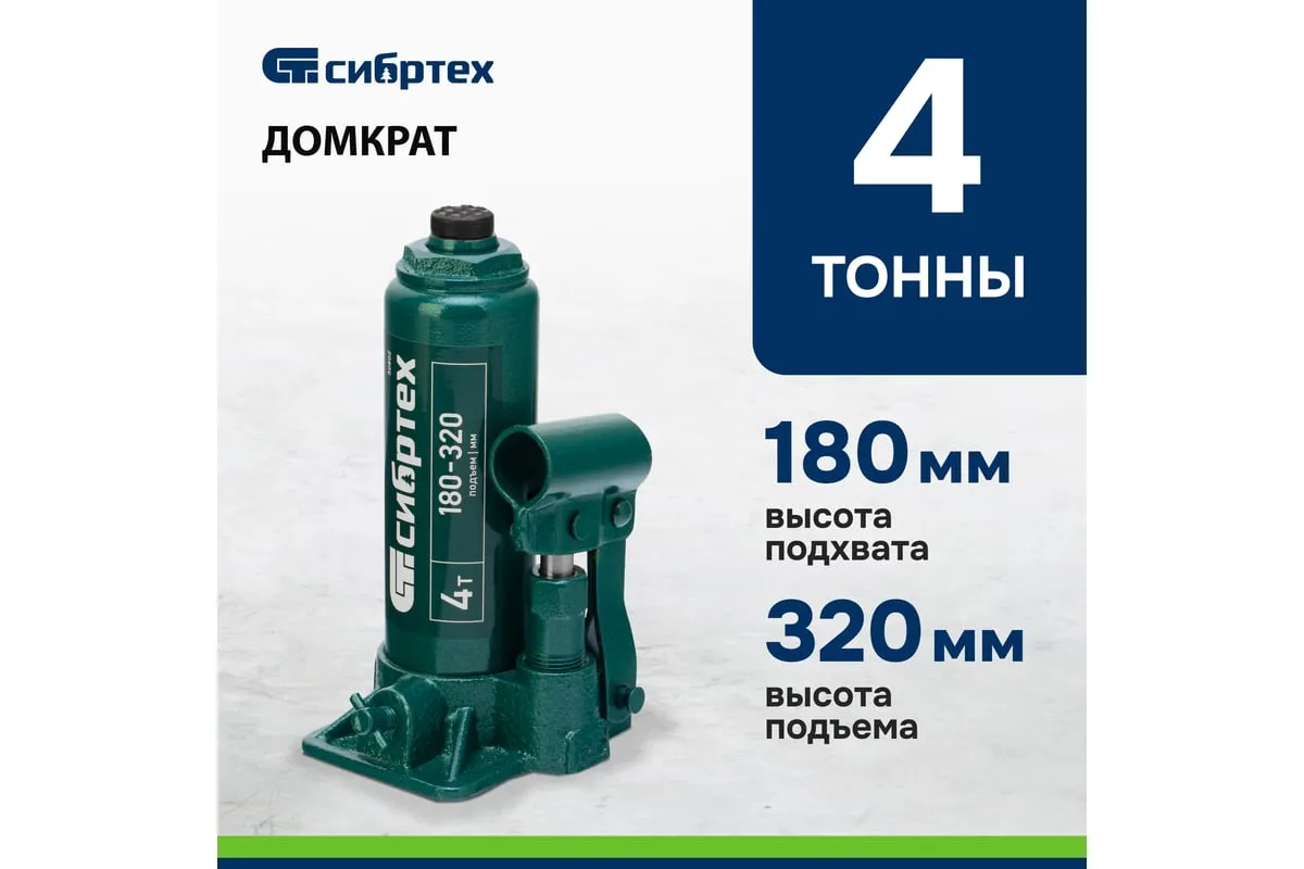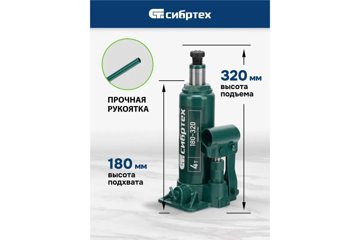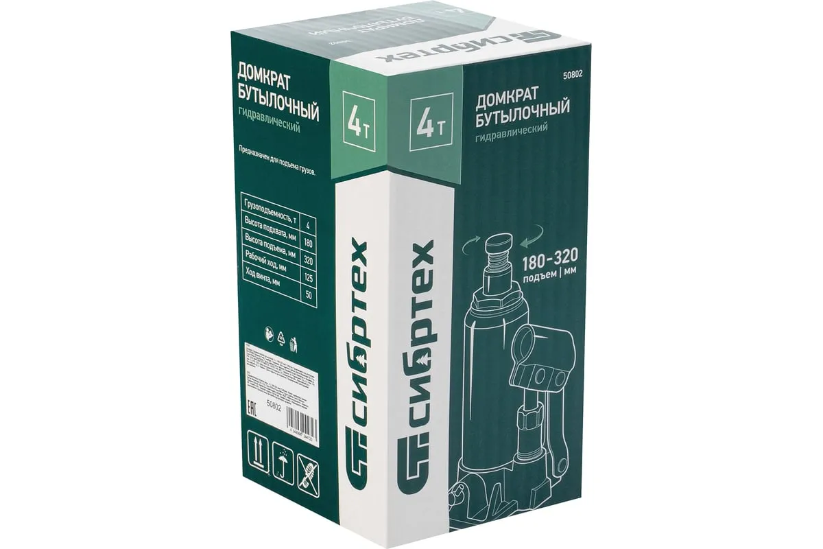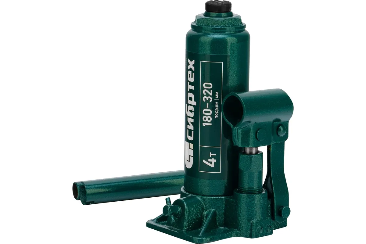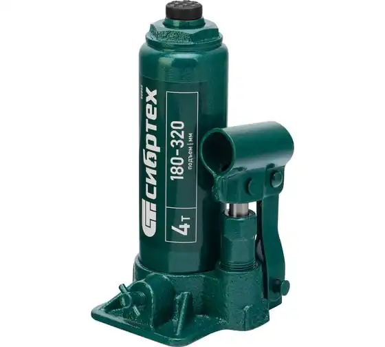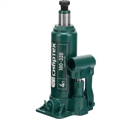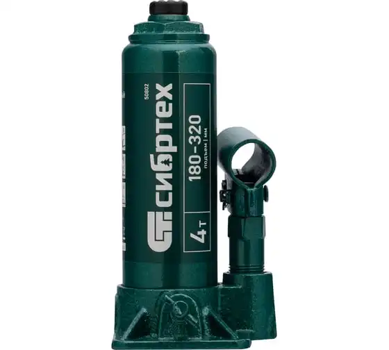 Домкрат гидравлический бутылочный Сибртех 50802 предназначен для подъема грузов массой до 4 т на высоту от 180 до 320 мм. Не требует больших усилий от пользователя и значительно облегчает рабочий процесс. Домкрат будет полезен при проведении техобслуживания машины в автосервисе или гараже.
