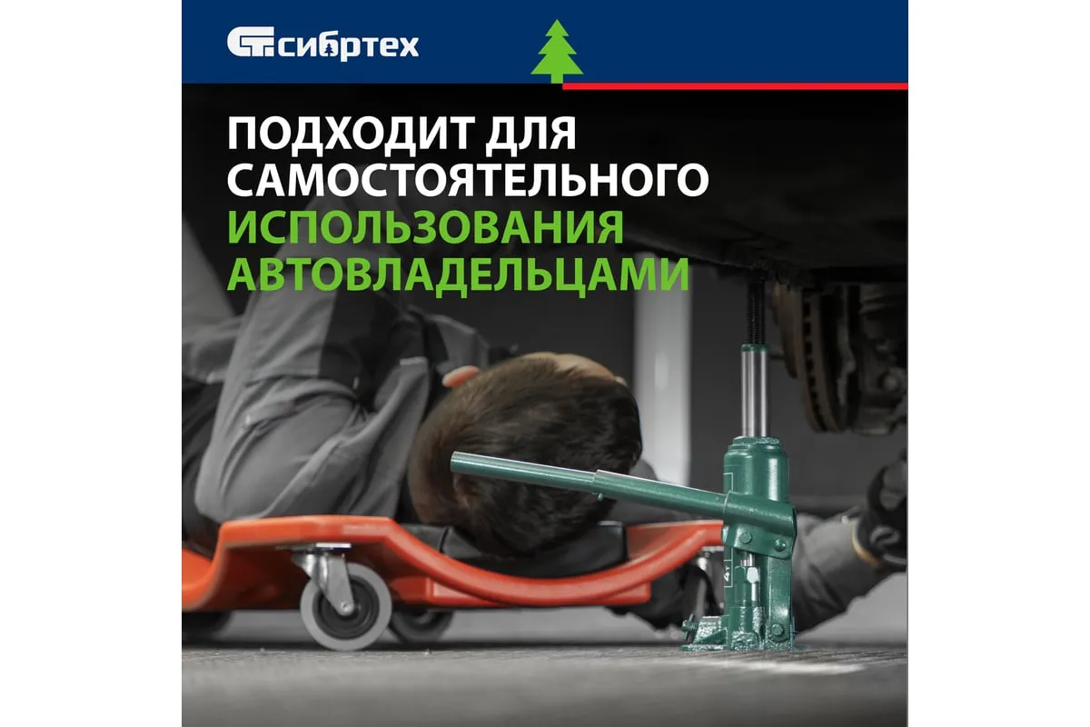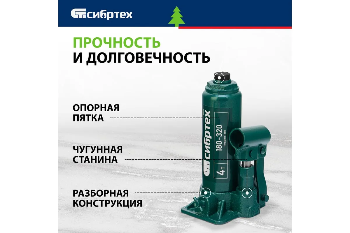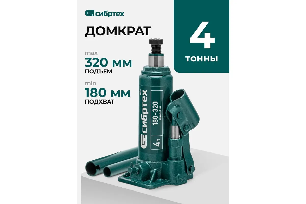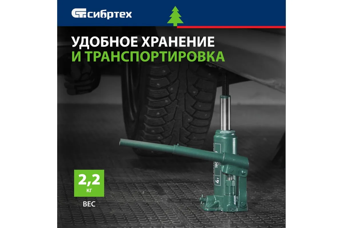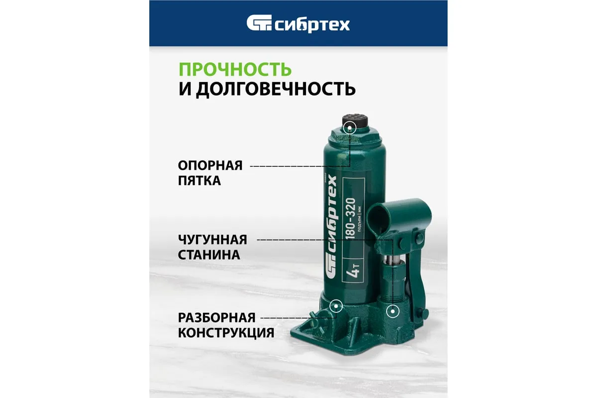 Домкрат гидравлический бутылочный Сибртех 50802 предназначен для подъема грузов массой до 4 т на высоту от 180 до 320 мм. Не требует больших усилий от пользователя и значительно облегчает рабочий процесс. Домкрат будет полезен при проведении техобслуживания машины в автосервисе или гараже.