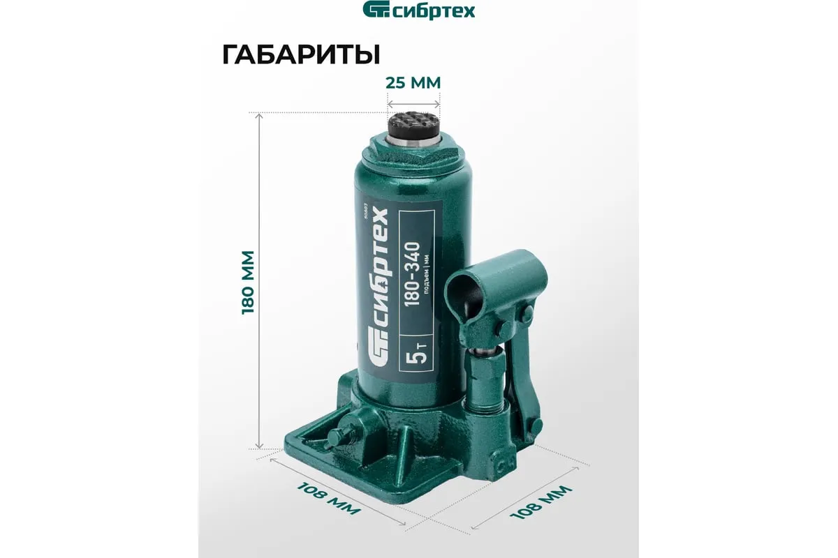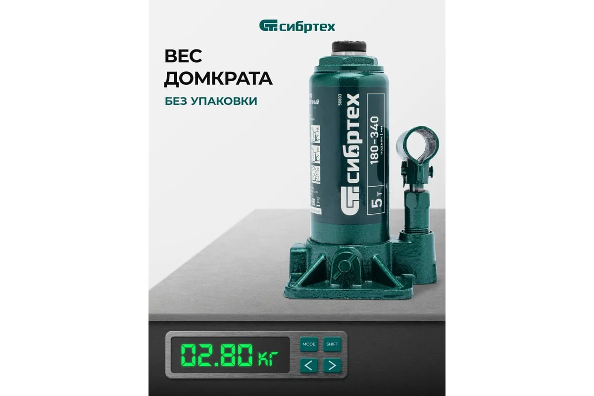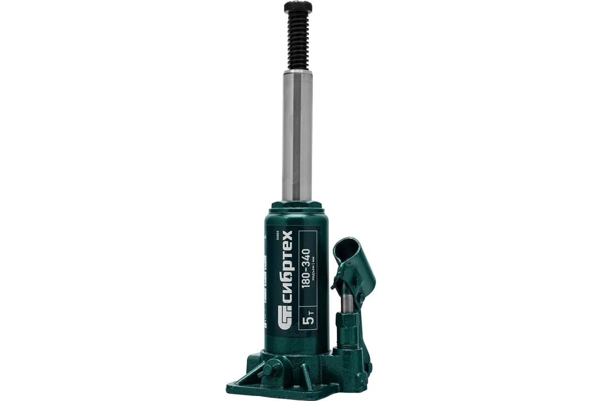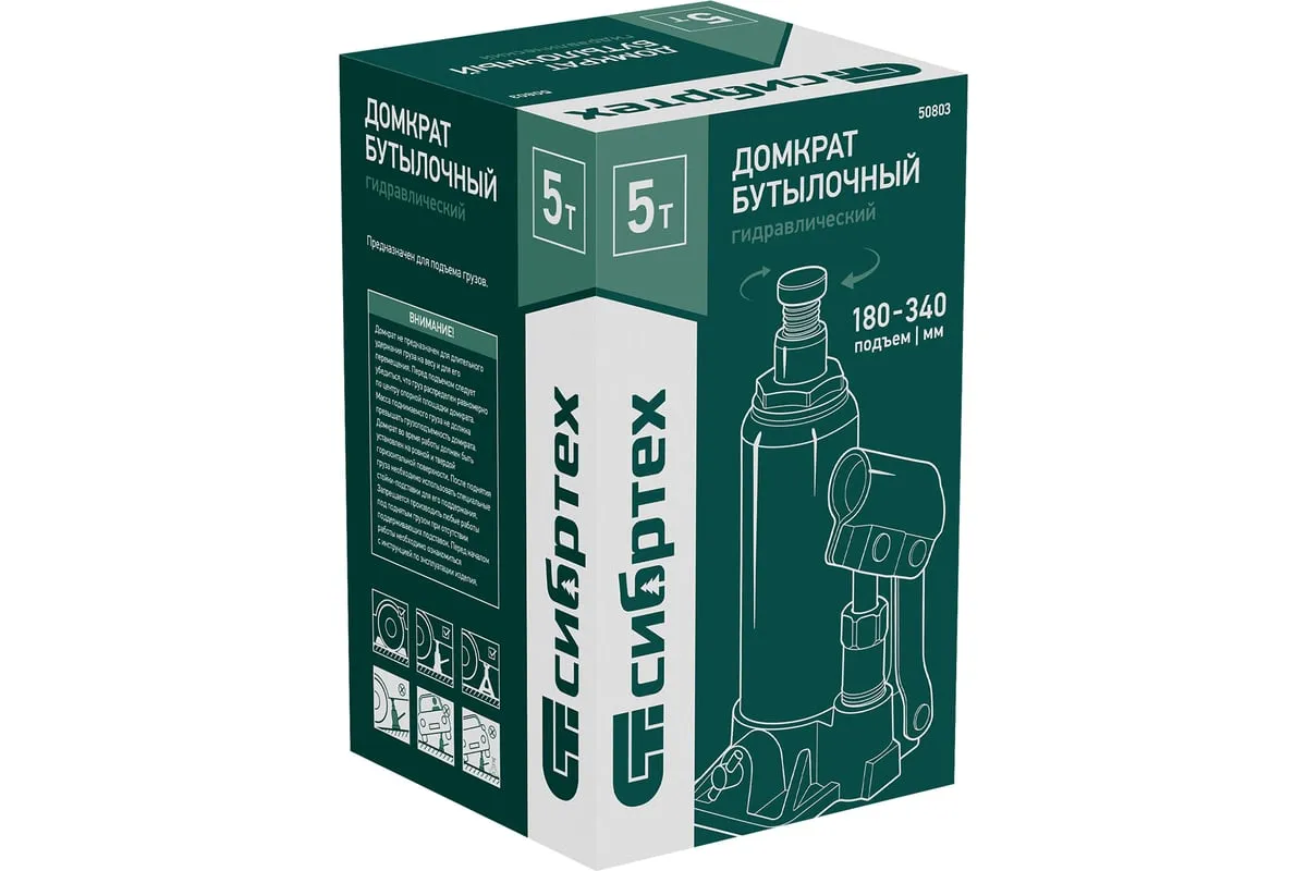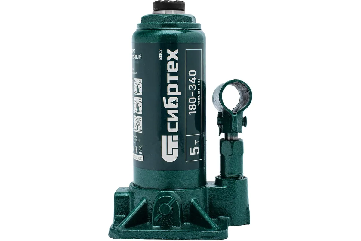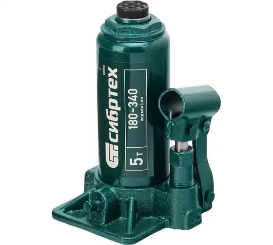 Домкрат гидравлический бутылочный Сибртех 50803 предназначен для подъема грузов массой до 5 т на высоту от 180 до 340 мм. Не требует больших усилий от пользователя и значительно облегчает рабочий процесс. Домкрат будет полезен при проведении техобслуживания машины в автосервисе или гараже.