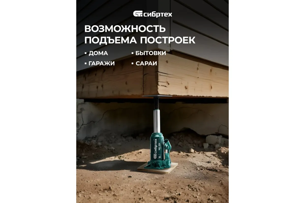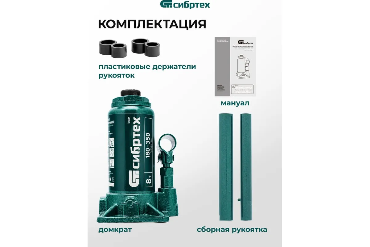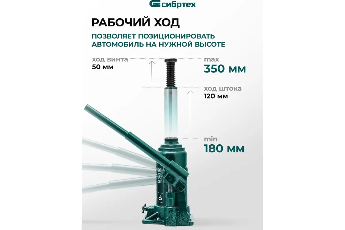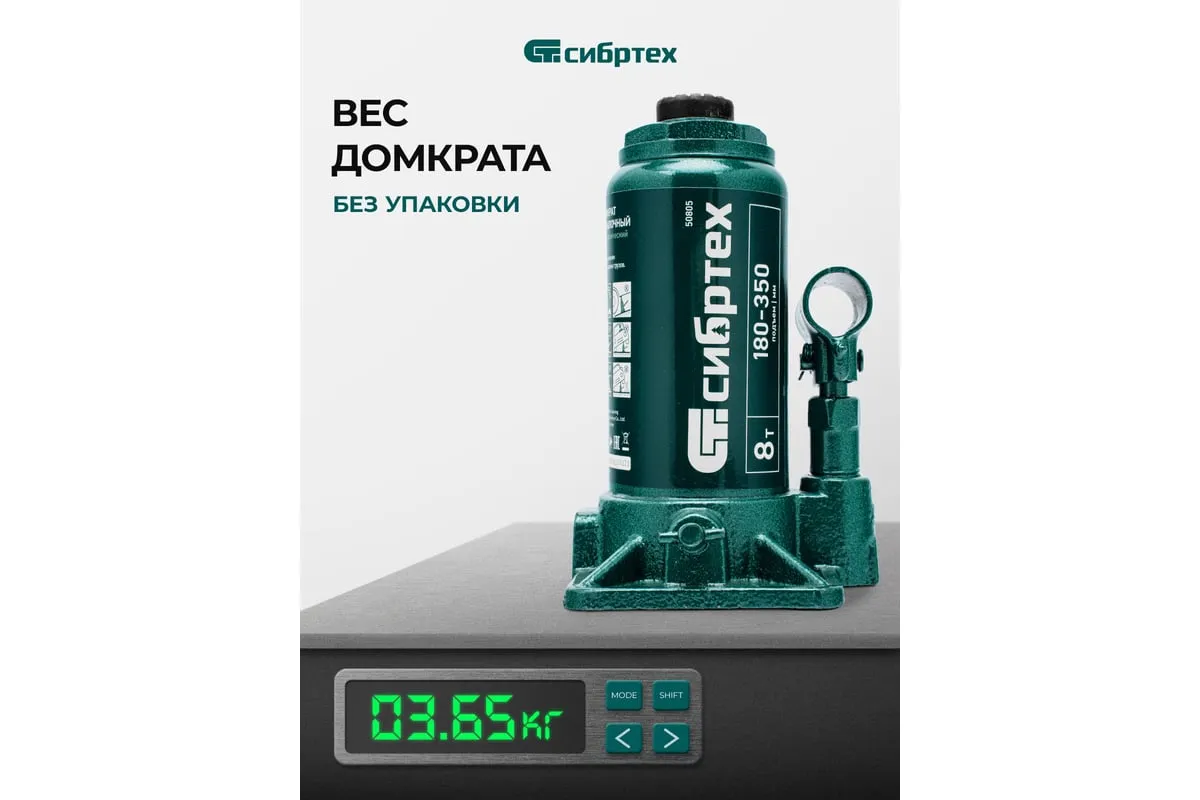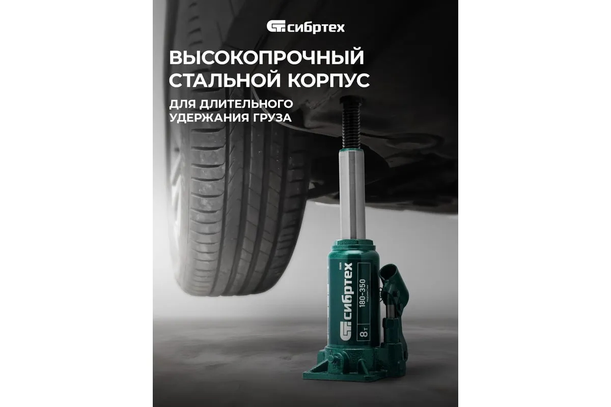 Домкрат гидравлический бутылочный Сибртех 50805 предназначен для подъема грузов массой до 8 т на высоту от 180 до 350 мм. Не требует больших усилий от пользователя и значительно облегчает рабочий процесс. Домкрат будет полезен при проведении техобслуживания машины в автосервисе или гараже.