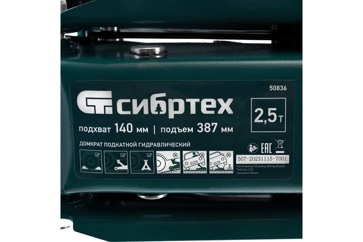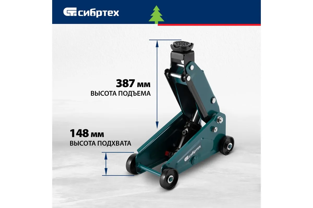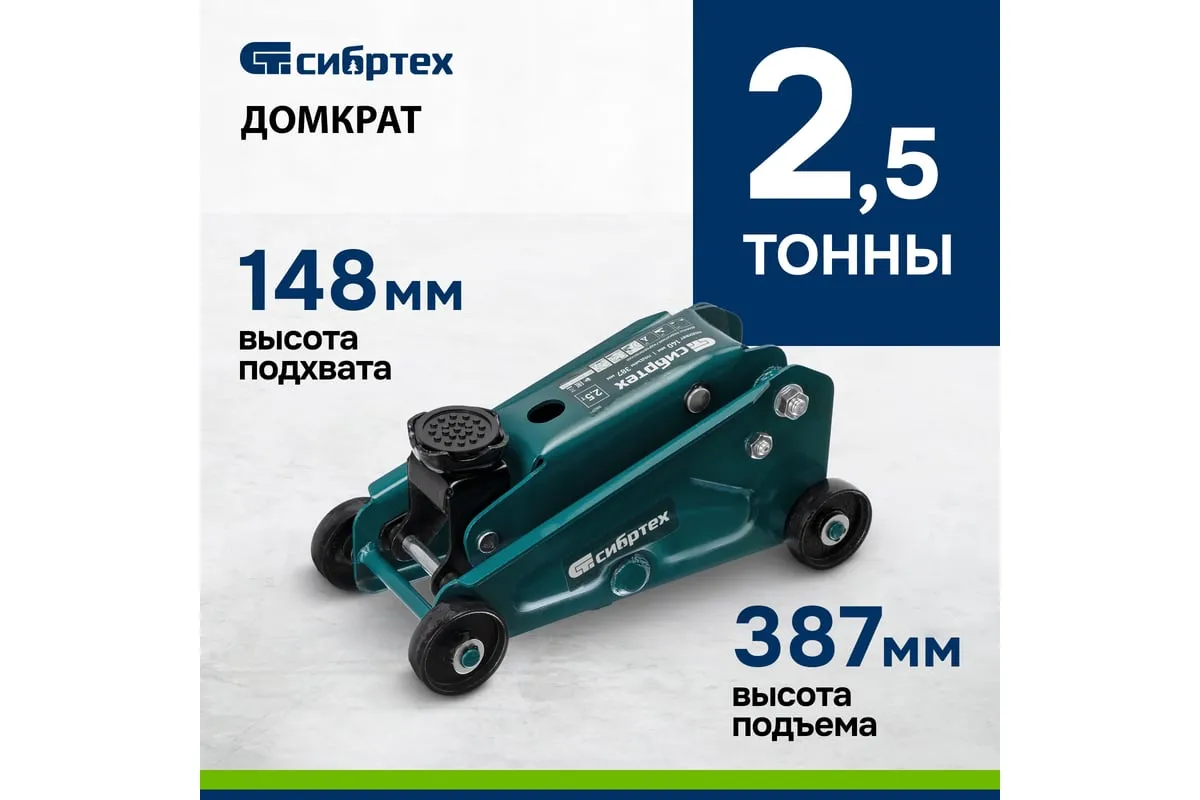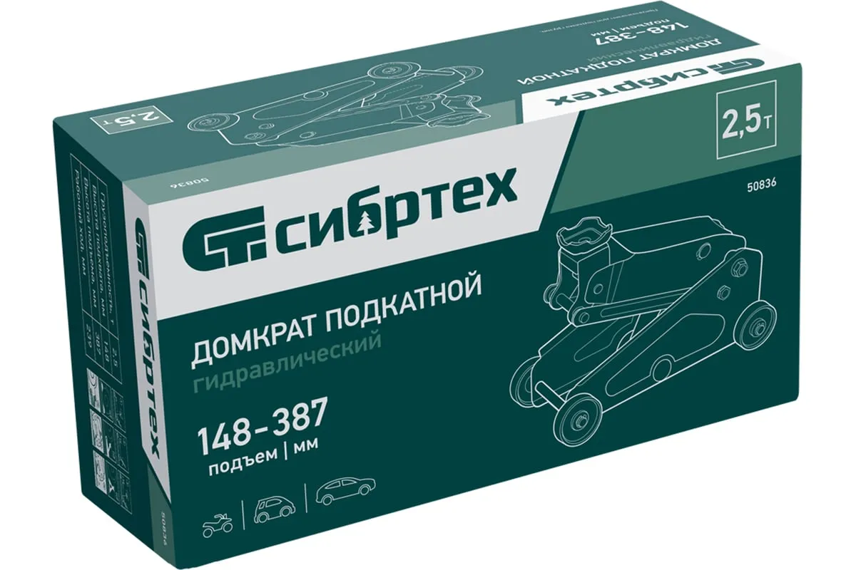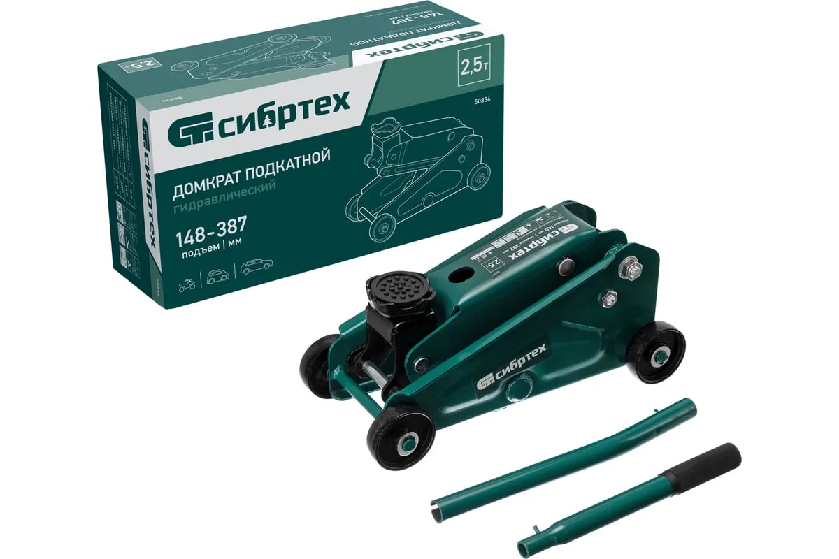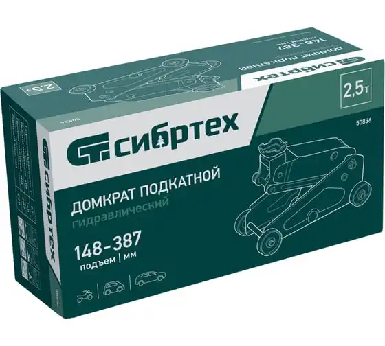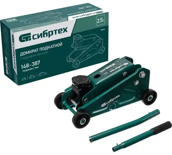 Гидравлический подкатной домкрат Сибртех 50836 с высотой подхвата 148 мм предназначен для подъема грузов массой до 2,5 т на высоту до 387 мм. Применяется для обслуживания автомобилей со стандартным клиренсом. Компактный домкрат подходит для самостоятельного использования автовладельцами.