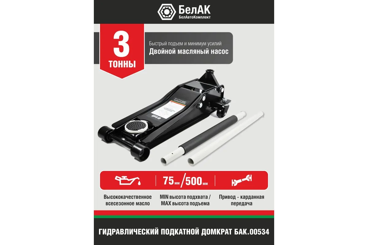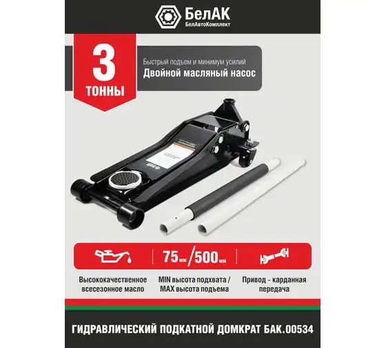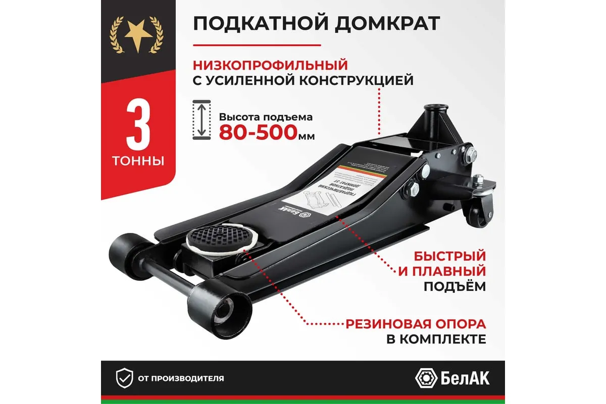 Домкрат подкатной низкоподхватный 3 тонны "БелАК" БАК.00534 идеально подойдет для ремонтно-монтажных работ в гараже, СТО, автопарках.