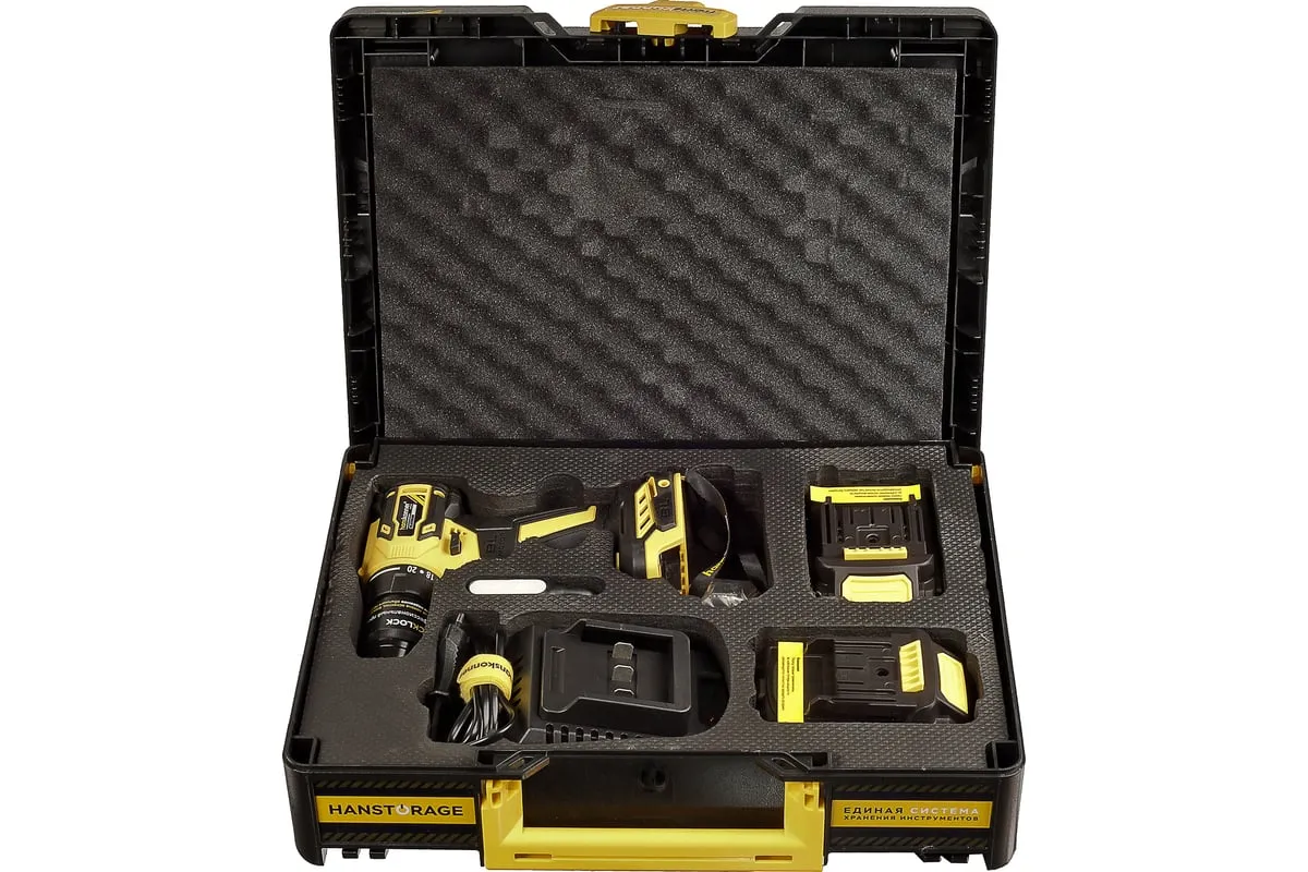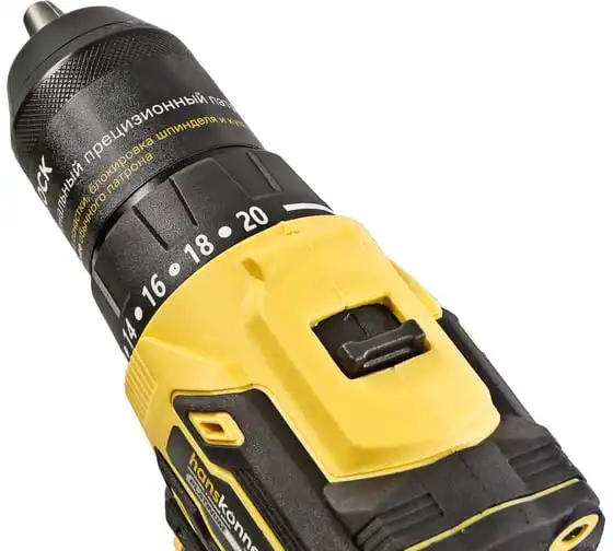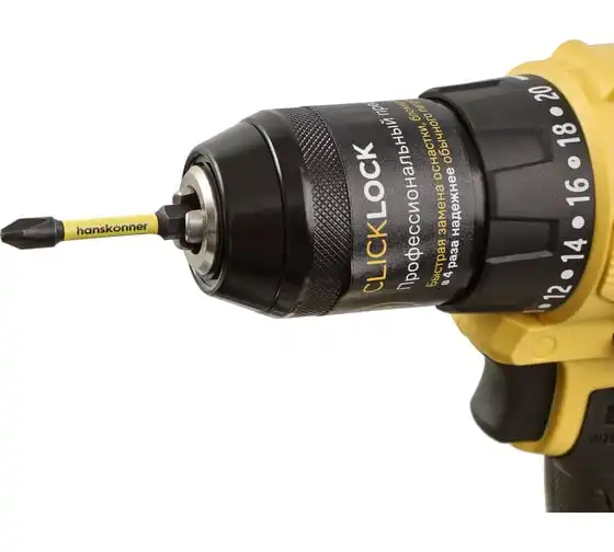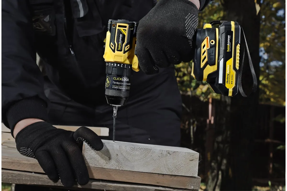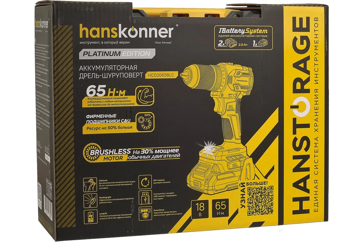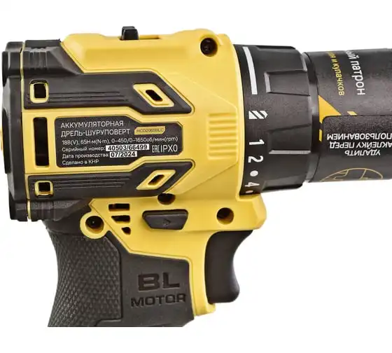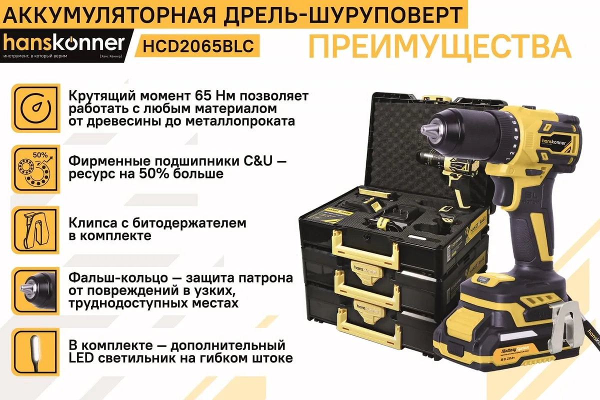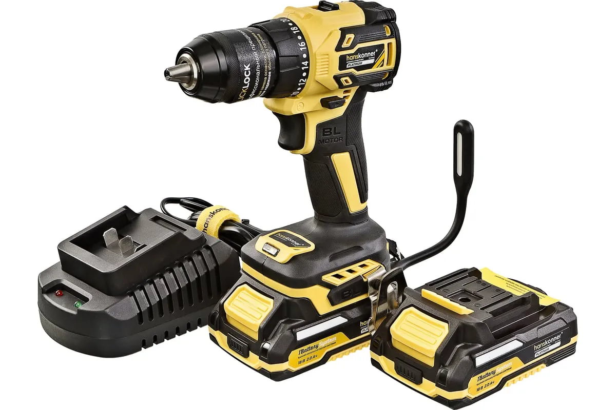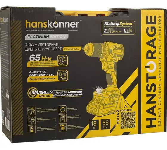 Аккумуляторная дрель-шуруповерт Hanskonner HCD2065BLC подходит для любых работ, в том числе в стесненных условиях и труднодоступных местах без снижения производительности и потери качества работ. Крутящий момент 65 Нм позволяет работать с любым материалом от древесины до металлопроката. Компактный и легкий бесщеточный двигатель имеет наиболее выгодные параметры работы: Усиленный цельнометаллический патрон с диаметром захвата 13 мм расширяет набор применения оснастки для выполнения работ с повышенной нагрузкой. 20 ступеней крутящего момента, режим сверления и режим сверления с ударом позволяют устанавливать любой крепеж без его повреждения и вдавливания в материал. Данная модель является частью системы 1BatterySystem и совместима со всей линейкой аккумуляторного инструмента. Два Li-Ion аккумулятора 2.0 Ач с собственной системой защиты от перегрузки, перегрева и глубокого разряда обеспечат полную непрерывность в работе. Функция быстрой зарядки зарядного устройства полностью восстановит работоспособность аккумулятора 2.0 Ач всего за 50 минут. Аккумулятор с выходом USB позволит подзарядить ваш гаджет.