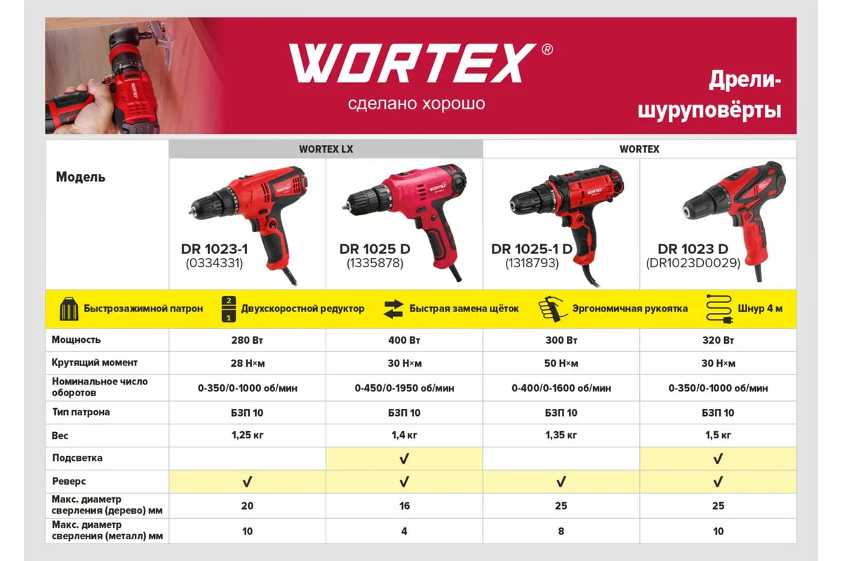 Дрель-шуруповерт WORTEX - это эффективный инструмент для множества задач домашнего использования. Обладает быстрозажимным патроном, который обеспечивает быструю замену насадок, двухскоростным редуктором, который позволяет выбрать оптимальную скорость вращения для различных материалов.