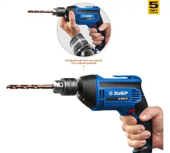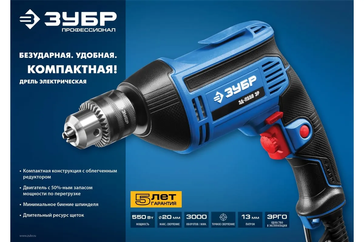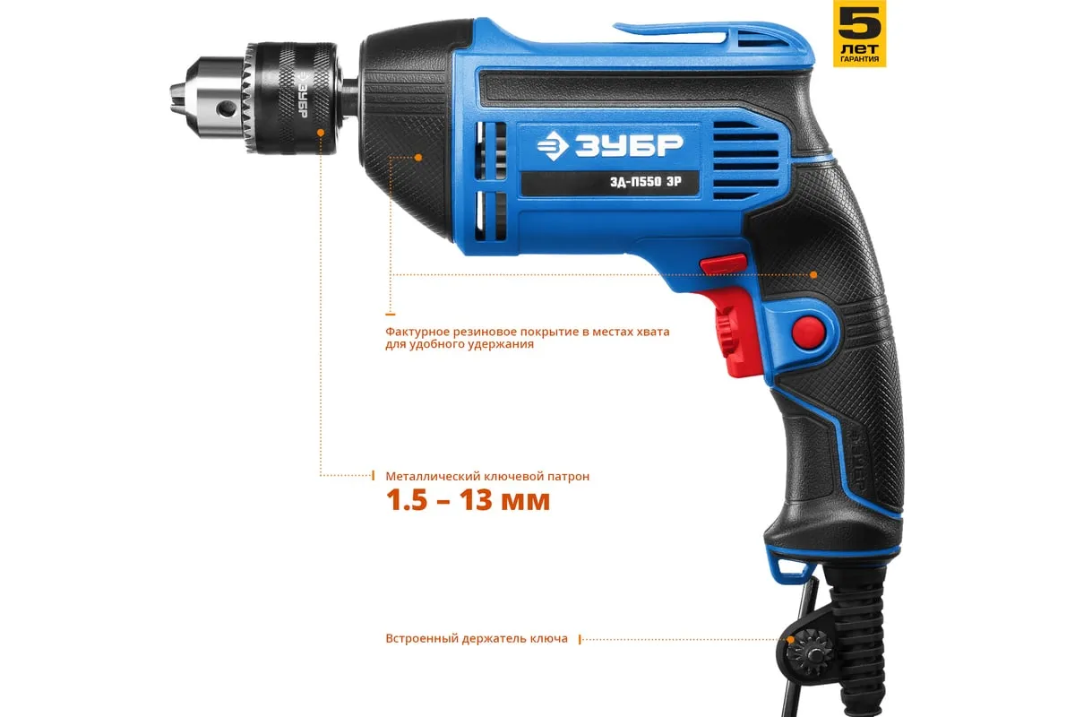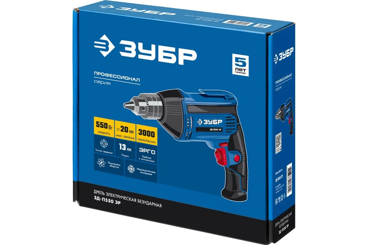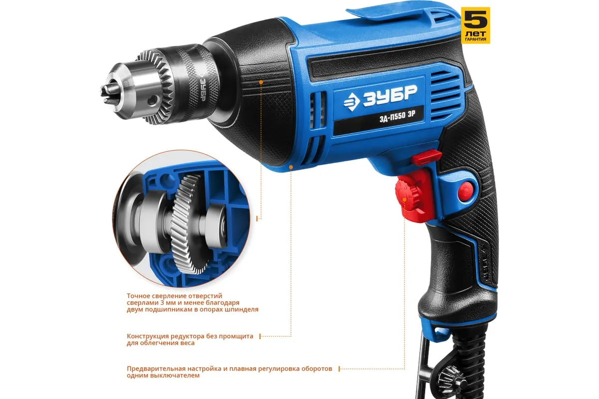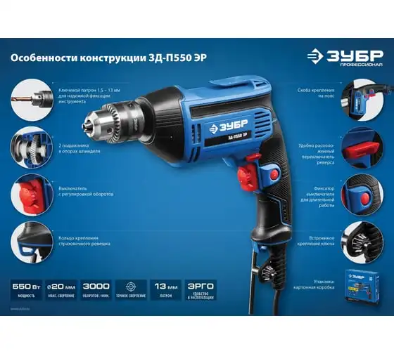 Дрель Зубр ПРОФЕССИОНАЛ ЗД-П550 ЭР применяется для сверления отверстий в древесине и металле, а так же заворачивания крепежа. При оснащении соответствующими насадками возможно перемешивание ЛКМ. Подшипники в опорах шпинделя позволяют производитьточное сверление отверстийсверлами 3 мм и менее. Конструкция редуктора без промщитазначительно облегчает вес инструмента. Фиксация выключателя во включенном положении обеспечиваетудобство при продолжительной работе. Благодаря встроенной клипсе дрельможно закрепить на поясе.
