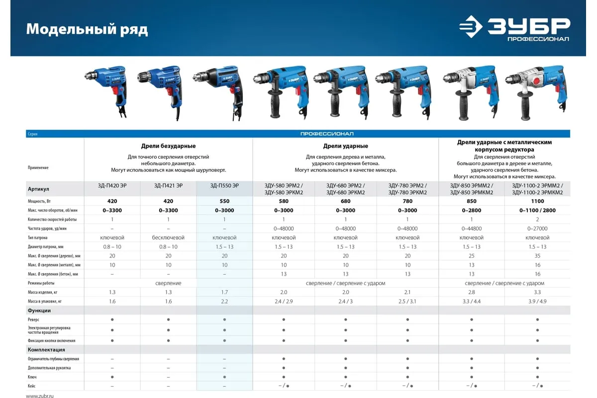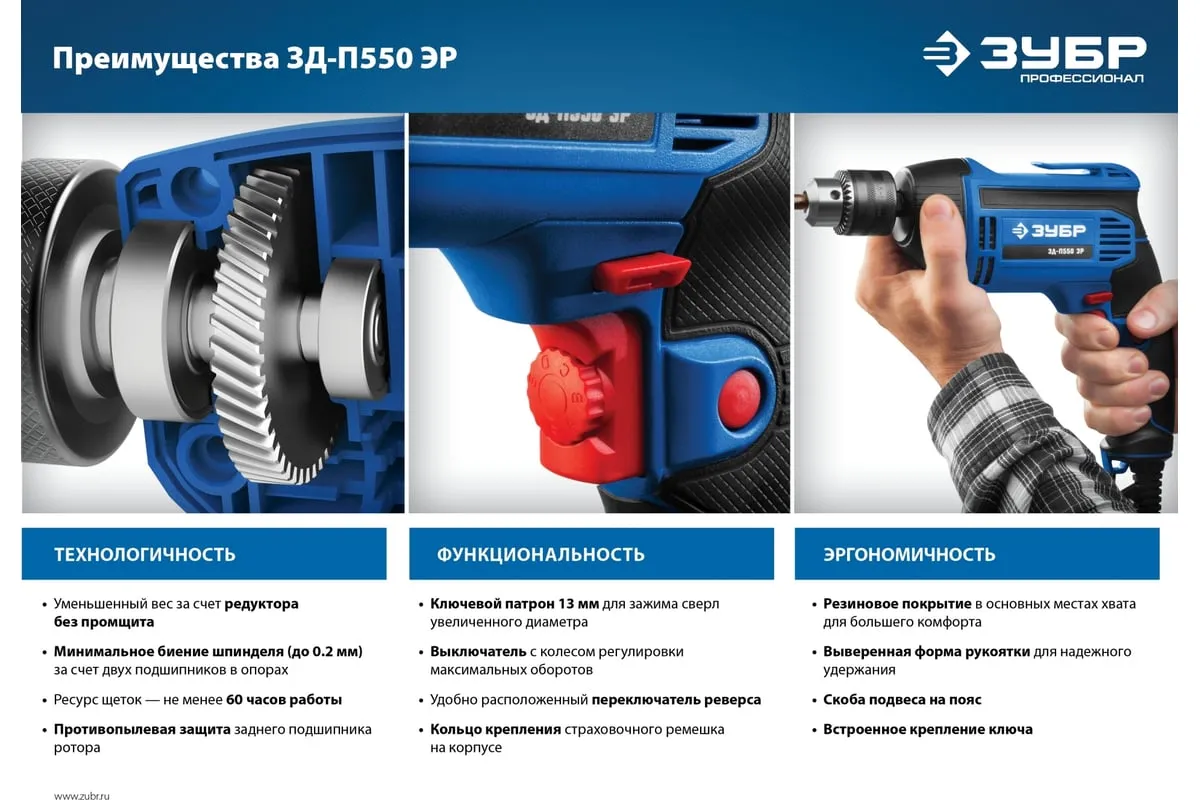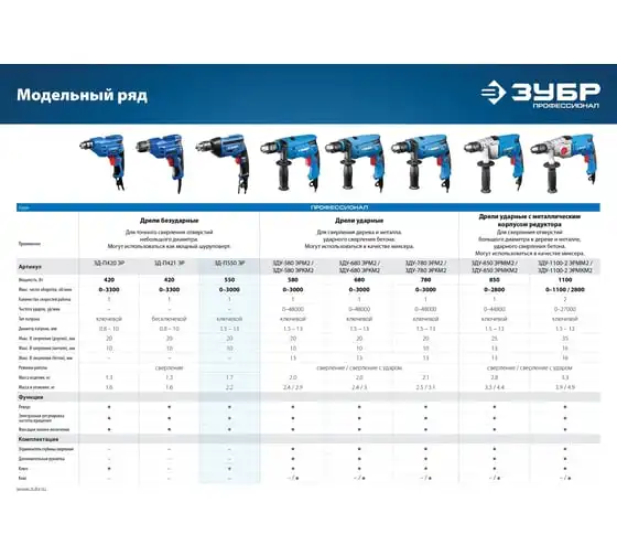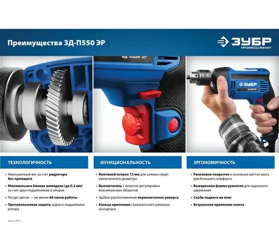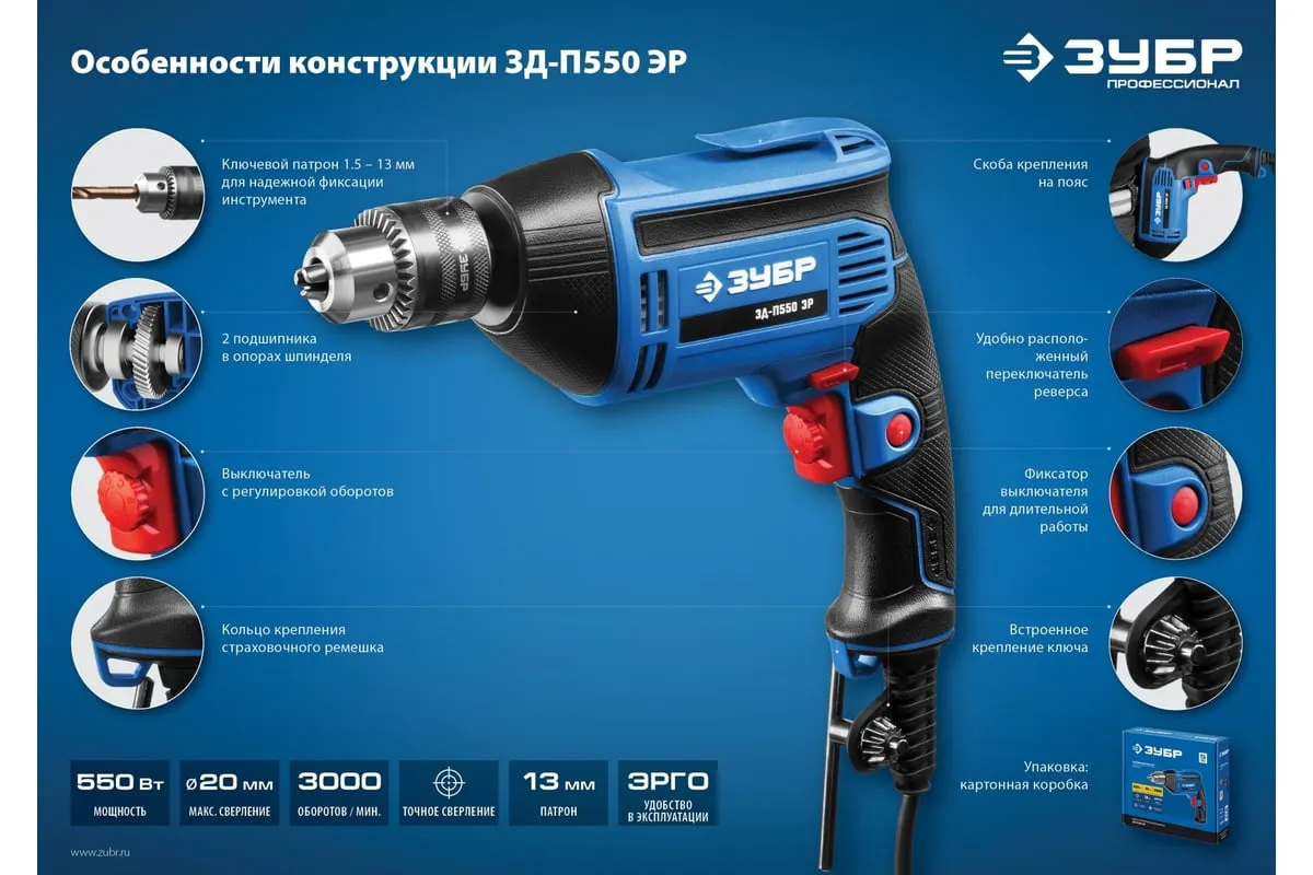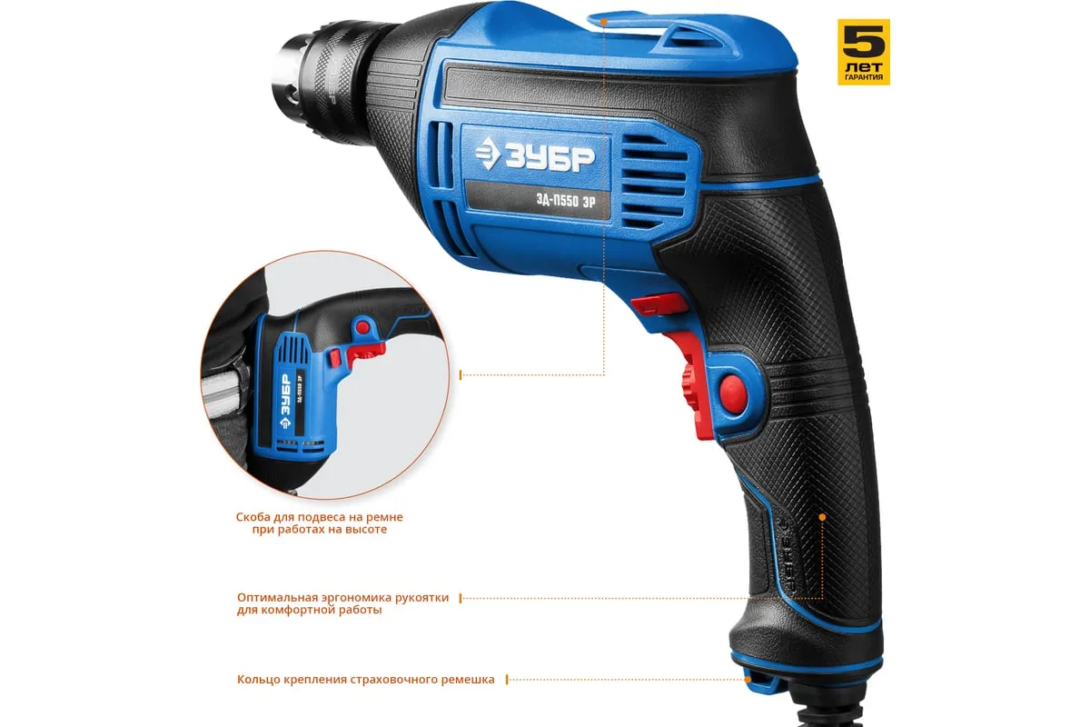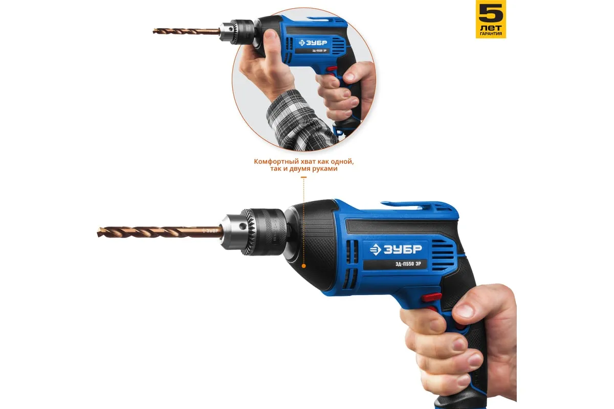 Дрель Зубр ПРОФЕССИОНАЛ ЗД-П550 ЭР применяется для сверления отверстий в древесине и металле, а так же заворачивания крепежа. При оснащении соответствующими насадками возможно перемешивание ЛКМ. Подшипники в опорах шпинделя позволяют производитьточное сверление отверстийсверлами 3 мм и менее. Конструкция редуктора без промщитазначительно облегчает вес инструмента. Фиксация выключателя во включенном положении обеспечиваетудобство при продолжительной работе. Благодаря встроенной клипсе дрельможно закрепить на поясе.