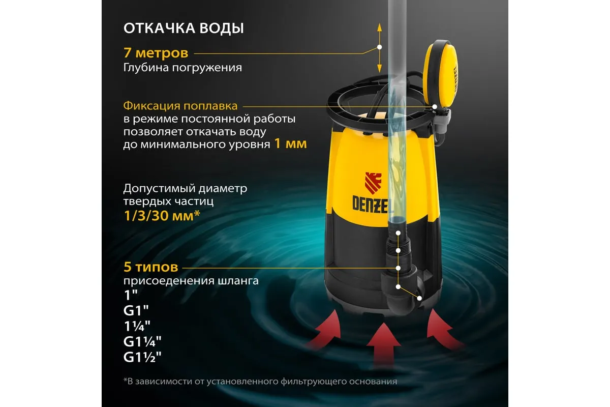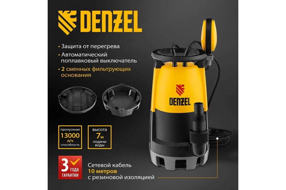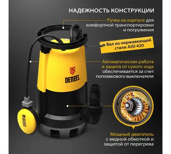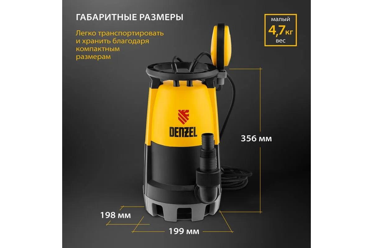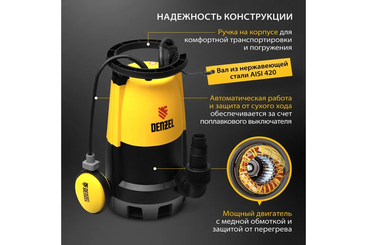 Дренажный насос для чистой и грязной воды DENZEL DP-600S 97268 используется для откачки жидкости из затопленных помещений, а также для организации полива и подачи воды из колодцев и открытых водоемов.