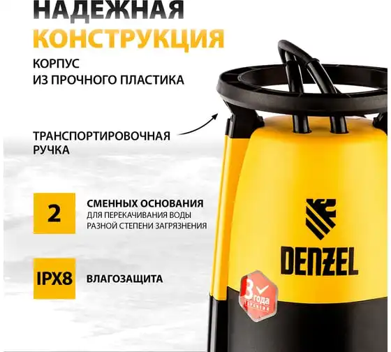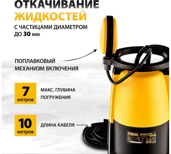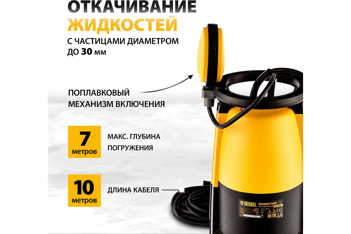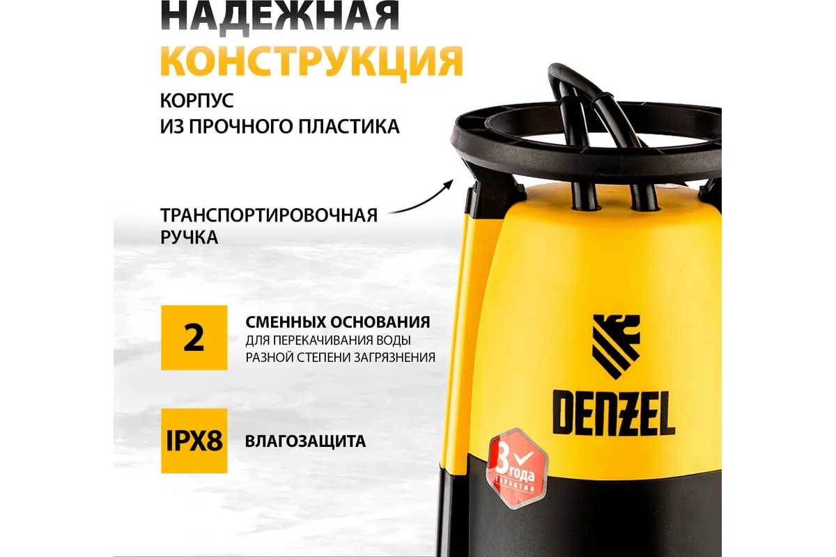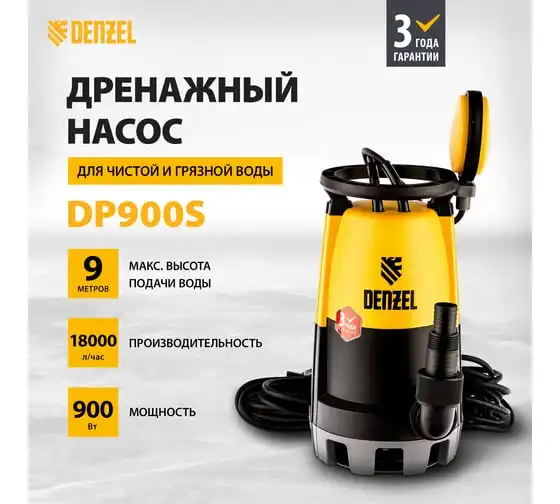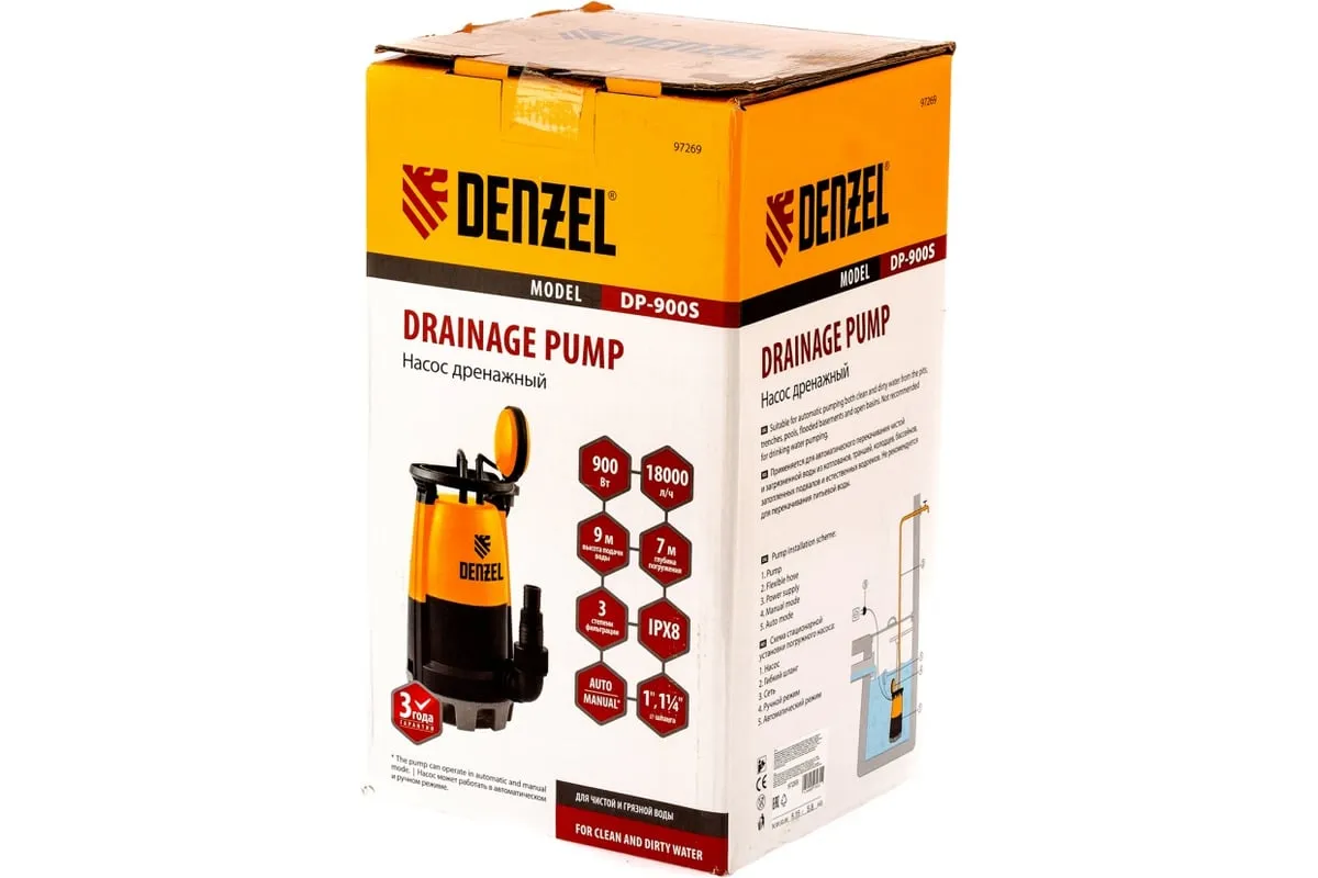 Дренажный насос для чистой и грязной воды DENZEL DP-900S 97269 используется для откачки жидкости из затопленных помещений, а также для организации полива и подачи воды из колодцев и открытых водоемов.