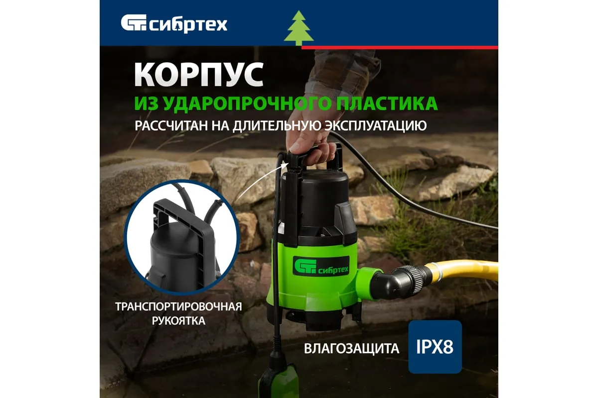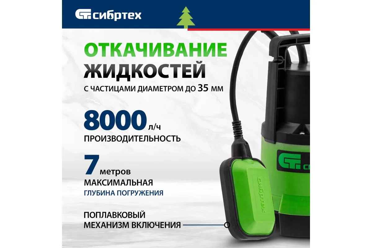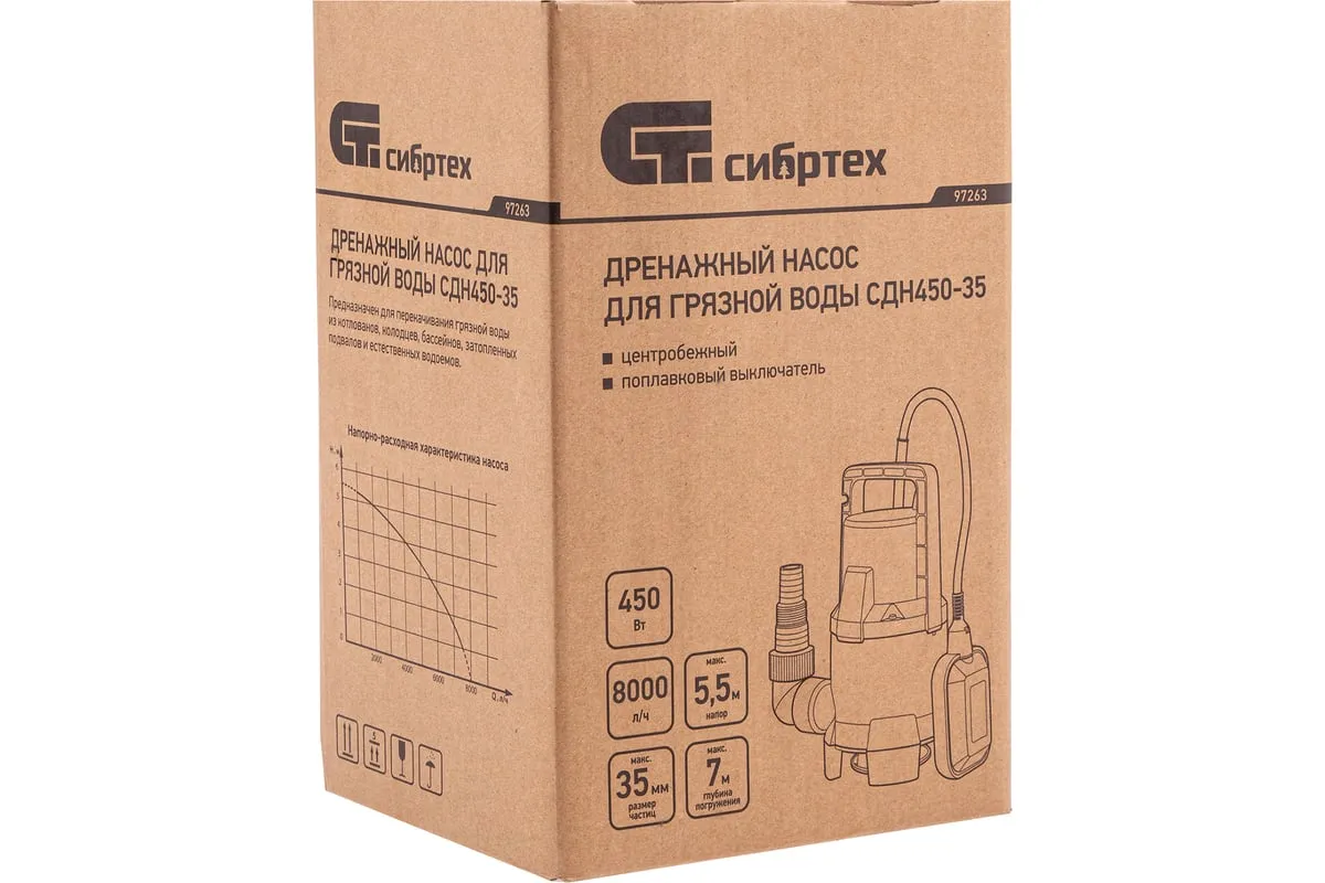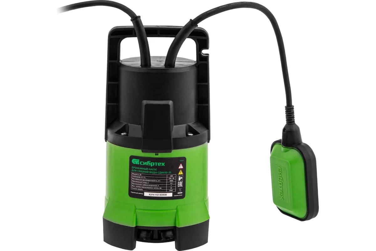 Дренажный насос для грязной воды СИБРТЕХ СДН450-35 97263 - агрегат для перекачивания бытовых загрязненных и сточных вод с диаметром взвешенных частиц не более 35 мм. Ударопрочный корпус из пластика способен выдержать небольшие механические повреждения, что гарантируетнадежность. Долгий срок службы. Поплавковый выключатель предохраняет насос от работы вхолостую, что продлевает срок его эксплуатации. Способен поднимать воду на высоту до 5.5 м, что говорит овысокой производительности.