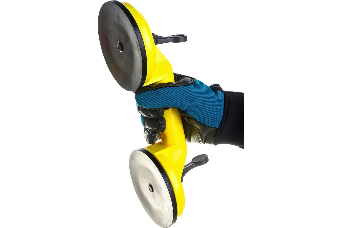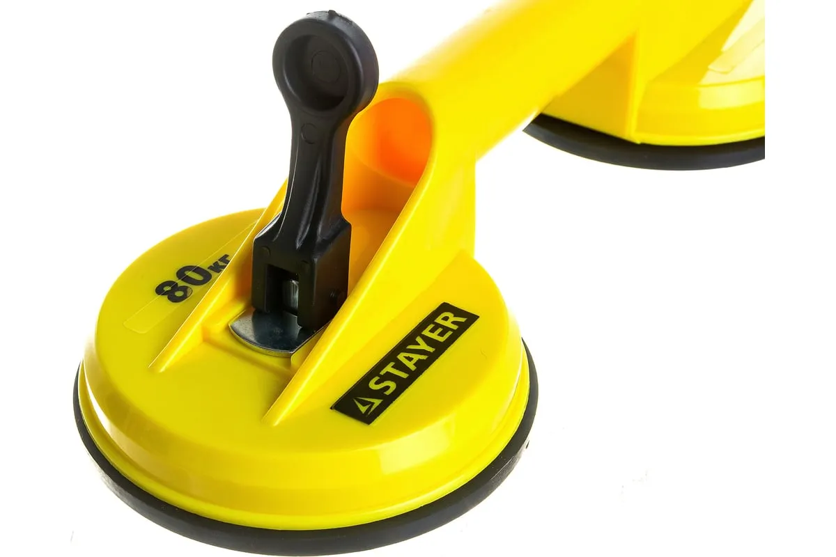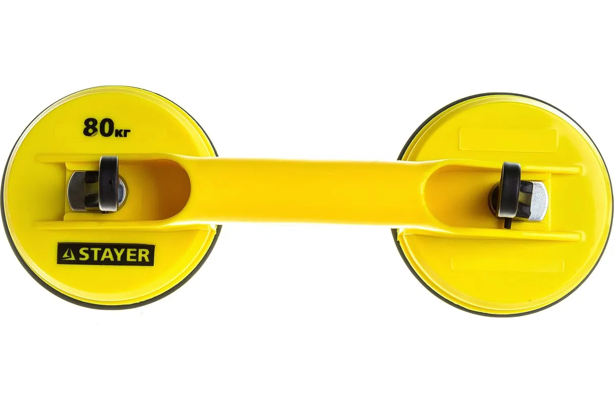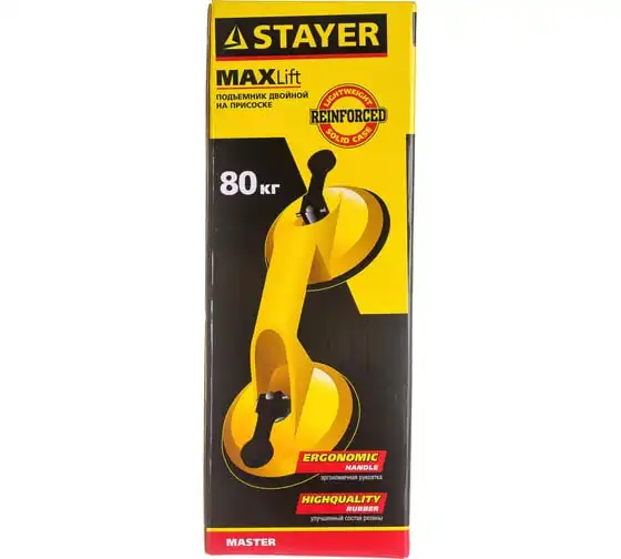Двойной пластмассовый стеклодомкрат STAYER MASTER MAXLift 80кг 33718-2 - это специальное приспособление, которое используют при транспортировке стекол, зеркал и других подобных изделий, а также заготовок с гладкой поверхностью. Резиновое нескользящее основание прочно фиксируется на предмете по вакуумному принципу и поднимается посредством двух эргономичных рукояткой. Несмотря на малый вес и небольшие размеры, данная модель способна поднимать и удерживать груз весом до 80 кг.