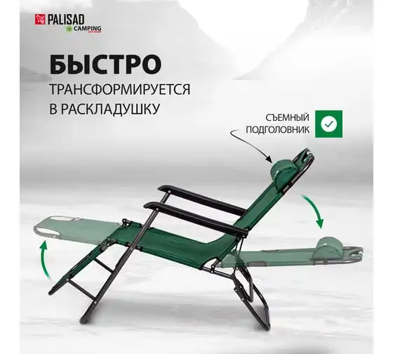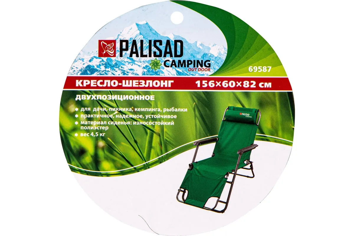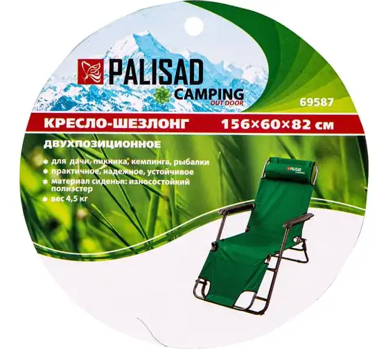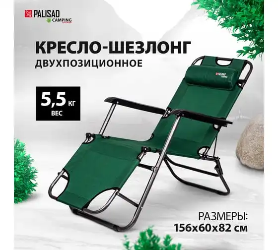 Двухпозиционное кресло-шезлонг Palisad Camping 69587 размером 156 х 60 х 82 см обеспечивает комфортный отдых на природе. Кресло можно использовать как для сидения, так и в качестве раскладушки, поэтому оно пригодится на даче для организации дополнительного спального места.