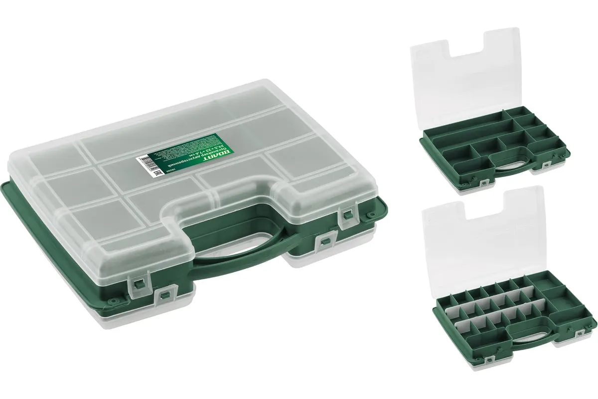 Двухсторонний органайзер ВОЛАТ 295x220x76 мм 20250 выполнен в форме кейса, имеет переставные перегородки, на одной стороне 22 отделения, на другой - 10 отделений. Служит для хранения и переноски крепежных и других мелких изделий. В органайзере удобно размещаются необходимые аксессуары и различные мелочи. Прозрачная крышка позволяет видеть расположение крепежа внутри.