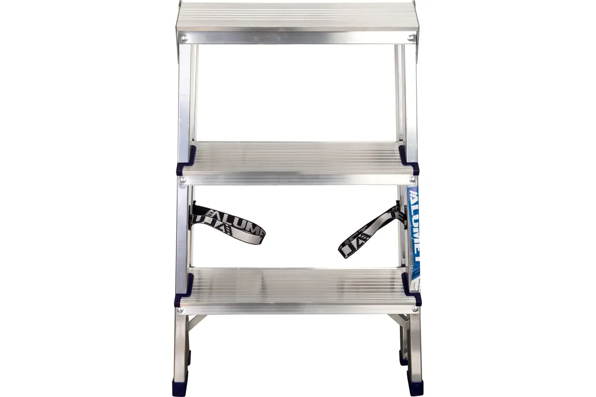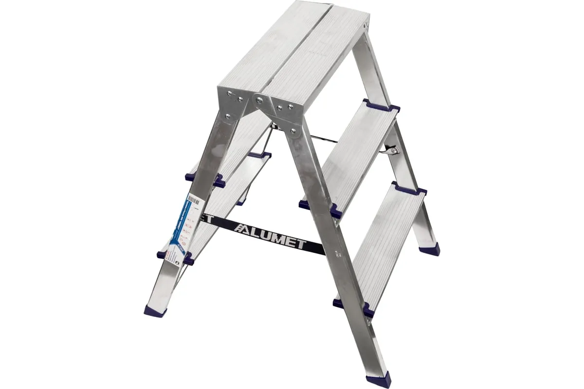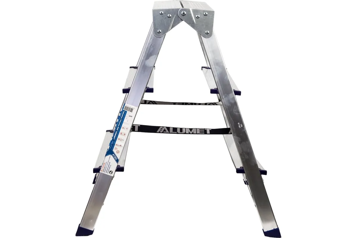 Стремянка алюминиевая двухсторонняя представляет собой свободностоящую переносную лестницу, сужающуюся к верху, имеющую две стороны для подъема на высоту.