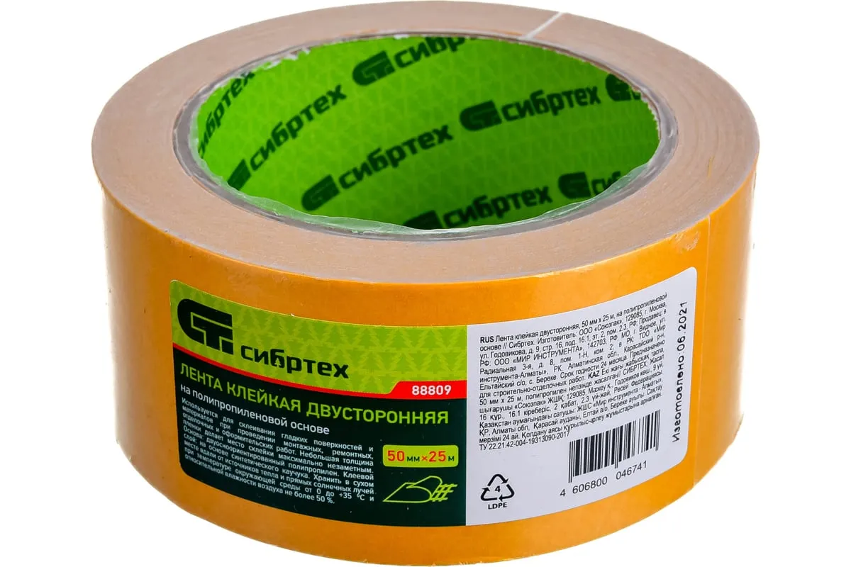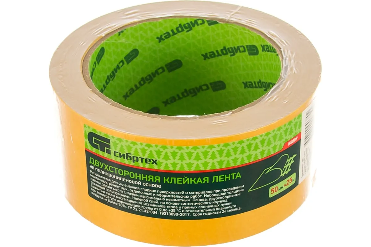 Клейкая двусторонняя лента Сибртех 88809 размером 50 мм х 25 м, на полипропиленовой основе, надежно крепится к горизонтальным и вертикальным поверхностям, которые не подвергаются сильным механическим нагрузкам. Благодаря высоким адгезионным свойствам лента подходит для работы с самыми разными материалами: картоном, деревом, пластиком, резиной, стеклом, металлом. Пригодится для занятий дизайном, а также решения различных задач в быту.