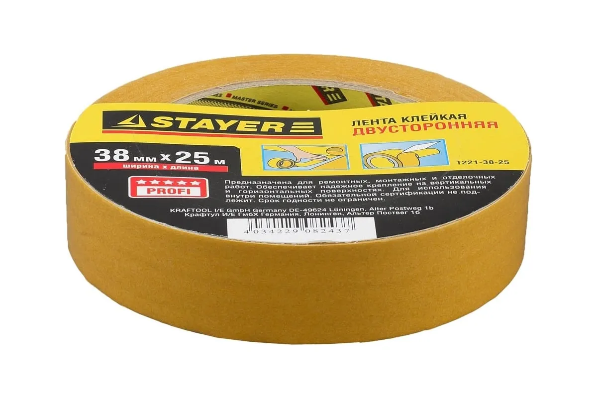 Двусторонняя клейкая лента STAYER "PROFI" 38ммх25м 1221-38-25 предназначена для крепления напольных покрытий, надежной фиксации табличек, элементов из бумаги, картона, пластика, резины и других материалов. Модель используют на производстве и в быту. Продукт подходит для быстрого создания защитных полотен из пленки во время малярных работ.